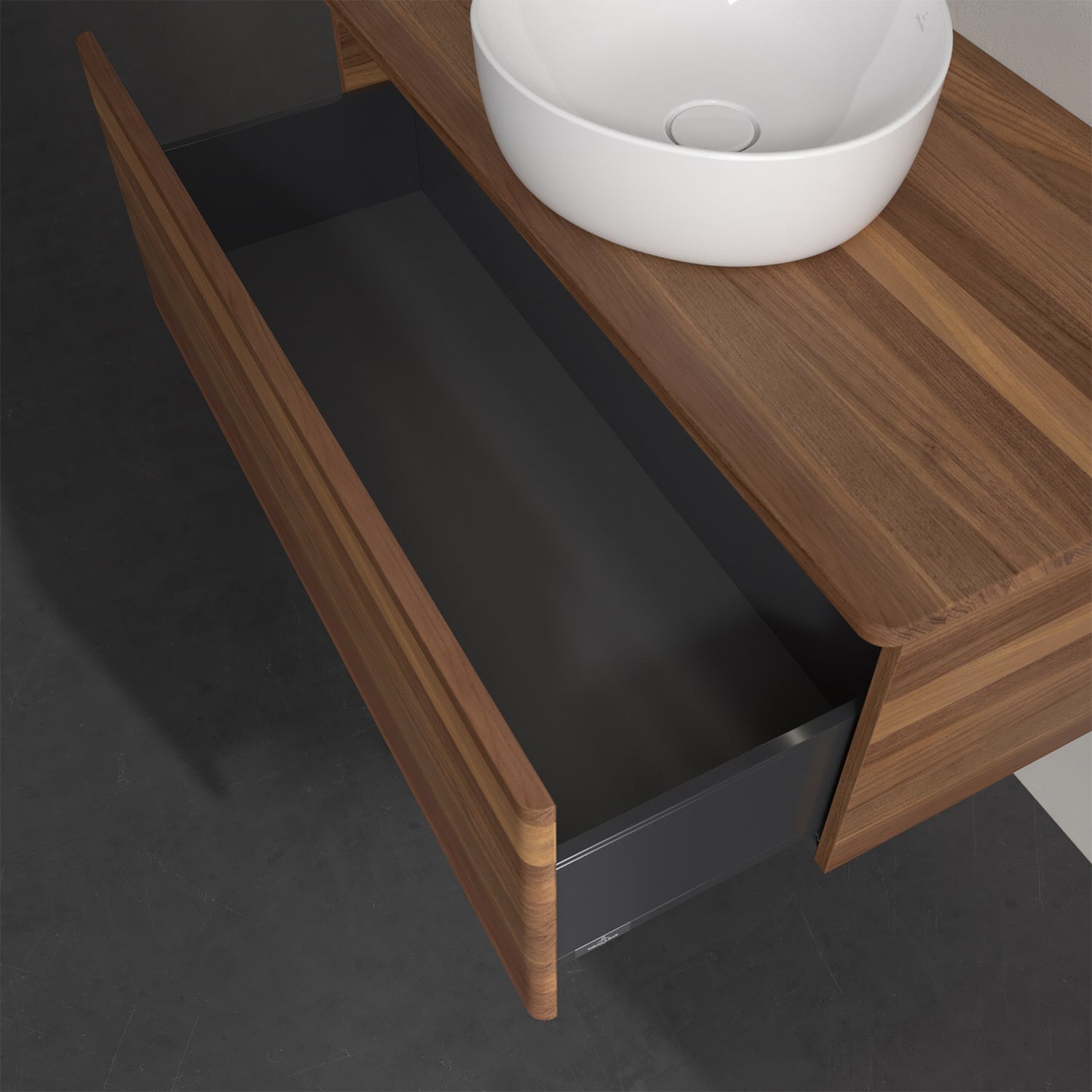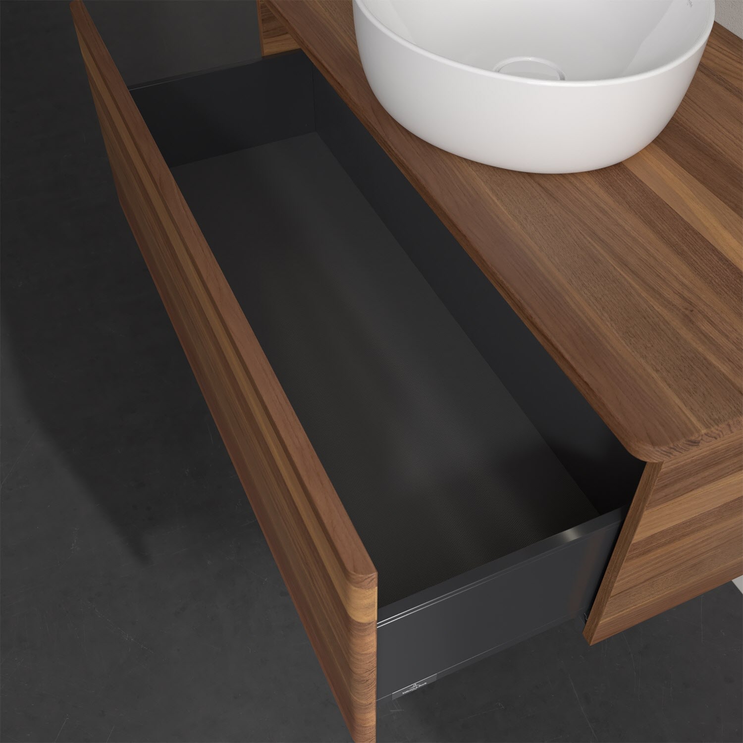 Mit dem wandhängenden Antao Waschtischunterschrank entscheidet man sich für eine hochwertige und praktische Stauraumlösung, die viel Freude bereitet. Die Funktionen sind besonders gut durchdacht: Im Inneren der beiden extra hohen und vollausziehbaren Auszüge können Handtücher, Kosmetik oder andere Pflegeprodukte dank des Antirutschbodens bequem aufbewahrt werden. Geöffnet wird das Möbel durch leichten Druck auf die grifflose Front. Der Clou: Dabei schaltet sich die warmweiße Auszugsbeleuchtung ein. Natürlich verfügen die Auszüge über eingebaute Dämpfer, die sie anschließend wieder sanft und leise schließen lassen. Auch auf der Waschtischplatte finden die wichtigsten Utensilien seitlich des Waschtischs genügend Platz. Optisch sorgt der Unterschrank von Villeroy & Boch mit seinen abgerundeten Kanten für ein modernes, gemütliches Ambiente. Für eine besonders leichte Pflege sorgt die mehrschichtig deckend lackierte Oberfläche. Bei der Ausführung in Massivholz wird dank des verarbeiteten Massivholzes jedes Möbel zu einem Unikat, das sich durch das lebendige Naturmaterial durch seine einzigartige Struktur und Maserung auszeichnet.