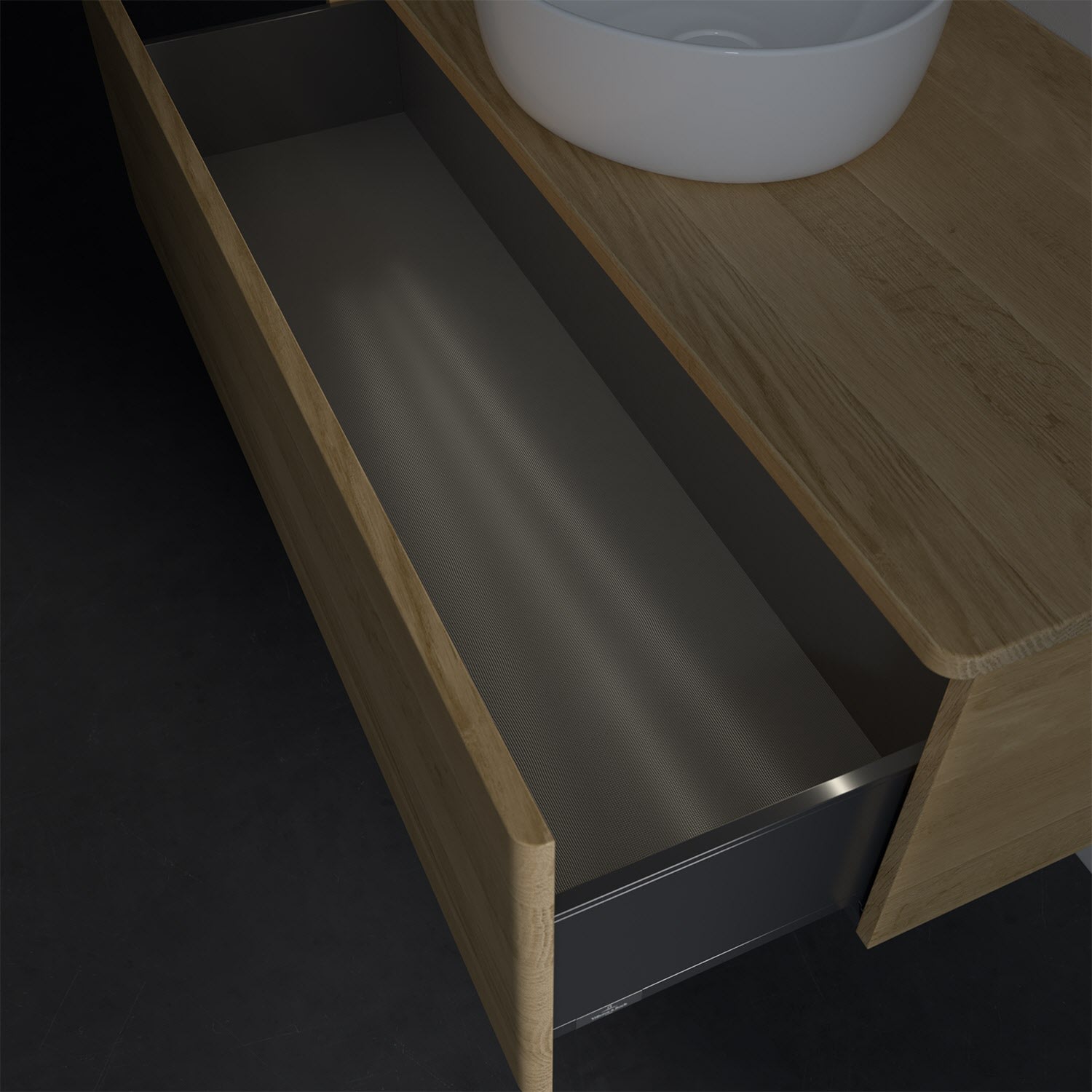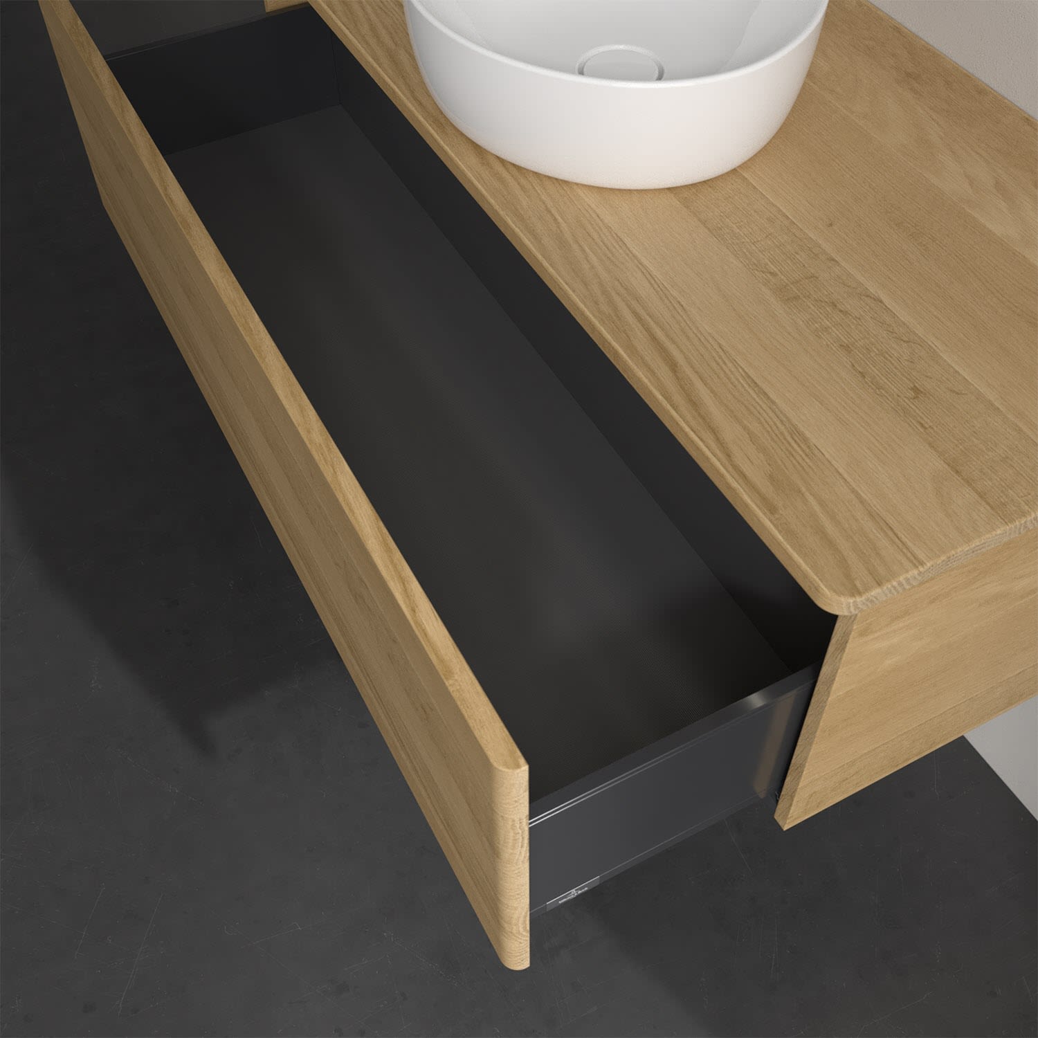 Der wandhängende Antao Waschtischunterschrank von Villeroy & Boch bietet nicht nur jede Menge Stauraum – er ist dank seines naturinspirierten Designs mit seinen abgerundeten Kanten auch noch besonders stilvoll und schafft eine gemütliche Atmosphäre im Badezimmer. Auf der Waschtischplatte bietet sich rechts und links neben dem Waschtisch viel Platz für Zahnbürstenbecher oder Seifenspender. Ein extra hoher Auszug bietet viel Platz, um alles Notwendige zu verstauen und Ordnung zu halten. Öffnen lässt er sich durch leichten Druck auf die grifflose Front. Dabei aktiviert sich übrigens die Auszugsbeleuchtung in angenehmem Warmweiß. Dank Vollauszug hat man immer alles im Blick und der Antirutschboden verhindert ein Umfallen oder Verrutschen der Gegenstände. Einfach clever! Für eine besonders leichte Pflege sorgt die mehrschichtig deckend lackierte Oberfläche. Bei der Ausführung in Massivholz wird dank des verarbeiteten Massivholzes jedes Möbel zu einem Unikat, das sich durch das lebendige Naturmaterial durch seine einzigartige Struktur und Maserung auszeichnet.