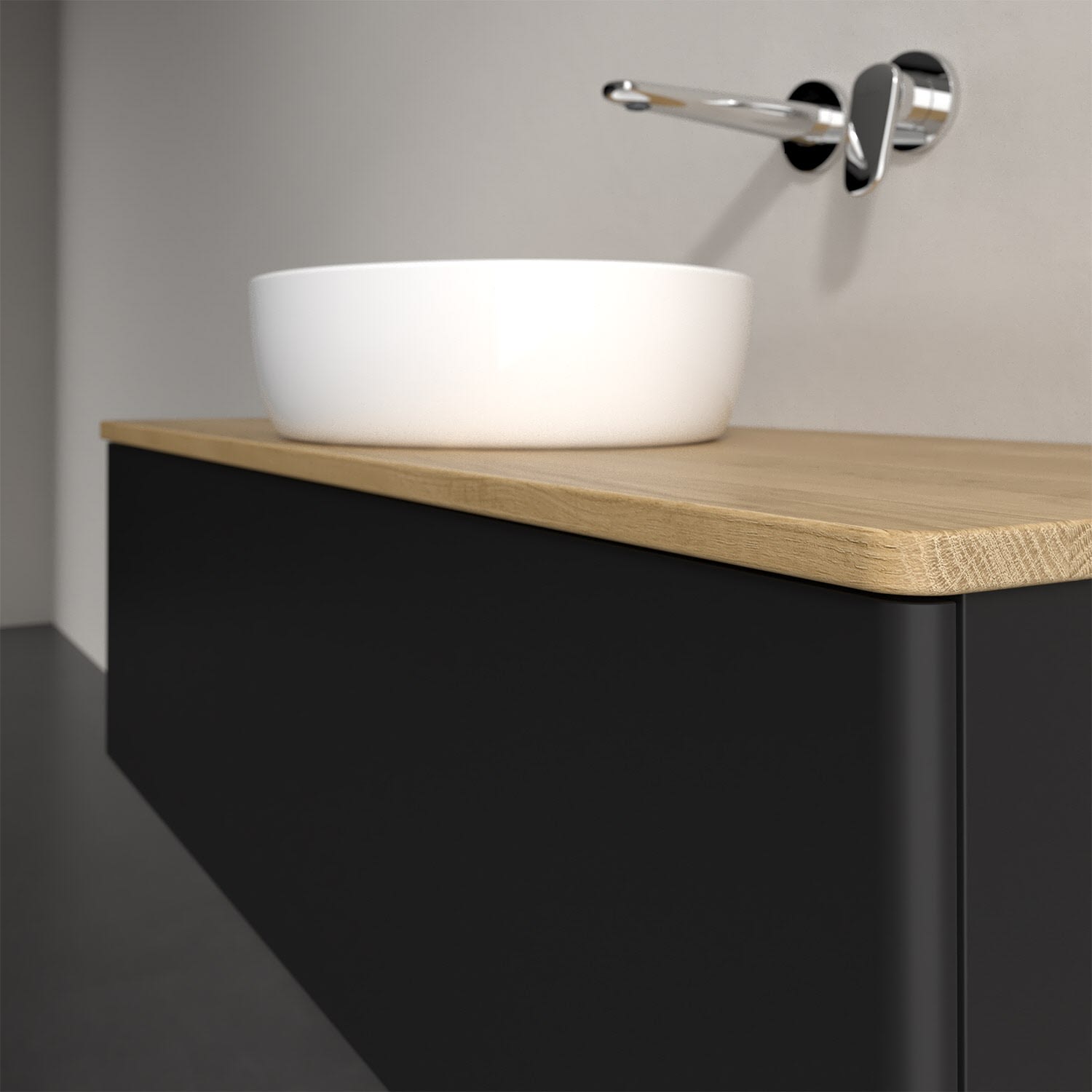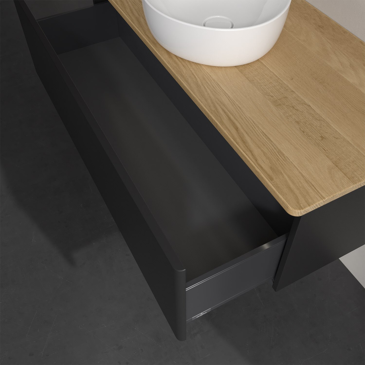 Der wandhängende Antao Waschtischunterschrank von Villeroy & Boch bietet nicht nur jede Menge Stauraum – er ist dank seines naturinspirierten Designs mit seinen abgerundeten Kanten auch noch besonders stilvoll und schafft eine gemütliche Atmosphäre im Badezimmer. Auf der Waschtischplatte bietet sich rechts und links neben dem Waschtisch viel Platz für Zahnbürstenbecher oder Seifenspender. Ein extra hoher Auszug bietet viel Platz, um alles Notwendige zu verstauen und Ordnung zu halten. Öffnen lässt er sich durch leichten Druck auf die grifflose Front. Dabei aktiviert sich übrigens die Auszugsbeleuchtung in angenehmem Warmweiß. Dank Vollauszug hat man immer alles im Blick und der Antirutschboden verhindert ein Umfallen oder Verrutschen der Gegenstände. Einfach clever! Für eine besonders leichte Pflege sorgt die mehrschichtig deckend lackierte Oberfläche. Bei der Ausführung in Massivholz wird dank des verarbeiteten Massivholzes jedes Möbel zu einem Unikat, das sich durch das lebendige Naturmaterial durch seine einzigartige Struktur und Maserung auszeichnet.