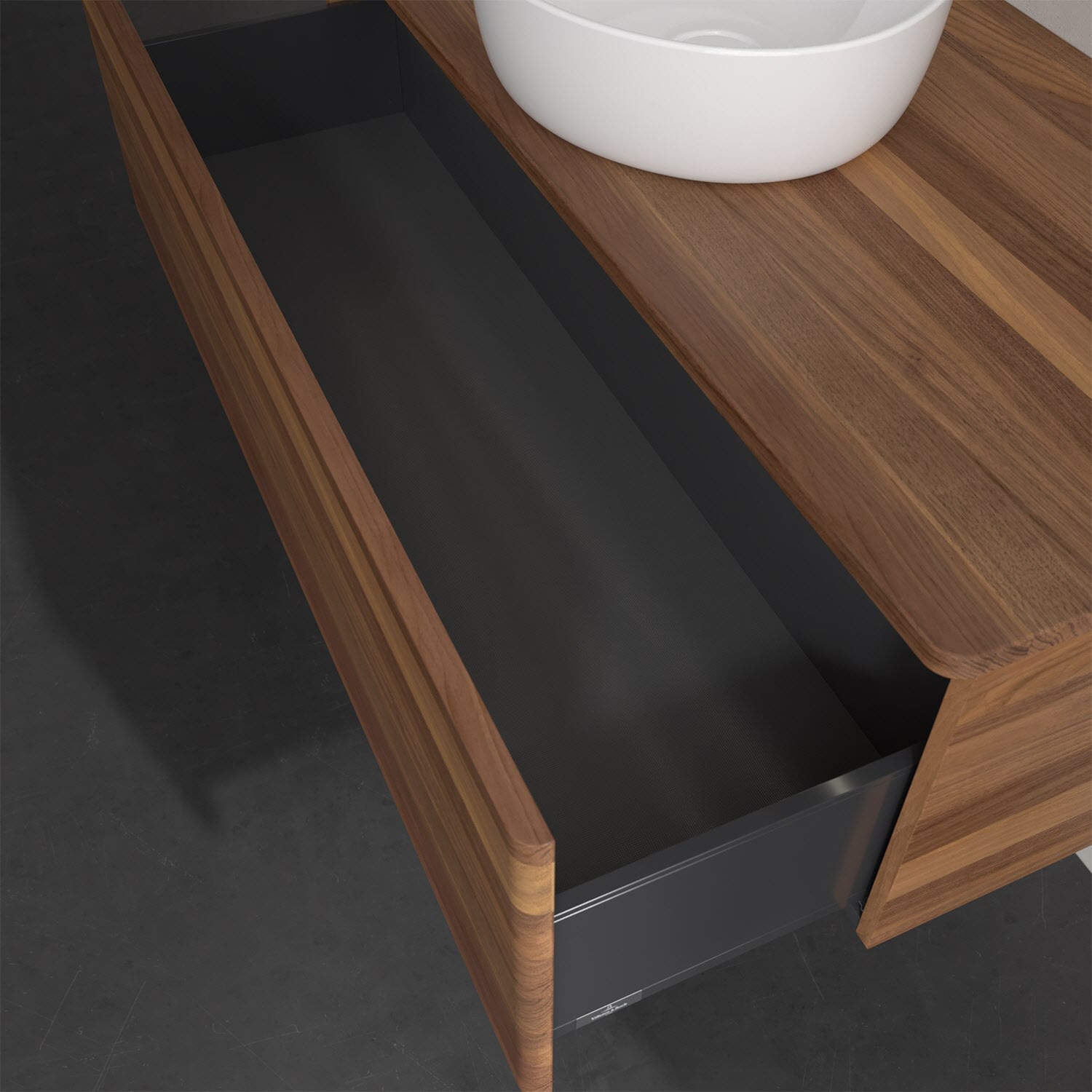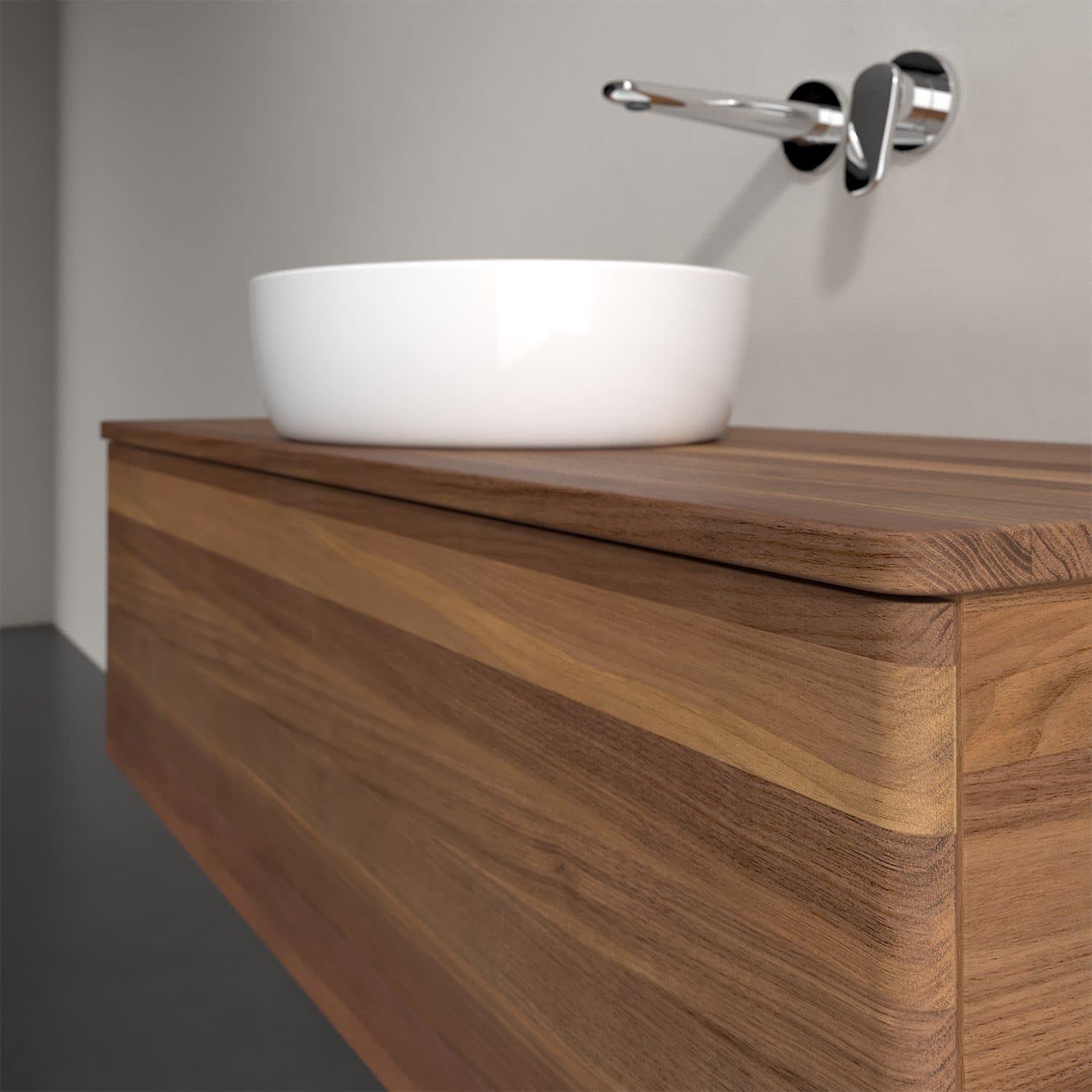 Der wandhängende Antao Waschtischunterschrank von Villeroy & Boch bietet nicht nur jede Menge Stauraum – er ist dank seines naturinspirierten Designs mit seinen abgerundeten Kanten auch noch besonders stilvoll und schafft eine gemütliche Atmosphäre im Badezimmer. Auf der Waschtischplatte bietet sich rechts und links neben dem Waschtisch viel Platz für Zahnbürstenbecher oder Seifenspender. Ein extra hoher Auszug bietet viel Platz, um alles Notwendige zu verstauen und Ordnung zu halten. Öffnen lässt er sich durch leichten Druck auf die grifflose Front. Dabei aktiviert sich übrigens die Auszugsbeleuchtung in angenehmem Warmweiß. Dank Vollauszug hat man immer alles im Blick und der Antirutschboden verhindert ein Umfallen oder Verrutschen der Gegenstände. Einfach clever! Für eine besonders leichte Pflege sorgt die mehrschichtig deckend lackierte Oberfläche. Bei der Ausführung in Massivholz wird dank des verarbeiteten Massivholzes jedes Möbel zu einem Unikat, das sich durch das lebendige Naturmaterial durch seine einzigartige Struktur und Maserung auszeichnet.