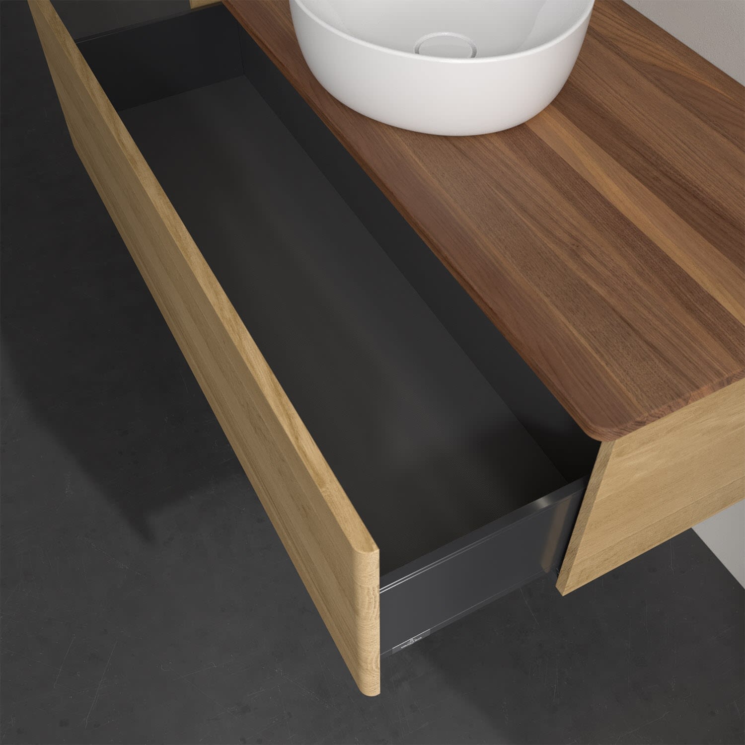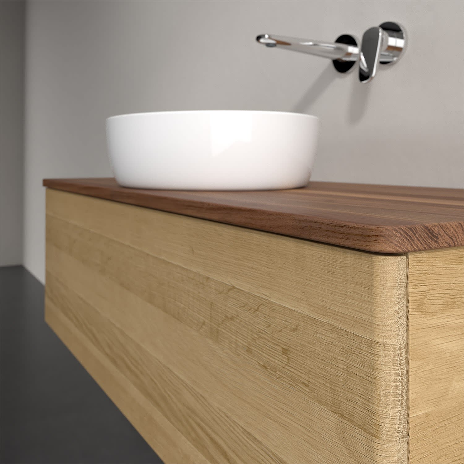 Der wandhängende Antao Waschtischunterschrank von Villeroy & Boch bietet nicht nur jede Menge Stauraum – er ist dank seines naturinspirierten Designs mit seinen abgerundeten Kanten auch noch besonders stilvoll und schafft eine gemütliche Atmosphäre im Badezimmer. Auf der Waschtischplatte bietet sich rechts und links neben dem Waschtisch viel Platz für Zahnbürstenbecher oder Seifenspender. Ein extra hoher Auszug bietet viel Platz, um alles Notwendige zu verstauen und Ordnung zu halten. Öffnen lässt er sich durch leichten Druck auf die grifflose Front. Dabei aktiviert sich übrigens die Auszugsbeleuchtung in angenehmem Warmweiß. Dank Vollauszug hat man immer alles im Blick und der Antirutschboden verhindert ein Umfallen oder Verrutschen der Gegenstände. Einfach clever! Für eine besonders leichte Pflege sorgt die mehrschichtig deckend lackierte Oberfläche. Bei der Ausführung in Massivholz wird dank des verarbeiteten Massivholzes jedes Möbel zu einem Unikat, das sich durch das lebendige Naturmaterial durch seine einzigartige Struktur und Maserung auszeichnet.