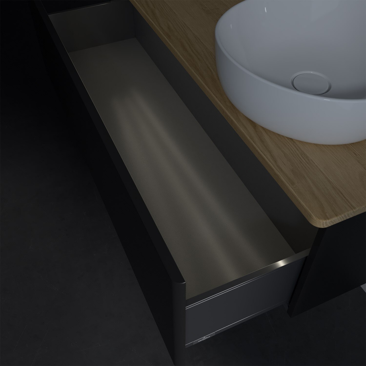 Der wandhängende Antao Waschtischunterschrank von Villeroy & Boch bietet nicht nur jede Menge Stauraum – er ist dank seines naturinspirierten Designs mit seinen abgerundeten Kanten auch noch besonders stilvoll und schafft eine gemütliche Atmosphäre im Badezimmer. Auf der Waschtischplatte bietet sich seitlich des Waschtischs viel Platz für Zahnbürstenbecher oder Seifenspender. Ein extra hoher Auszug bietet viel Platz, um alles Notwendige zu verstauen und Ordnung zu halten. Öffnen lässt er sich durch leichten Druck auf die grifflose Front. Dabei aktiviert sich übrigens die Auszugsbeleuchtung in angenehmem Warmweiß. Dank Vollauszug hat man immer alles im Blick und der Antirutschboden verhindert ein Umfallen oder Verrutschen der Gegenstände. Einfach clever! Für eine besonders leichte Pflege sorgt die mehrschichtig deckend lackierte Oberfläche. Bei der Ausführung in Massivholz wird dank des verarbeiteten Massivholzes jedes Möbel zu einem Unikat, das sich durch das lebendige Naturmaterial durch seine einzigartige Struktur und Maserung auszeichnet.