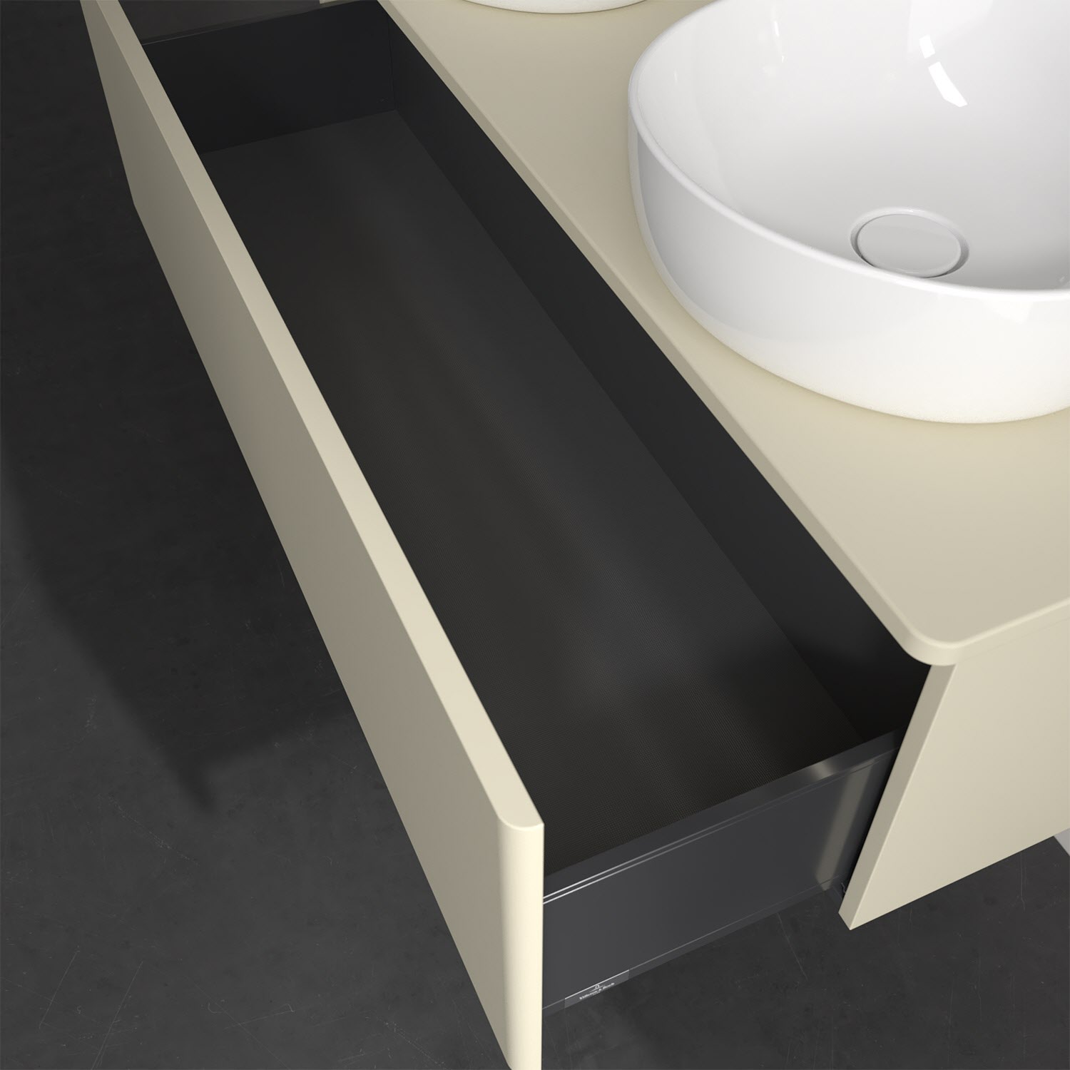 Der wandhängende Antao Waschtischunterschrank von Villeroy & Boch bietet nicht nur jede Menge Stauraum – er ist dank seines naturinspirierten Designs mit seinen abgerundeten Kanten auch noch besonders stilvoll und schafft eine gemütliche Atmosphäre im Badezimmer. Kombiniert mit zwei passenden Aufsatzwaschtischen also die ideale Wahl. Ein extra hoher Auszug bietet viel Platz, um alles Notwendige zu verstauen und Ordnung zu halten. Öffnen lässt er sich durch leichten Druck auf die grifflose Front. Dabei aktiviert sich übrigens die Auszugsbeleuchtung in angenehmem Warmweiß. Dank Vollauszug hat man immer alles im Blick und der Antirutschboden verhindert ein Umfallen oder Verrutschen der Gegenstände. Einfach clever! Für eine besonders leichte Pflege sorgt die mehrschichtig deckend lackierte Oberfläche.