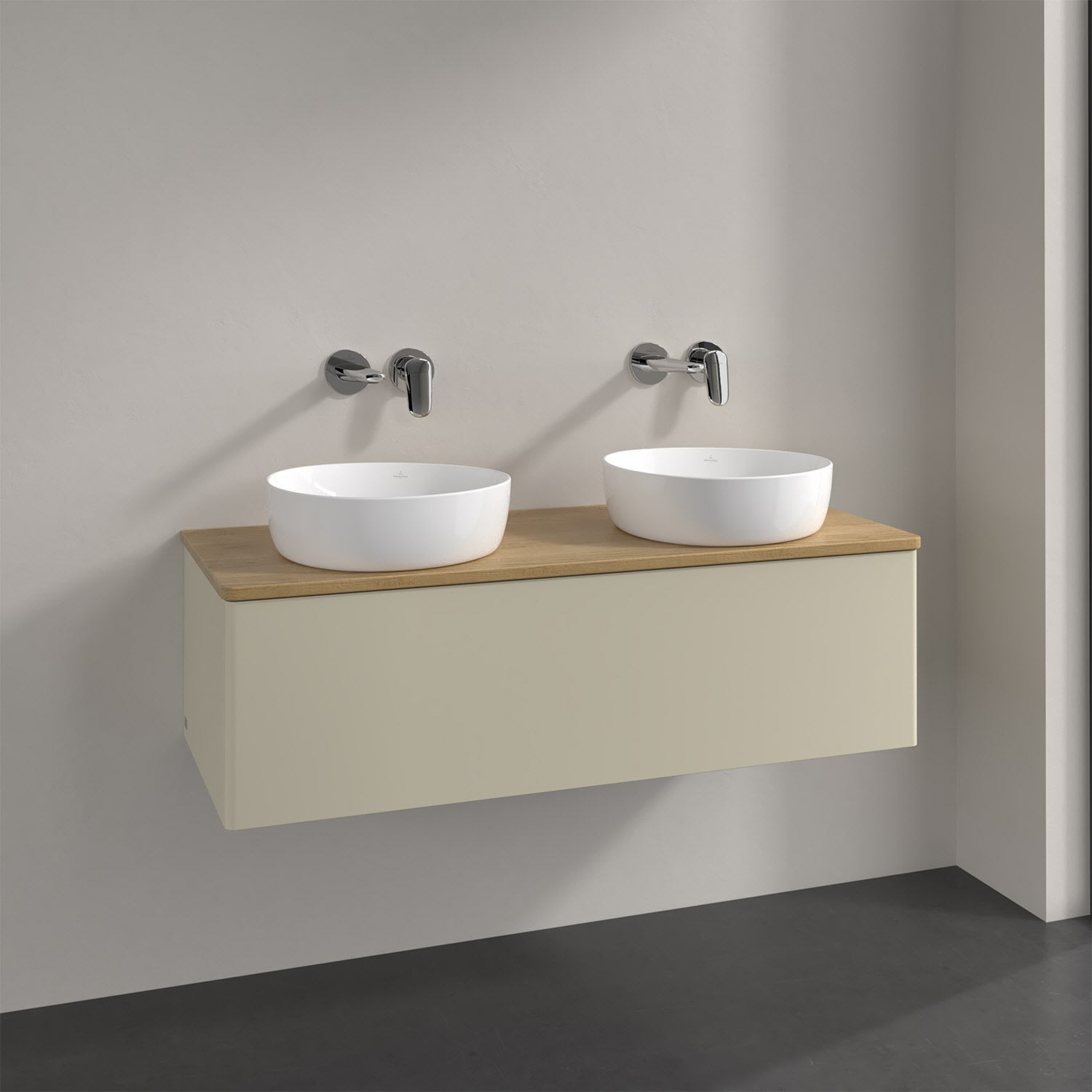 Der wandhängende Antao Waschtischunterschrank von Villeroy & Boch bietet nicht nur jede Menge Stauraum – er ist dank seines naturinspirierten Designs mit seinen abgerundeten Kanten auch noch besonders stilvoll und schafft eine gemütliche Atmosphäre im Badezimmer. Kombiniert mit zwei passenden Aufsatzwaschtischen also die ideale Wahl. Ein extra hoher Auszug bietet viel Platz, um alles Notwendige zu verstauen und Ordnung zu halten. Öffnen lässt er sich durch leichten Druck auf die grifflose Front. Dabei aktiviert sich übrigens die Auszugsbeleuchtung in angenehmem Warmweiß. Dank Vollauszug hat man immer alles im Blick und der Antirutschboden verhindert ein Umfallen oder Verrutschen der Gegenstände. Einfach clever! Für eine besonders leichte Pflege sorgt die mehrschichtig deckend lackierte Oberfläche. Bei der Ausführung in Massivholz wird dank des verarbeiteten Massivholzes jedes Möbel zu einem Unikat, das sich durch das lebendige Naturmaterial durch seine einzigartige Struktur und Maserung auszeichnet.
