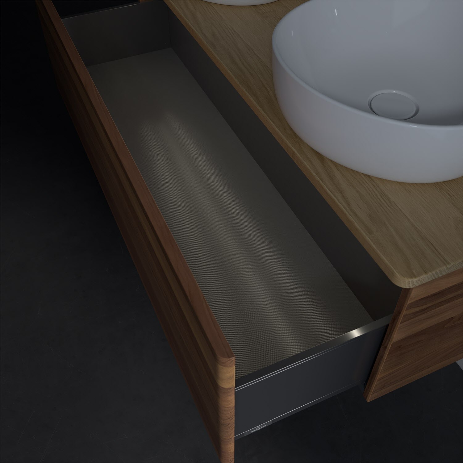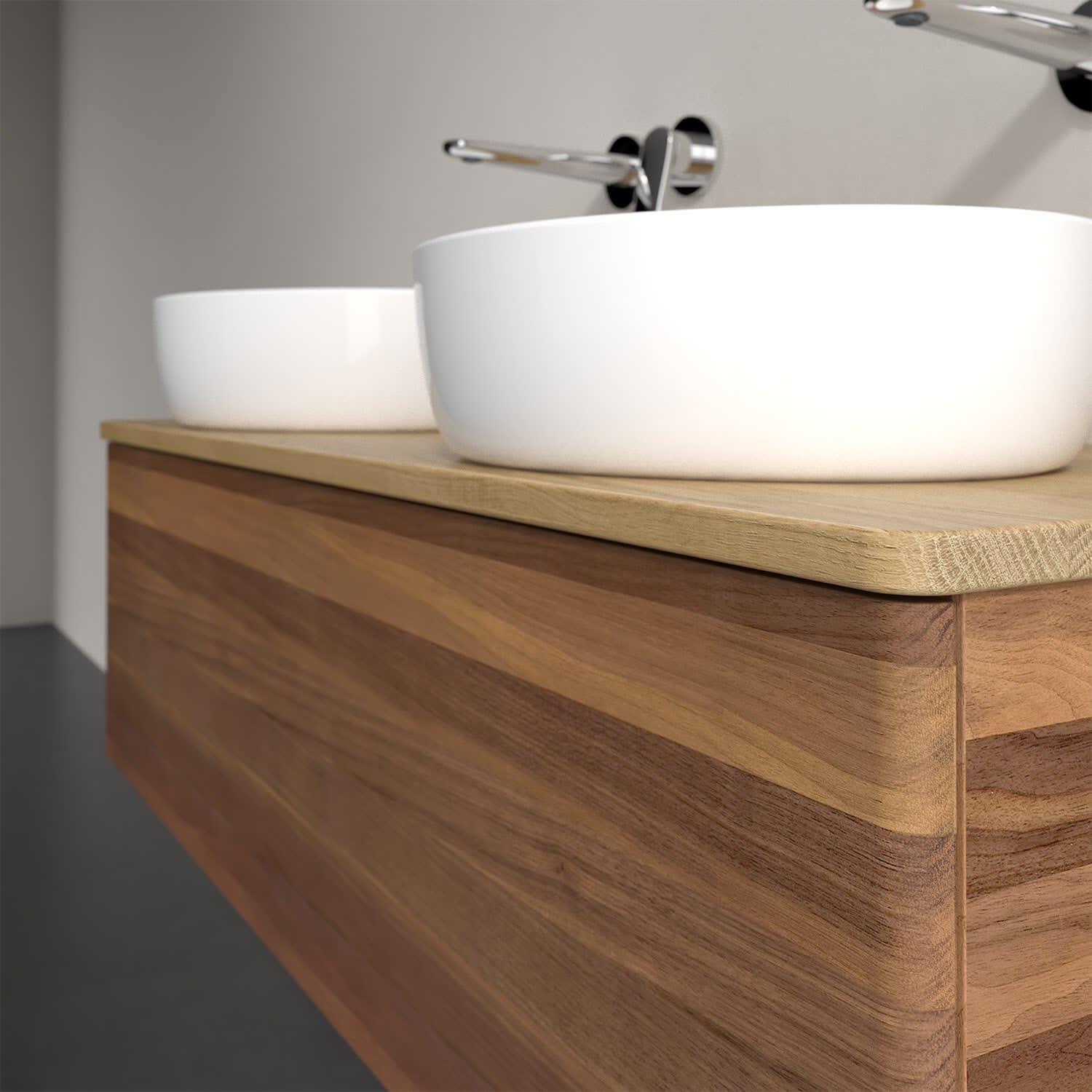 Der wandhängende Antao Waschtischunterschrank von Villeroy & Boch bietet nicht nur jede Menge Stauraum – er ist dank seines naturinspirierten Designs mit seinen abgerundeten Kanten auch noch besonders stilvoll und schafft eine gemütliche Atmosphäre im Badezimmer. Kombiniert mit zwei passenden Aufsatzwaschtischen also die ideale Wahl. Ein extra hoher Auszug bietet viel Platz, um alles Notwendige zu verstauen und Ordnung zu halten. Öffnen lässt er sich durch leichten Druck auf die grifflose Front. Dabei aktiviert sich übrigens die Auszugsbeleuchtung in angenehmem Warmweiß. Dank Vollauszug hat man immer alles im Blick und der Antirutschboden verhindert ein Umfallen oder Verrutschen der Gegenstände. Einfach clever! Für eine besonders leichte Pflege sorgt die mehrschichtig deckend lackierte Oberfläche. Bei der Ausführung in Massivholz wird dank des verarbeiteten Massivholzes jedes Möbel zu einem Unikat, das sich durch das lebendige Naturmaterial durch seine einzigartige Struktur und Maserung auszeichnet.