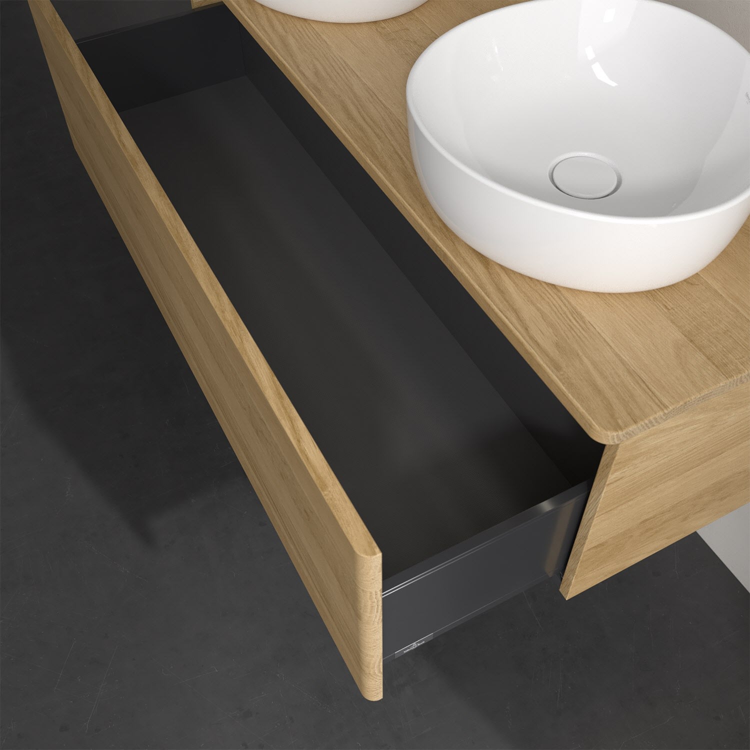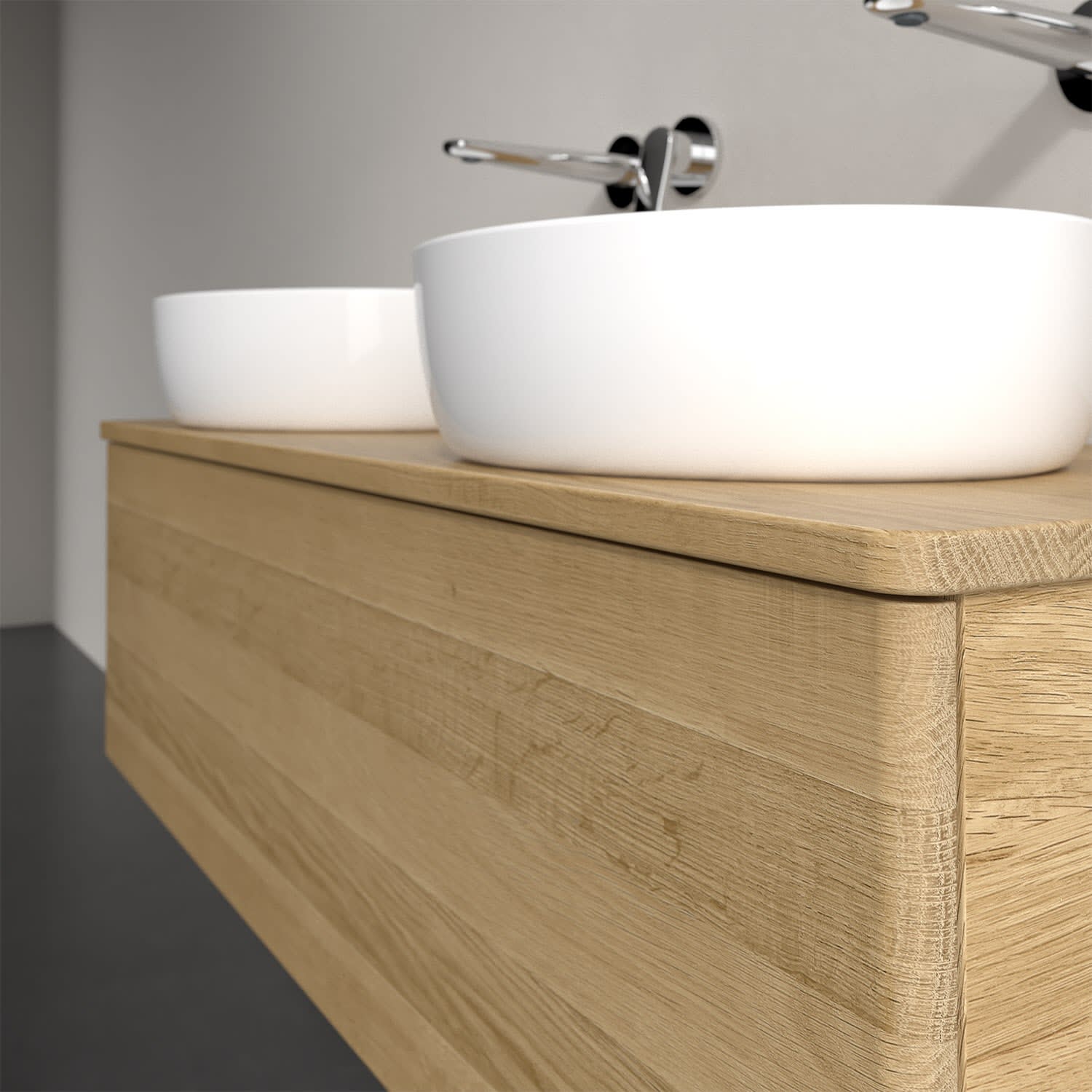 Der wandhängende Antao Waschtischunterschrank von Villeroy & Boch bietet nicht nur jede Menge Stauraum – er ist dank seines naturinspirierten Designs mit seinen abgerundeten Kanten auch noch besonders stilvoll und schafft eine gemütliche Atmosphäre im Badezimmer. Kombiniert mit zwei passenden Aufsatzwaschtischen also die ideale Wahl. Ein extra hoher Auszug bietet viel Platz, um alles Notwendige zu verstauen und Ordnung zu halten. Öffnen lässt er sich durch leichten Druck auf die grifflose Front. Dabei aktiviert sich übrigens die Auszugsbeleuchtung in angenehmem Warmweiß. Dank Vollauszug hat man immer alles im Blick und der Antirutschboden verhindert ein Umfallen oder Verrutschen der Gegenstände. Einfach clever! Für eine besonders leichte Pflege sorgt die mehrschichtig deckend lackierte Oberfläche. Bei der Ausführung in Massivholz wird dank des verarbeiteten Massivholzes jedes Möbel zu einem Unikat, das sich durch das lebendige Naturmaterial durch seine einzigartige Struktur und Maserung auszeichnet.