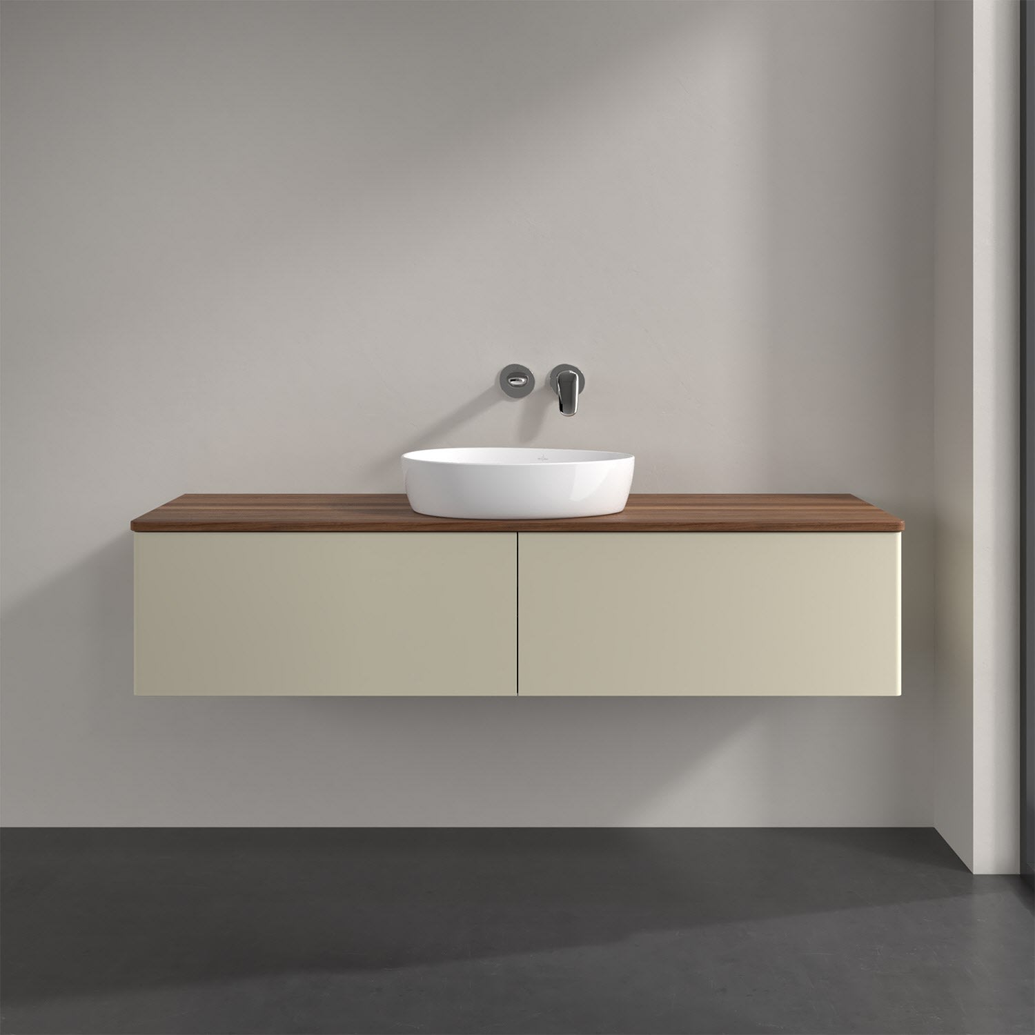 Der wandhängende Antao Waschtischunterschrank bietet mit seinen beiden extra hohen Auszügen und seiner erstaunlichen Größe viel Platz zum Verstauen von Utensilien im Badezimmer. Dank des mittig platzierten Aufsatzwaschtischs gibt es seitlich weiteren Platz für Handtücher, Seifenspender & Co. auf der Waschtischplatte. Inspiriert von der Natur überzeugt der Unterschrank auch optisch mit sanfter Formsprache und abgerundete Kanten. Die grifflosen Auszüge sind mit der Push-to-Open Funktion ausgestattet und verfügen über einen Antirutschboden, damit Utensilien sicher verstaut werden können. Den Überblick behält man dank der warmweißen Auszugsbeleuchtung, die sich automatisch beim Öffnen einschaltet. Mit seiner Vollauszug- und Selbsteinzug-Funktion ist der Schrank praktisch und leicht zu bedienen. Qualität von Villeroy & Boch! Für eine besonders leichte Pflege sorgt die mehrschichtig deckend lackierte Oberfläche. Bei der Ausführung in Massivholz wird dank des verarbeiteten Massivholzes jedes Möbel zu einem Unikat, das sich durch das lebendige Naturmaterial durch seine einzigartige Struktur und Maserung auszeichnet.