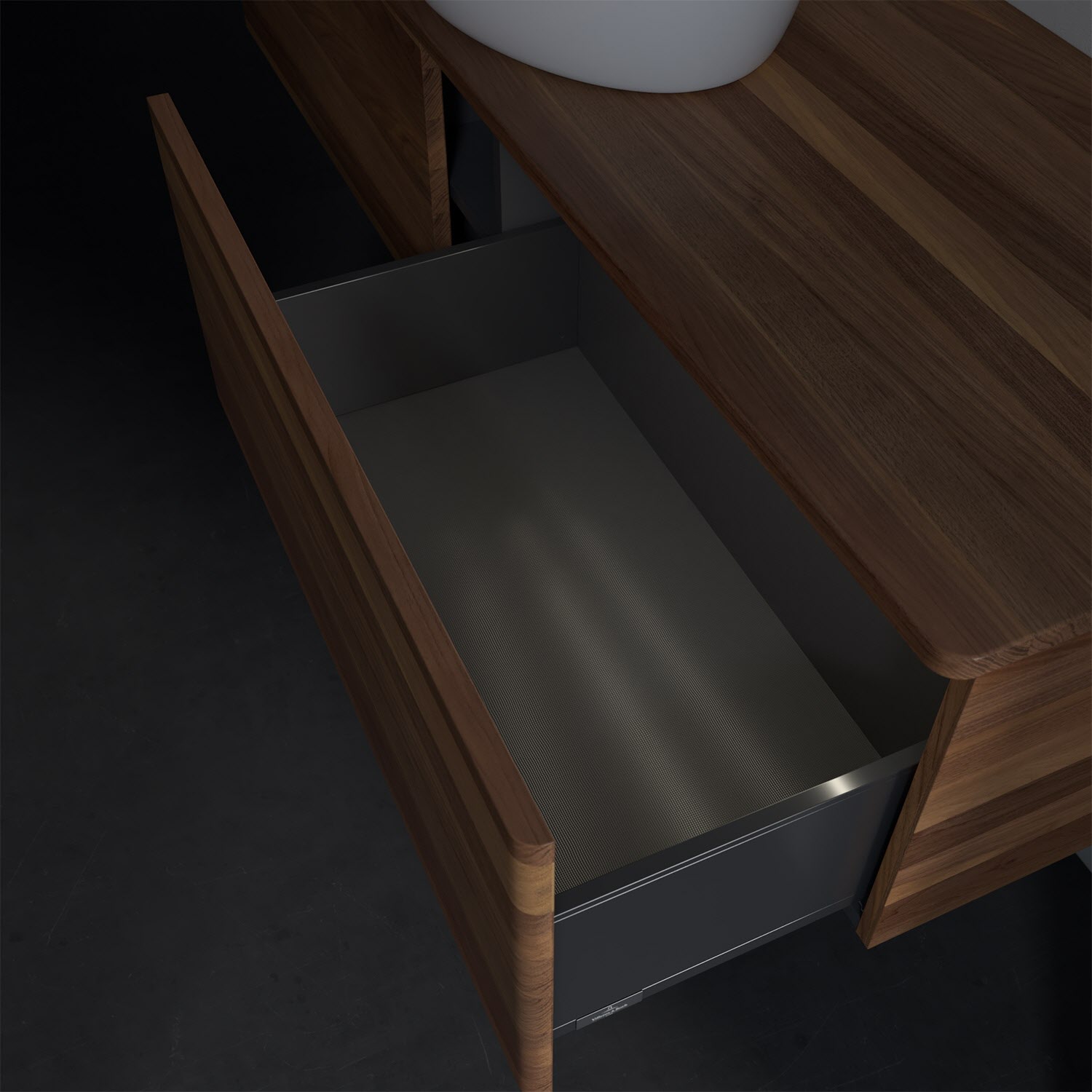 Der wandhängende Antao Waschtischunterschrank bietet mit seinen beiden extra hohen Auszügen und seiner erstaunlichen Größe viel Platz zum Verstauen von Utensilien im Badezimmer. Dank des mittig platzierten Aufsatzwaschtischs gibt es seitlich weiteren Platz für Handtücher, Seifenspender & Co. auf der Waschtischplatte. Inspiriert von der Natur überzeugt der Unterschrank auch optisch mit sanfter Formsprache und abgerundete Kanten. Die grifflosen Auszüge sind mit der Push-to-Open Funktion ausgestattet und verfügen über einen Antirutschboden, damit Utensilien sicher verstaut werden können. Den Überblick behält man dank der warmweißen Auszugsbeleuchtung, die sich automatisch beim Öffnen einschaltet. Mit seiner Vollauszug- und Selbsteinzug-Funktion ist der Schrank praktisch und leicht zu bedienen. Qualität von Villeroy & Boch! Für eine besonders leichte Pflege sorgt die mehrschichtig deckend lackierte Oberfläche. Bei der Ausführung in Massivholz wird dank des verarbeiteten Massivholzes jedes Möbel zu einem Unikat, das sich durch das lebendige Naturmaterial durch seine einzigartige Struktur und Maserung auszeichnet.