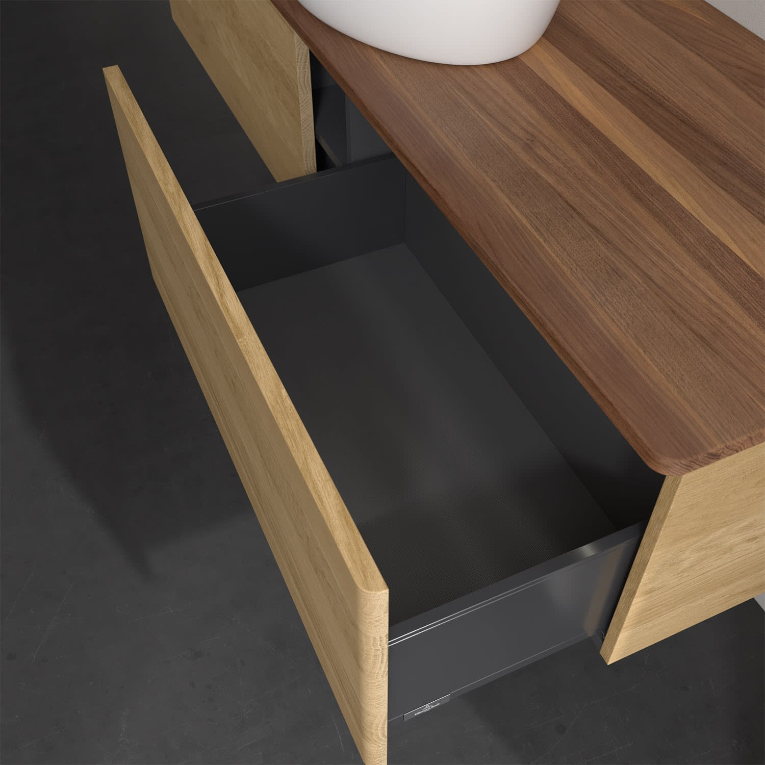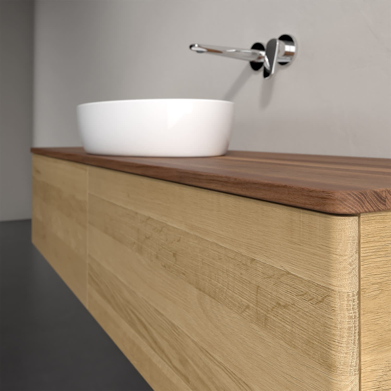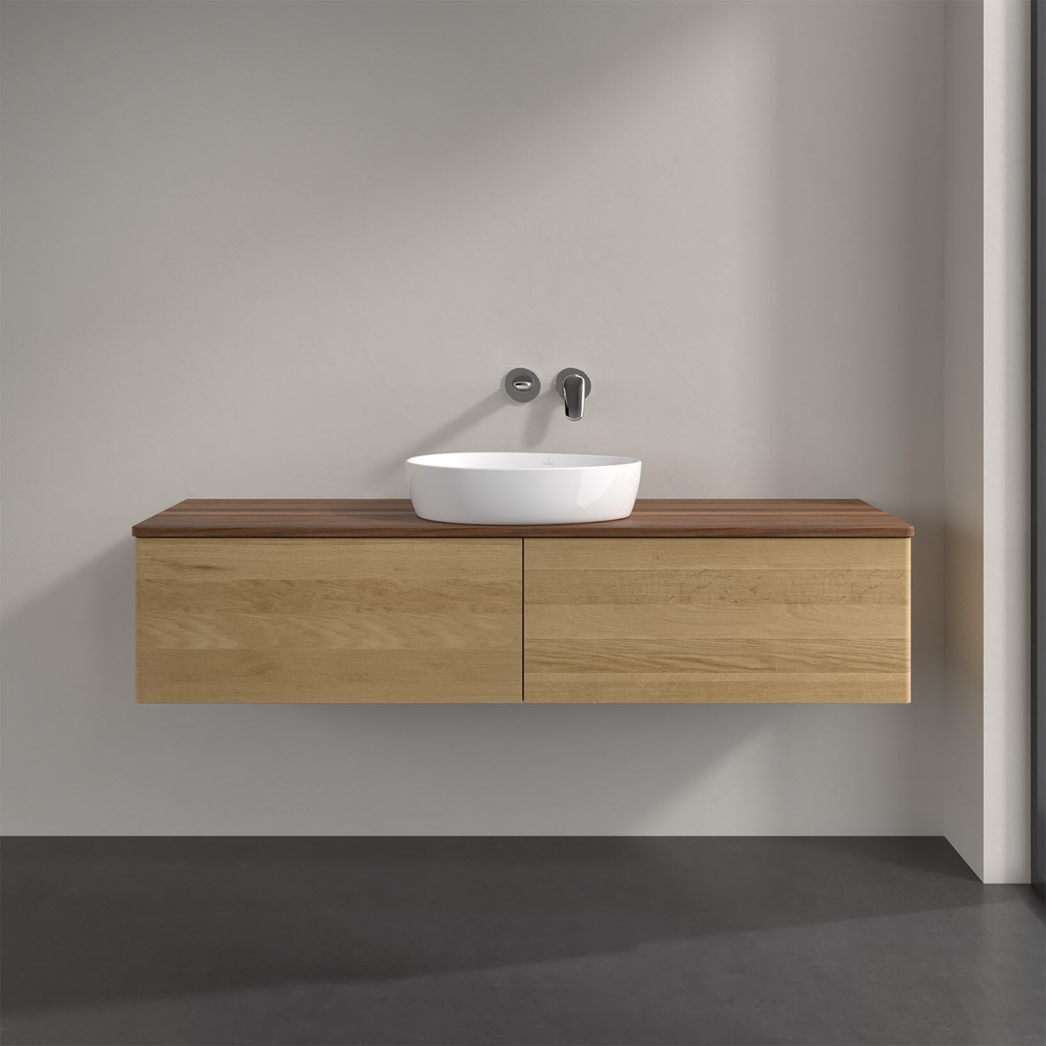 Der wandhängende Antao Waschtischunterschrank bietet mit seinen beiden extra hohen Auszügen und seiner erstaunlichen Größe viel Platz zum Verstauen von Utensilien im Badezimmer. Dank des mittig platzierten Aufsatzwaschtischs gibt es seitlich weiteren Platz für Handtücher, Seifenspender & Co. auf der Waschtischplatte. Inspiriert von der Natur überzeugt der Unterschrank auch optisch mit sanfter Formsprache und abgerundete Kanten. Die grifflosen Auszüge sind mit der Push-to-Open Funktion ausgestattet und verfügen über einen Antirutschboden, damit Utensilien sicher verstaut werden können. Den Überblick behält man dank der warmweißen Auszugsbeleuchtung, die sich automatisch beim Öffnen einschaltet. Mit seiner Vollauszug- und Selbsteinzug-Funktion ist der Schrank praktisch und leicht zu bedienen. Qualität von Villeroy & Boch! Für eine besonders leichte Pflege sorgt die mehrschichtig deckend lackierte Oberfläche. Bei der Ausführung in Massivholz wird dank des verarbeiteten Massivholzes jedes Möbel zu einem Unikat, das sich durch das lebendige Naturmaterial durch seine einzigartige Struktur und Maserung auszeichnet.