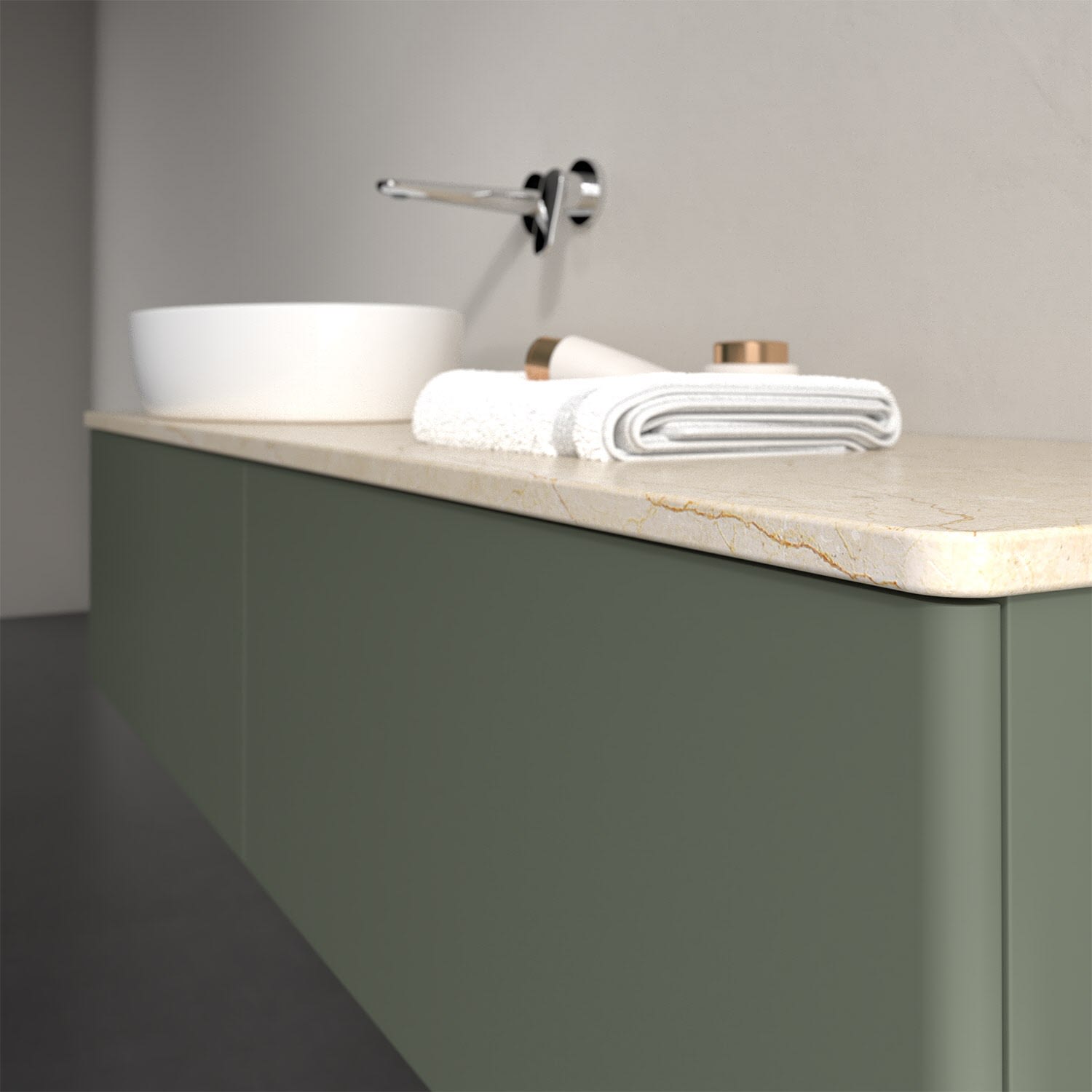 Der wandhängende Antao Waschtischunterschrank bietet mit seinen beiden extra hohen Auszügen und seiner erstaunlichen Größe viel Platz zum Verstauen von Utensilien im Badezimmer. Dank des seitlich platzierten Aufsatzwaschtischs gibt es daneben weiteren Platz für Handtücher, Seifenspender & Co. auf der Waschtischplatte. Inspiriert von der Natur überzeugt der Unterschrank auch optisch mit sanfter Formsprache und abgerundete Kanten. Die grifflosen Auszüge sind mit der Push-to-Open Funktion ausgestattet und verfügen über einen Antirutschboden, damit Utensilien sicher verstaut werden können. Den Überblick behält man dank der warmweißen Auszugsbeleuchtung, die sich automatisch beim Öffnen einschaltet. Mit seiner Vollauszug- und Selbsteinzug-Funktion ist der Schrank praktisch und leicht zu bedienen. Qualität von Villeroy & Boch! Für eine besonders leichte Pflege sorgt die mehrschichtig deckend lackierte Oberfläche. Bei der Ausführung in Massivholz wird dank des verarbeiteten Massivholzes jedes Möbel zu einem Unikat, das sich durch das lebendige Naturmaterial durch seine einzigartige Struktur und Maserung auszeichnet.