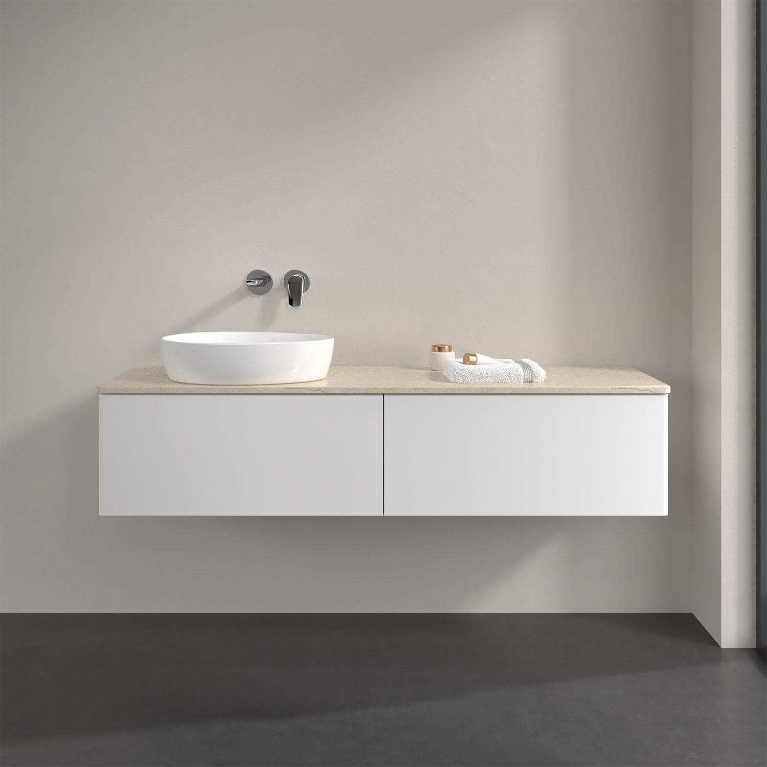 Für diesen Waschbeckenunterschrank stehen Ihnen Aufsatzwaschtische aus verschiedenen Serien zur Verfügung (siehe "Passliste" unter Downloads). Ein ausgewähltes Beispiel finden Sie im Zubehör. Den Waschtisch bitte separat mitbestellen.