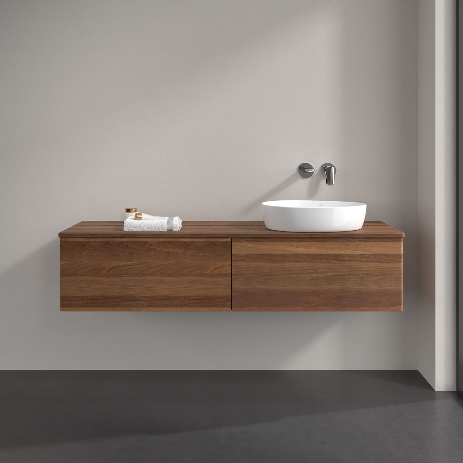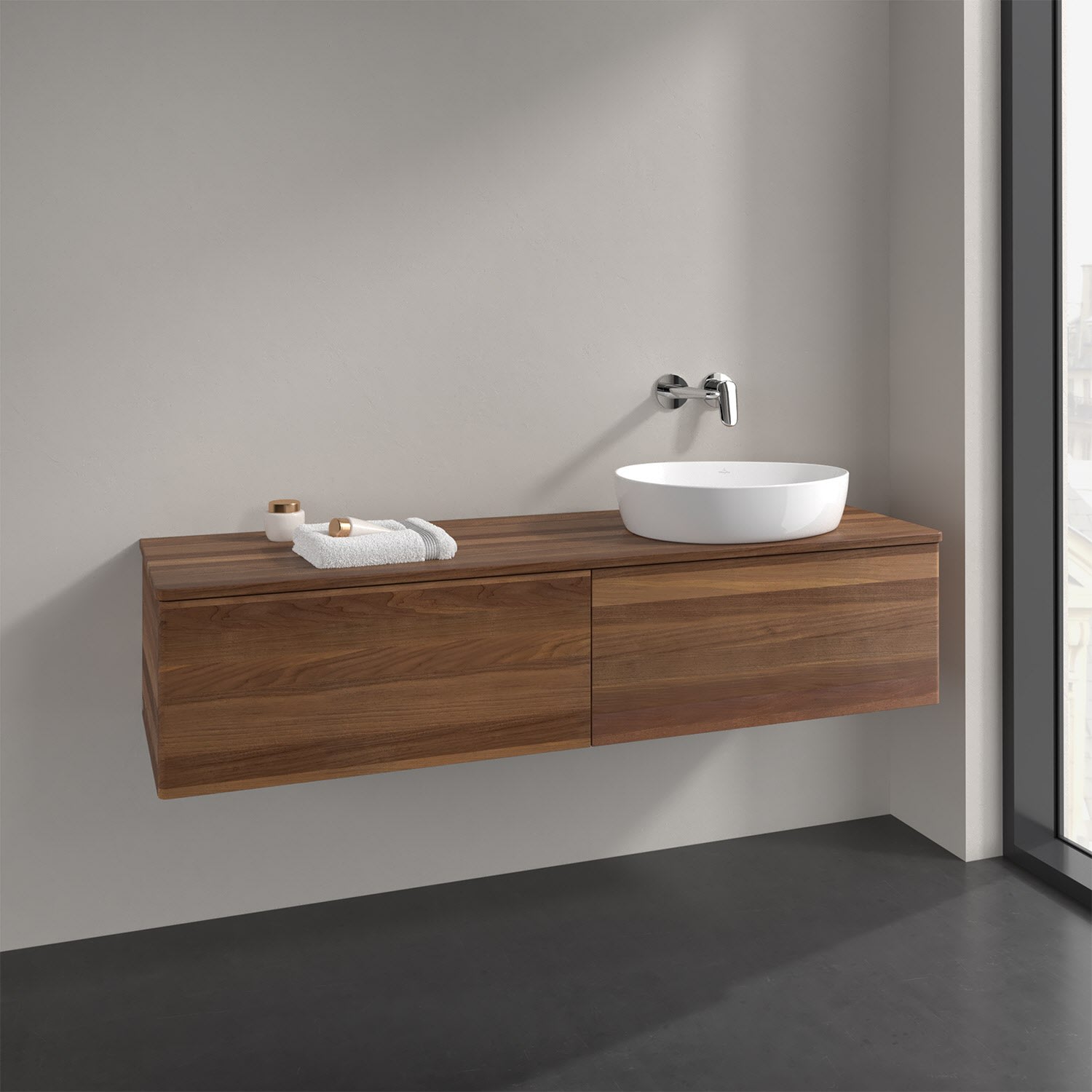 Der wandhängende Antao Waschtischunterschrank bietet mit seinen beiden extra hohen Auszügen und seiner erstaunlichen Größe viel Platz zum Verstauen von Utensilien im Badezimmer. Dank des seitlich platzierten Aufsatzwaschtischs gibt es daneben weiteren Platz für Handtücher, Seifenspender & Co. auf der Waschtischplatte. Inspiriert von der Natur überzeugt der Unterschrank auch optisch mit sanfter Formsprache und abgerundete Kanten. Die grifflosen Auszüge sind mit der Push-to-Open Funktion ausgestattet und verfügen über einen Antirutschboden, damit Utensilien sicher verstaut werden können. Den Überblick behält man dank der warmweißen Auszugsbeleuchtung, die sich automatisch beim Öffnen einschaltet. Mit seiner Vollauszug- und Selbsteinzug-Funktion ist der Schrank praktisch und leicht zu bedienen. Qualität von Villeroy & Boch! Für eine besonders leichte Pflege sorgt die mehrschichtig deckend lackierte Oberfläche. Bei der Ausführung in Massivholz wird dank des verarbeiteten Massivholzes jedes Möbel zu einem Unikat, das sich durch das lebendige Naturmaterial durch seine einzigartige Struktur und Maserung auszeichnet.