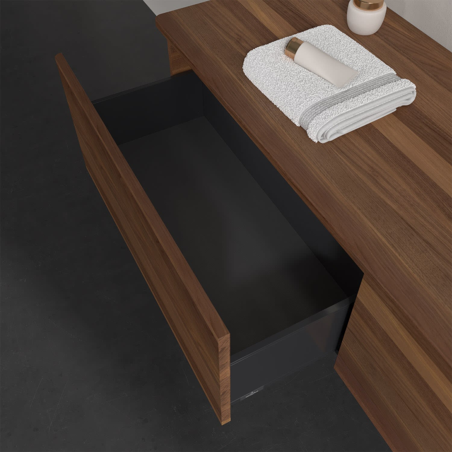 - kein Umfallen oder Verrutschen von Pflegeprodukten in den Schubladen dank rutschhemmendem Boden