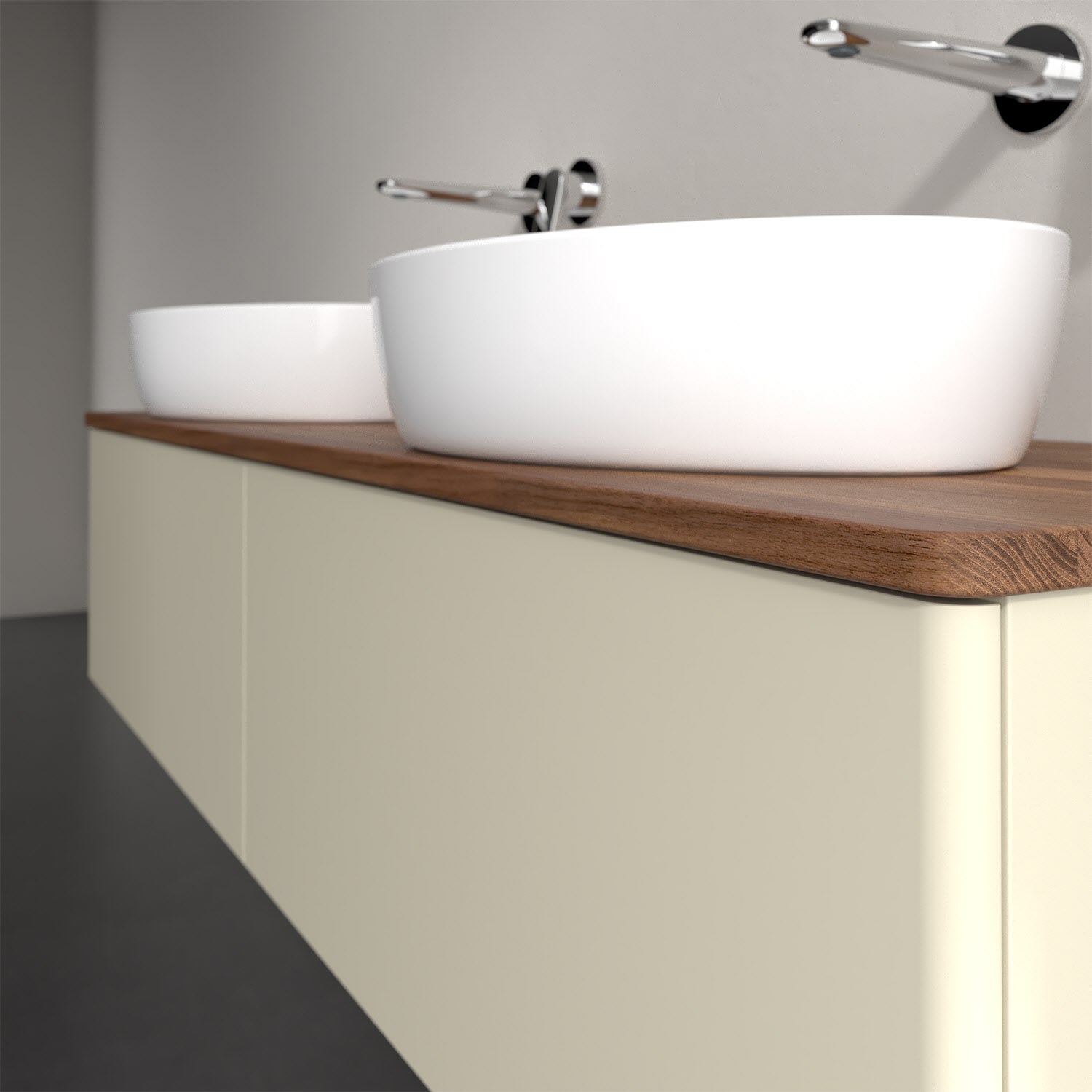 Der wandhängende Antao Waschtischunterschrank für zwei Aufsatzwaschtische bietet mit seinen beiden extra hohen Auszügen und seiner erstaunlichen Größe viel Platz zum Verstauen von Utensilien im Badezimmer. Inspiriert von der Natur überzeugt der Unterschrank auch optisch mit sanfter Formsprache und abgerundete Kanten. Die grifflosen Auszüge sind mit der Push-to-Open Funktion ausgestattet und verfügen über einen Antirutschboden, damit Utensilien sicher verstaut werden können. Den Überblick behält man dank der warmweißen Auszugsbeleuchtung, die sich automatisch beim Öffnen einschaltet. Mit seiner Vollauszug- und Selbsteinzug-Funktion ist der Schrank praktisch und leicht zu bedienen. Qualität von Villeroy & Boch! Für eine besonders leichte Pflege sorgt die mehrschichtig deckend lackierte Oberfläche. Bei der Ausführung in Massivholz wird dank des verarbeiteten Massivholzes jedes Möbel zu einem Unikat, das sich durch das lebendige Naturmaterial durch seine einzigartige Struktur und Maserung auszeichnet.