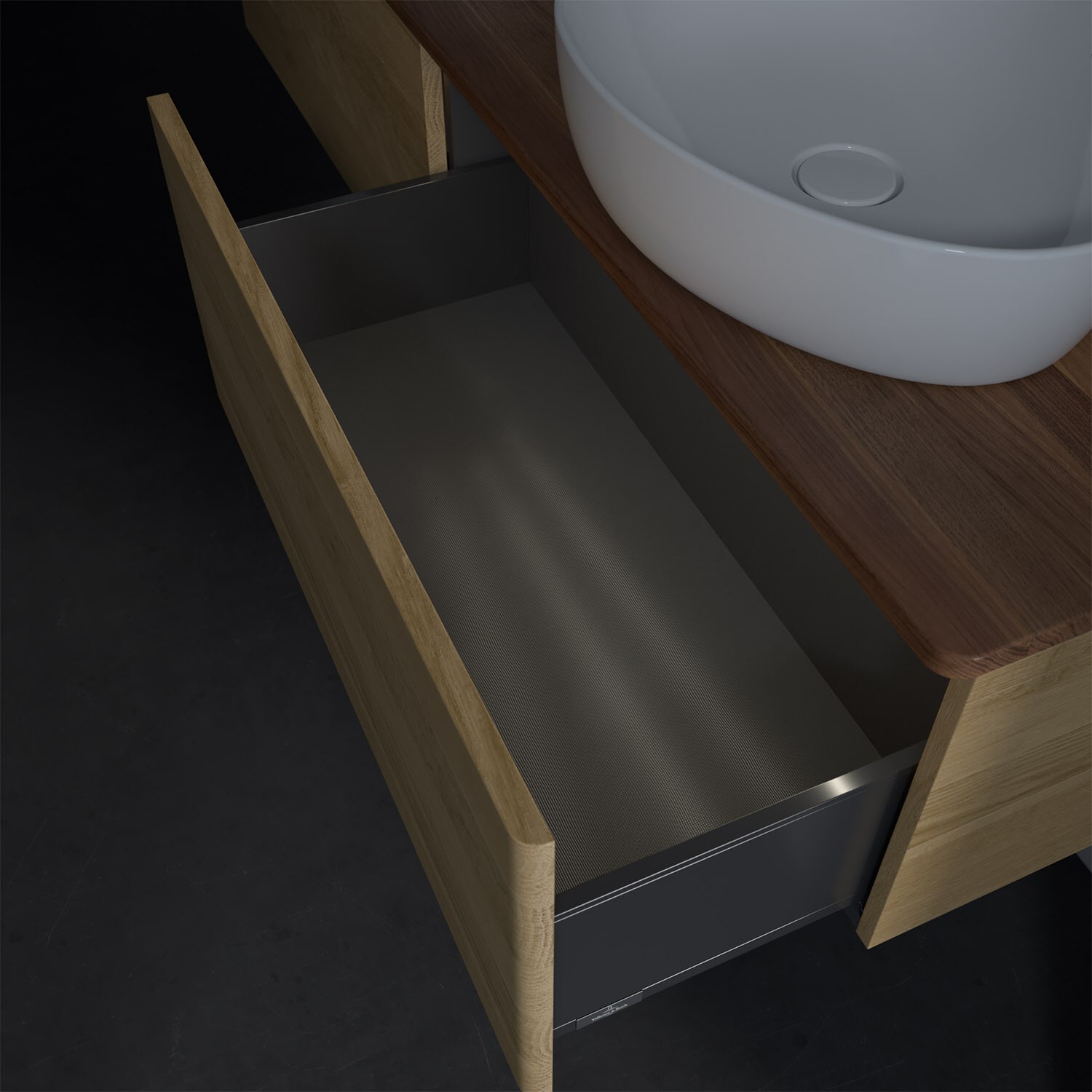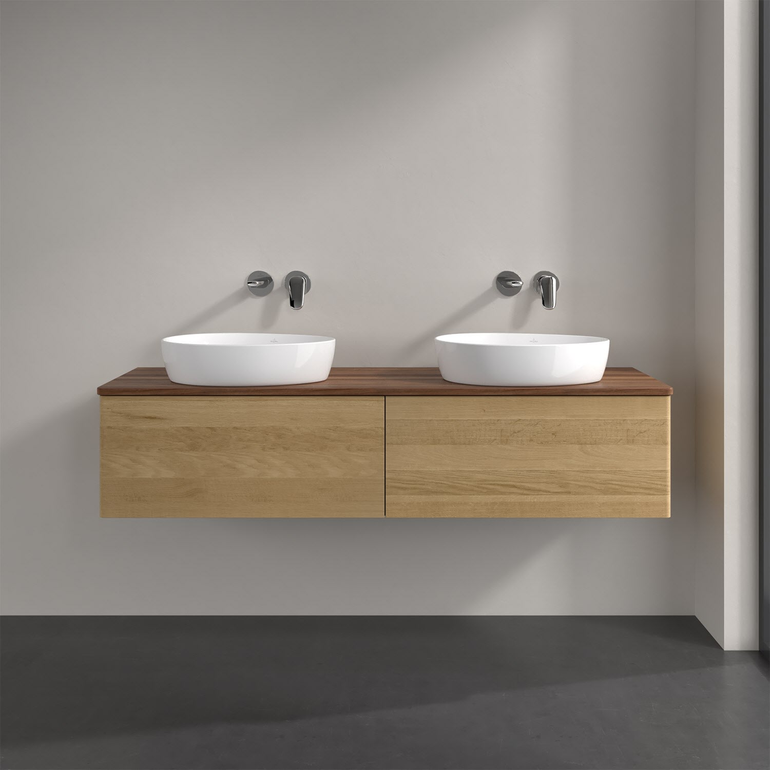 Der wandhängende Antao Waschtischunterschrank für zwei Aufsatzwaschtische bietet mit seinen beiden extra hohen Auszügen und seiner erstaunlichen Größe viel Platz zum Verstauen von Utensilien im Badezimmer. Inspiriert von der Natur überzeugt der Unterschrank auch optisch mit sanfter Formsprache und abgerundete Kanten. Die grifflosen Auszüge sind mit der Push-to-Open Funktion ausgestattet und verfügen über einen Antirutschboden, damit Utensilien sicher verstaut werden können. Den Überblick behält man dank der warmweißen Auszugsbeleuchtung, die sich automatisch beim Öffnen einschaltet. Mit seiner Vollauszug- und Selbsteinzug-Funktion ist der Schrank praktisch und leicht zu bedienen. Qualität von Villeroy & Boch! Für eine besonders leichte Pflege sorgt die mehrschichtig deckend lackierte Oberfläche. Bei der Ausführung in Massivholz wird dank des verarbeiteten Massivholzes jedes Möbel zu einem Unikat, das sich durch das lebendige Naturmaterial durch seine einzigartige Struktur und Maserung auszeichnet.