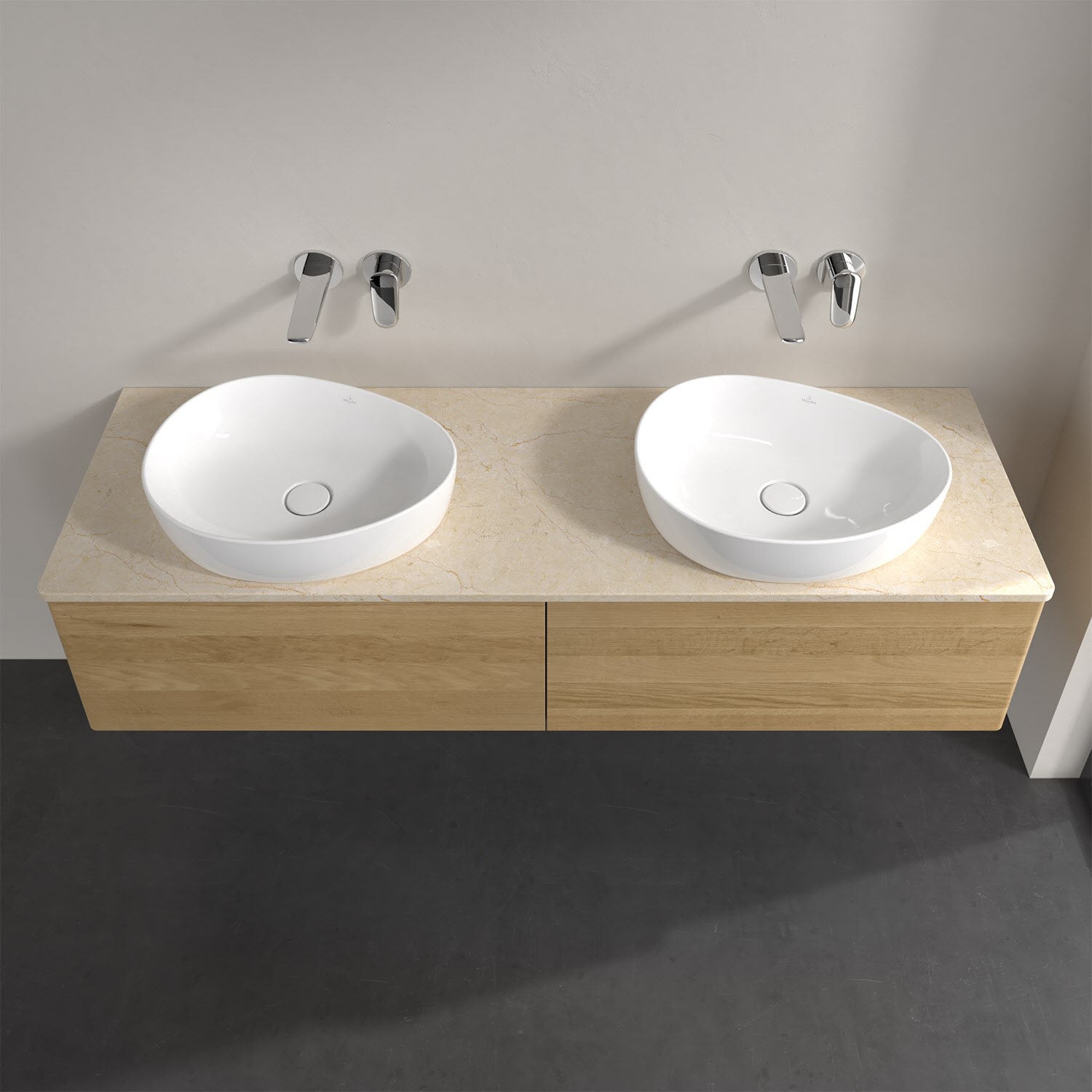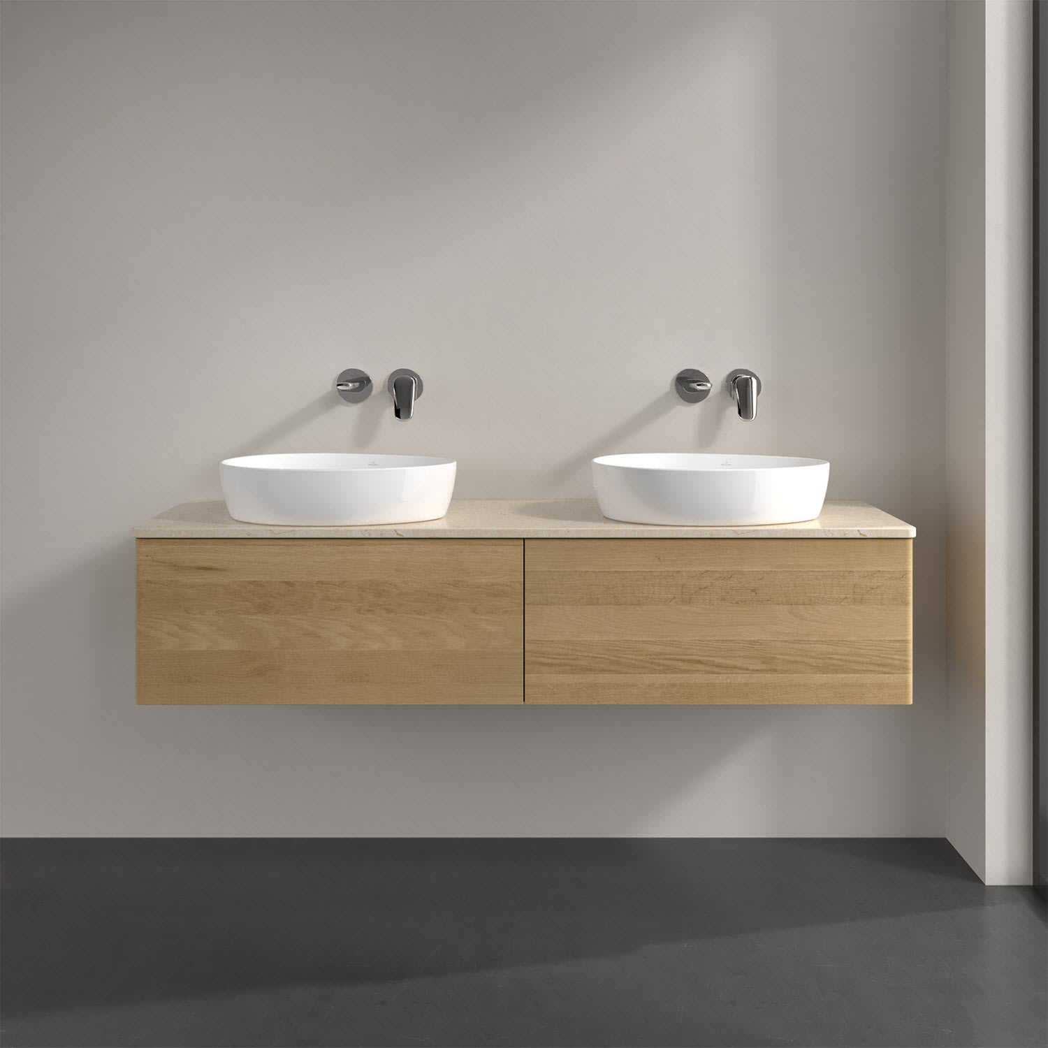 Der wandhängende Antao Waschtischunterschrank für zwei Aufsatzwaschtische bietet mit seinen beiden extra hohen Auszügen und seiner erstaunlichen Größe viel Platz zum Verstauen von Utensilien im Badezimmer. Inspiriert von der Natur überzeugt der Unterschrank auch optisch mit sanfter Formsprache und abgerundete Kanten. Die grifflosen Auszüge sind mit der Push-to-Open Funktion ausgestattet und verfügen über einen Antirutschboden, damit Utensilien sicher verstaut werden können. Den Überblick behält man dank der warmweißen Auszugsbeleuchtung, die sich automatisch beim Öffnen einschaltet. Mit seiner Vollauszug- und Selbsteinzug-Funktion ist der Schrank praktisch und leicht zu bedienen. Qualität von Villeroy & Boch! Für eine besonders leichte Pflege sorgt die mehrschichtig deckend lackierte Oberfläche. Bei der Ausführung in Massivholz wird dank des verarbeiteten Massivholzes jedes Möbel zu einem Unikat, das sich durch das lebendige Naturmaterial durch seine einzigartige Struktur und Maserung auszeichnet.