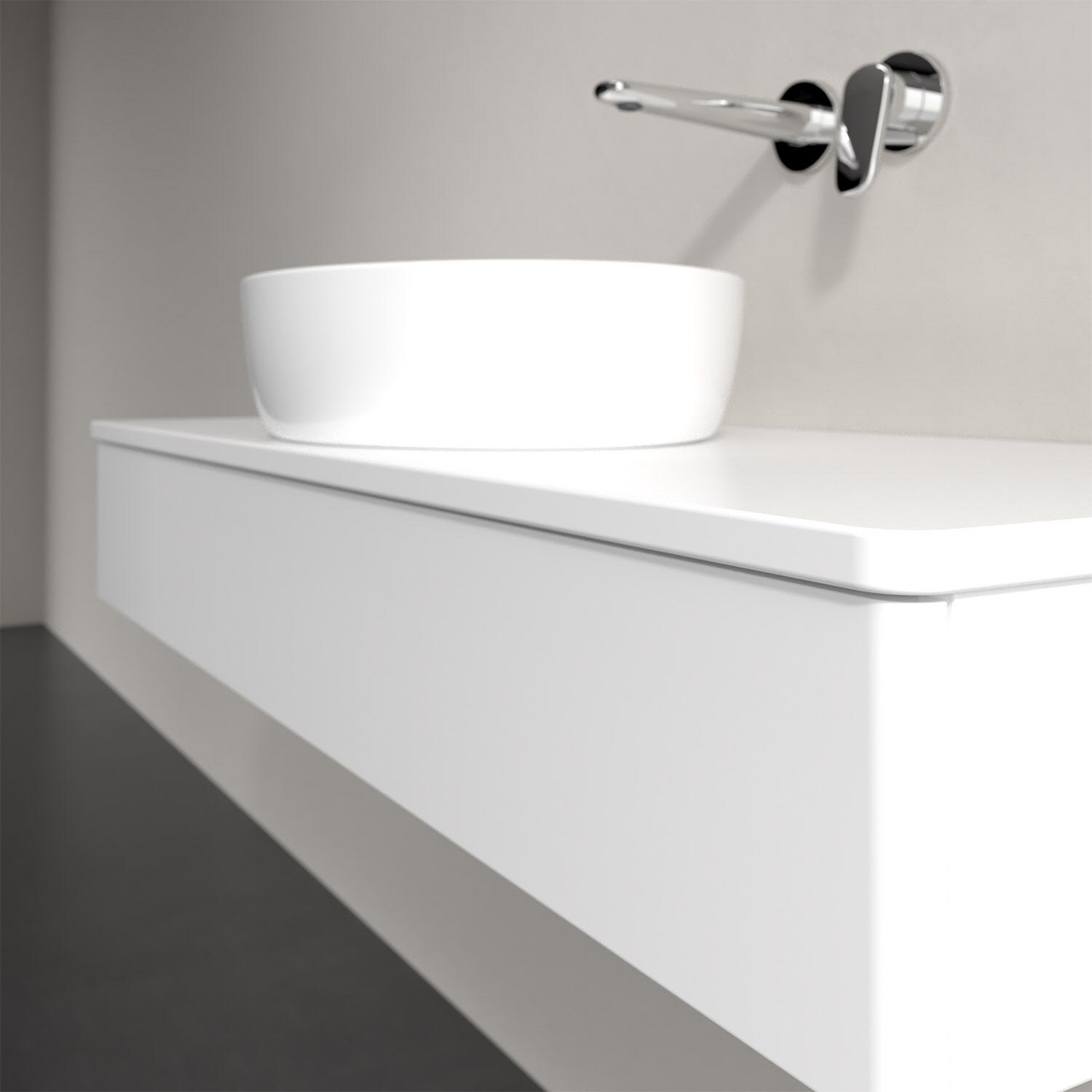 Der wandhängende Antao Waschtischunterschrank von Villeroy & Boch bietet nicht nur jede Menge Stauraum – er ist dank seines naturinspirierten Designs mit seinen abgerundeten Kanten auch noch besonders stilvoll und schafft eine gemütliche Atmosphäre im Badezimmer. Auf der Waschtischplatte bietet sich rechts und links neben dem Waschtisch viel Platz für Zahnbürstenbecher oder Seifenspender. Der geräumige Auszug bietet viel Platz, um alles Notwendige zu verstauen und Ordnung zu halten. Öffnen lässt er sich durch leichten Druck auf die grifflose Front. Dabei aktiviert sich übrigens die Auszugsbeleuchtung in angenehmem Warmweiß. Dank Vollauszug hat man immer alles im Blick und der Antirutschboden verhindert ein Umfallen oder Verrutschen der Gegenstände. Einfach clever! Für eine besonders leichte Pflege sorgt die mehrschichtig deckend lackierte Oberfläche.