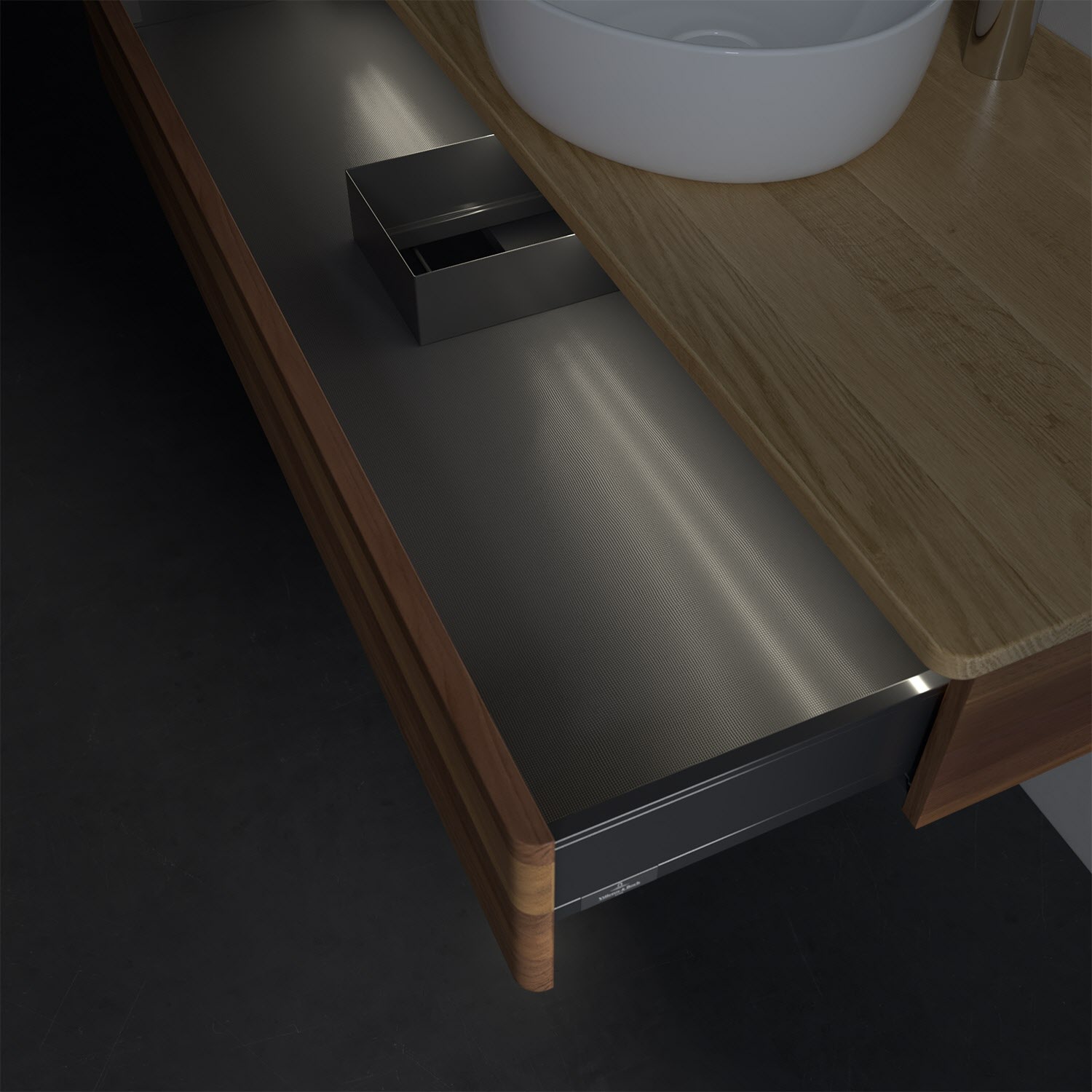 - in Schublade integrierte LED-Leiste mit warmweißem Licht zur Beleuchtung des Innenlebens