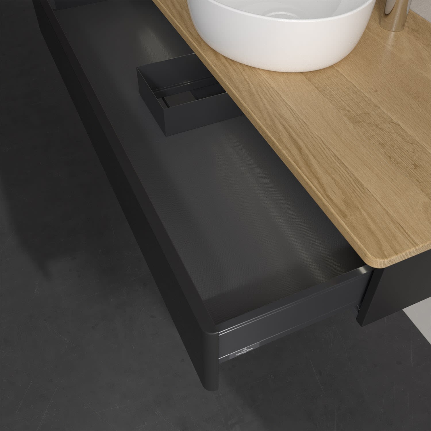 Der wandhängende Antao Waschtischunterschrank von Villeroy & Boch bietet nicht nur jede Menge Stauraum – er ist dank seines naturinspirierten Designs mit seinen abgerundeten Kanten auch noch besonders stilvoll und schafft eine gemütliche Atmosphäre im Badezimmer. Auf der Waschtischplatte bietet sich rechts und links neben dem Waschtisch viel Platz für Zahnbürstenbecher oder Seifenspender. Der geräumige Auszug bietet viel Platz, um alles Notwendige zu verstauen und Ordnung zu halten. Öffnen lässt er sich durch leichten Druck auf die grifflose Front. Dabei aktiviert sich übrigens die Auszugsbeleuchtung in angenehmem Warmweiß. Dank Vollauszug hat man immer alles im Blick und der Antirutschboden verhindert ein Umfallen oder Verrutschen der Gegenstände. Einfach clever! Für eine besonders leichte Pflege sorgt die mehrschichtig deckend lackierte Oberfläche. Bei der Ausführung in Massivholz wird dank des verarbeiteten Massivholzes jedes Möbel zu einem Unikat, das sich durch das lebendige Naturmaterial durch seine einzigartige Struktur und Maserung auszeichnet.