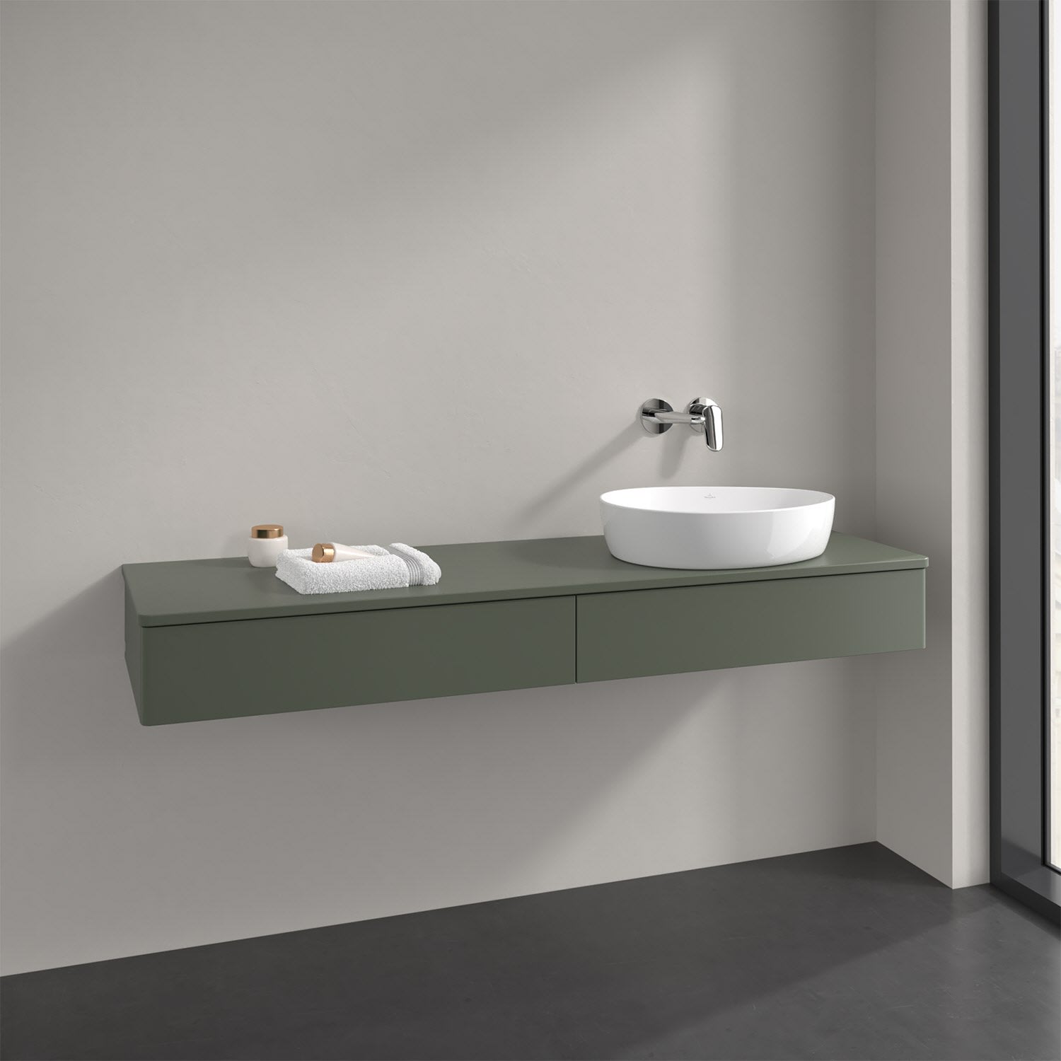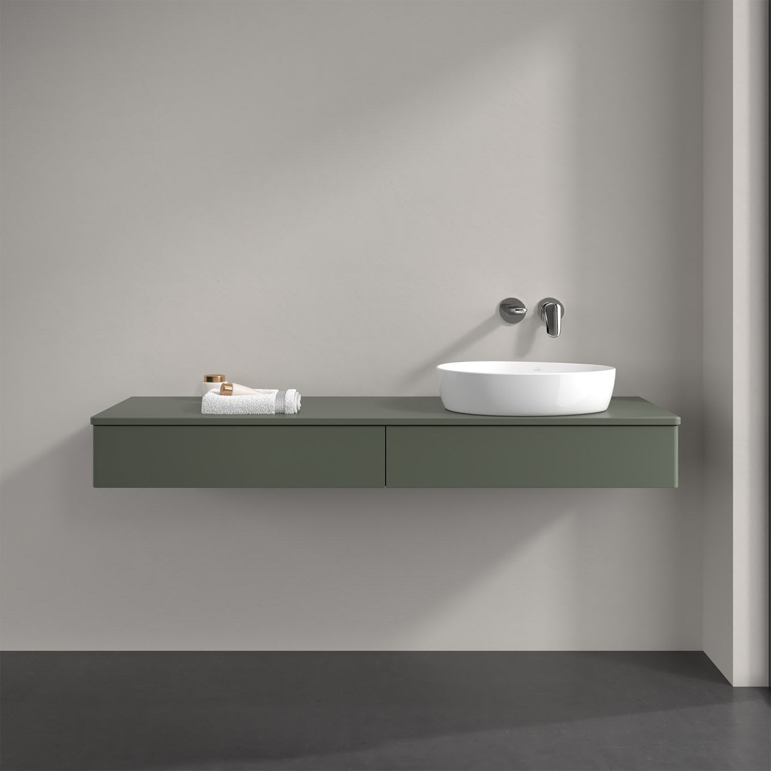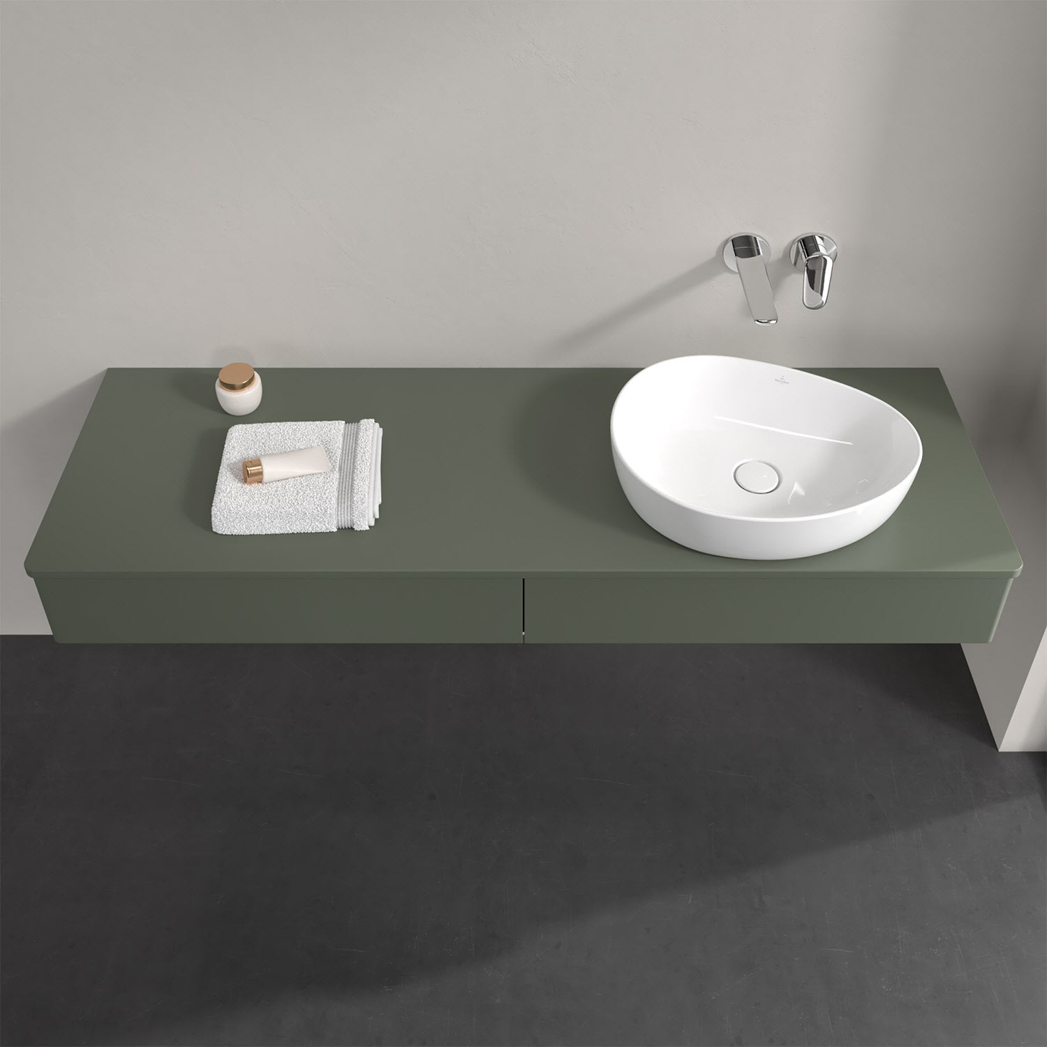 Für diesen Waschbeckenunterschrank stehen Ihnen Aufsatzwaschtische aus verschiedenen Serien zur Verfügung (siehe "Passliste" unter Downloads). Ein ausgewähltes Beispiel finden Sie im Zubehör. Den Waschtisch bitte separat mitbestellen.