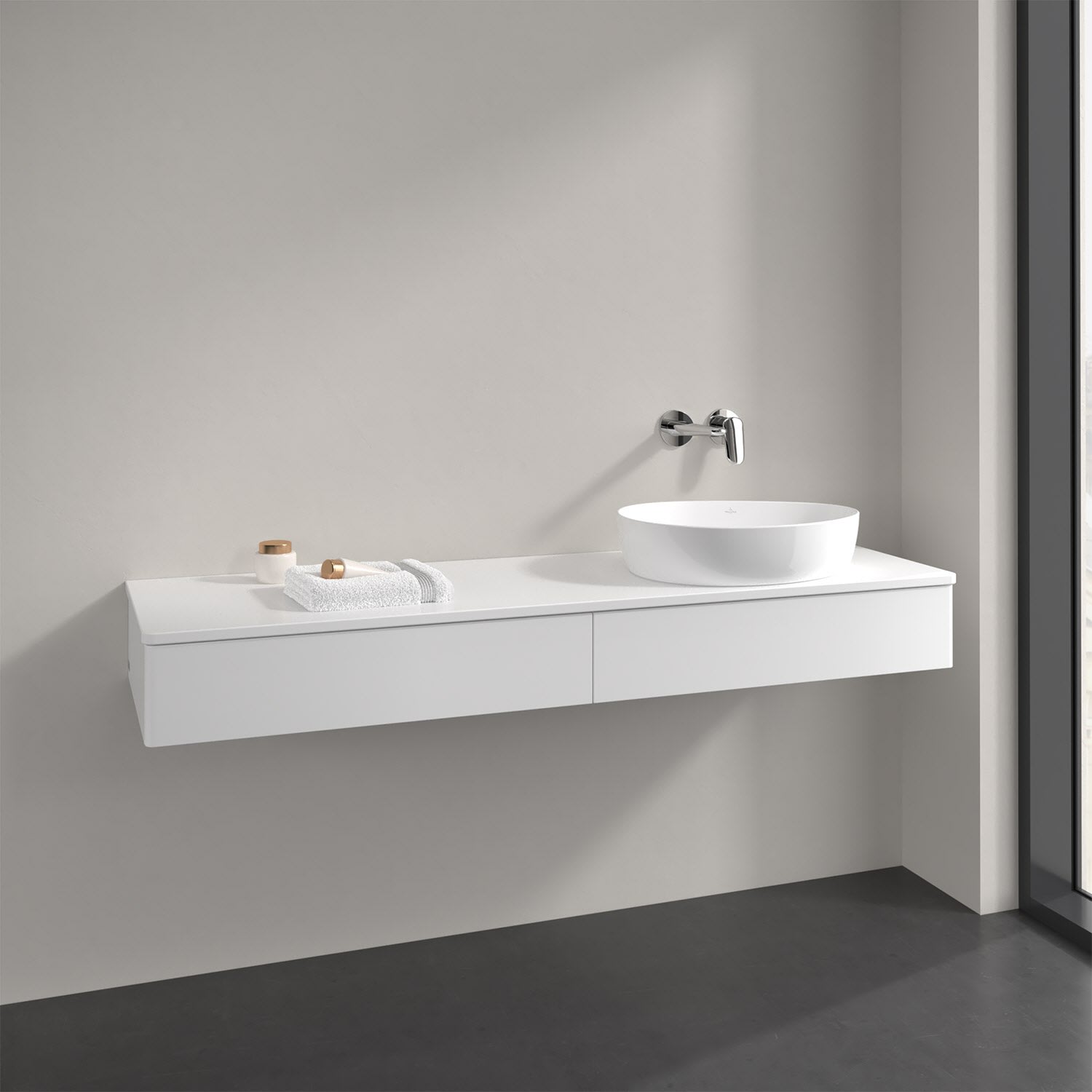 Der wandhängende Antao Waschtischunterschrank bietet mit seinen beiden Auszügen und seiner erstaunlichen Größe viel Platz zum Verstauen von Utensilien im Badezimmer. Dank des seitlich platzierten Aufsatzwaschtischs gibt es daneben weiteren Platz für Handtücher, Seifenspender & Co. auf der Waschtischplatte. Inspiriert von der Natur überzeugt der Unterschrank auch optisch mit sanfter Formsprache und abgerundete Kanten. Die grifflosen Auszüge sind mit der Push-to-Open Funktion ausgestattet und verfügen über einen Antirutschboden, damit Utensilien sicher verstaut werden können. Den Überblick behält man dank der warmweißen Auszugsbeleuchtung, die sich automatisch beim Öffnen einschaltet. Mit seiner Vollauszug- und Selbsteinzug-Funktion ist der Schrank praktisch und leicht zu bedienen. Qualität von Villeroy & Boch! Für eine besonders leichte Pflege sorgt die mehrschichtig deckend lackierte Oberfläche.