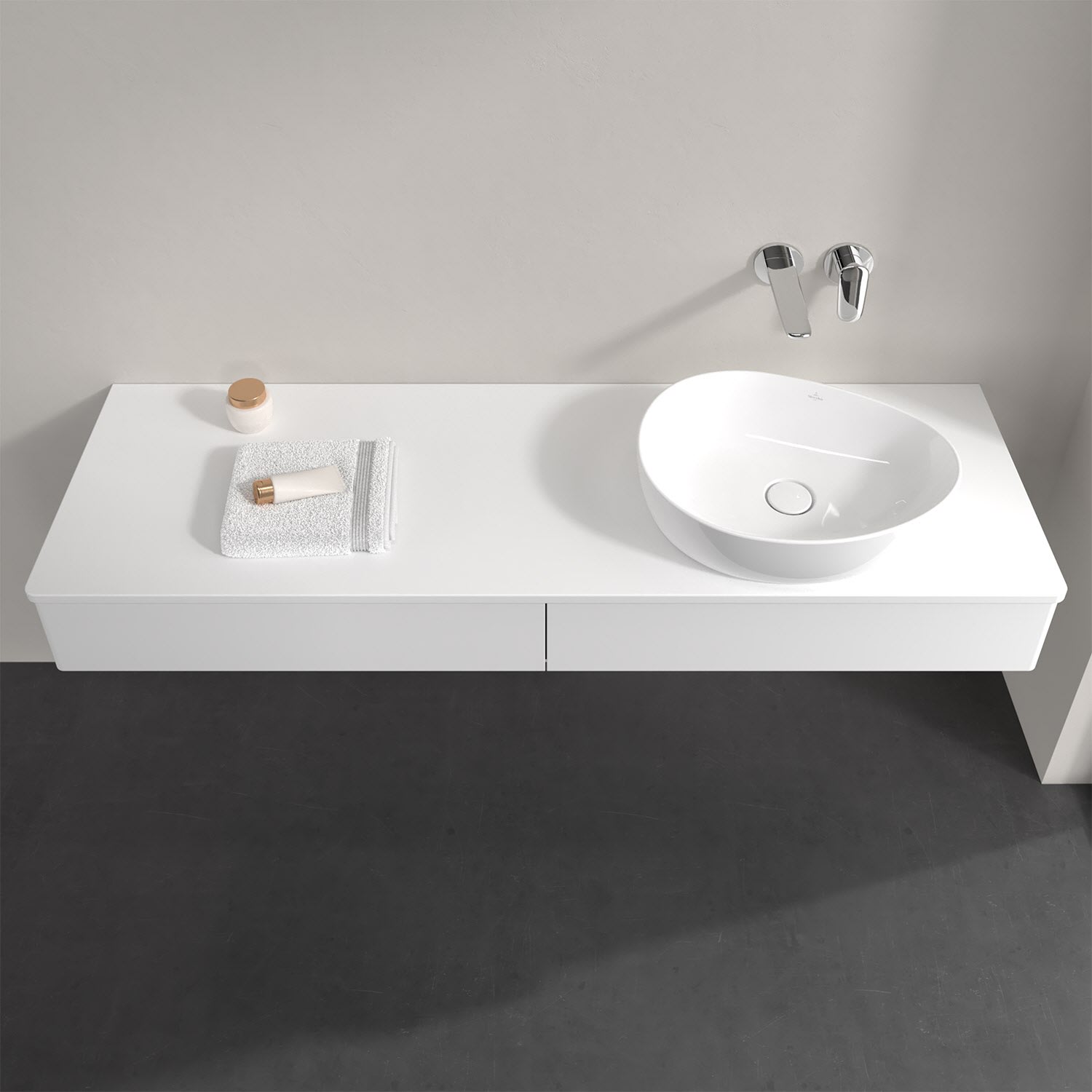 Für diesen Waschbeckenunterschrank stehen Ihnen Aufsatzwaschtische aus verschiedenen Serien zur Verfügung (siehe "Passliste" unter Downloads). Ein ausgewähltes Beispiel finden Sie im Zubehör. Den Waschtisch bitte separat mitbestellen.