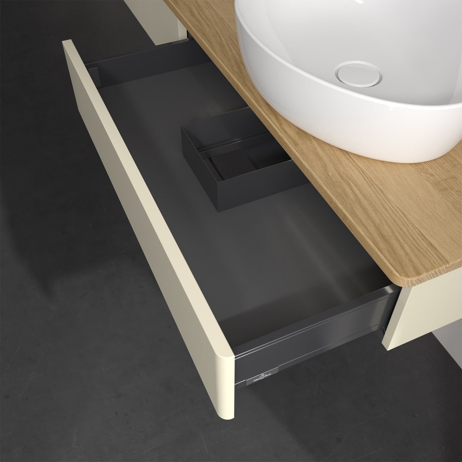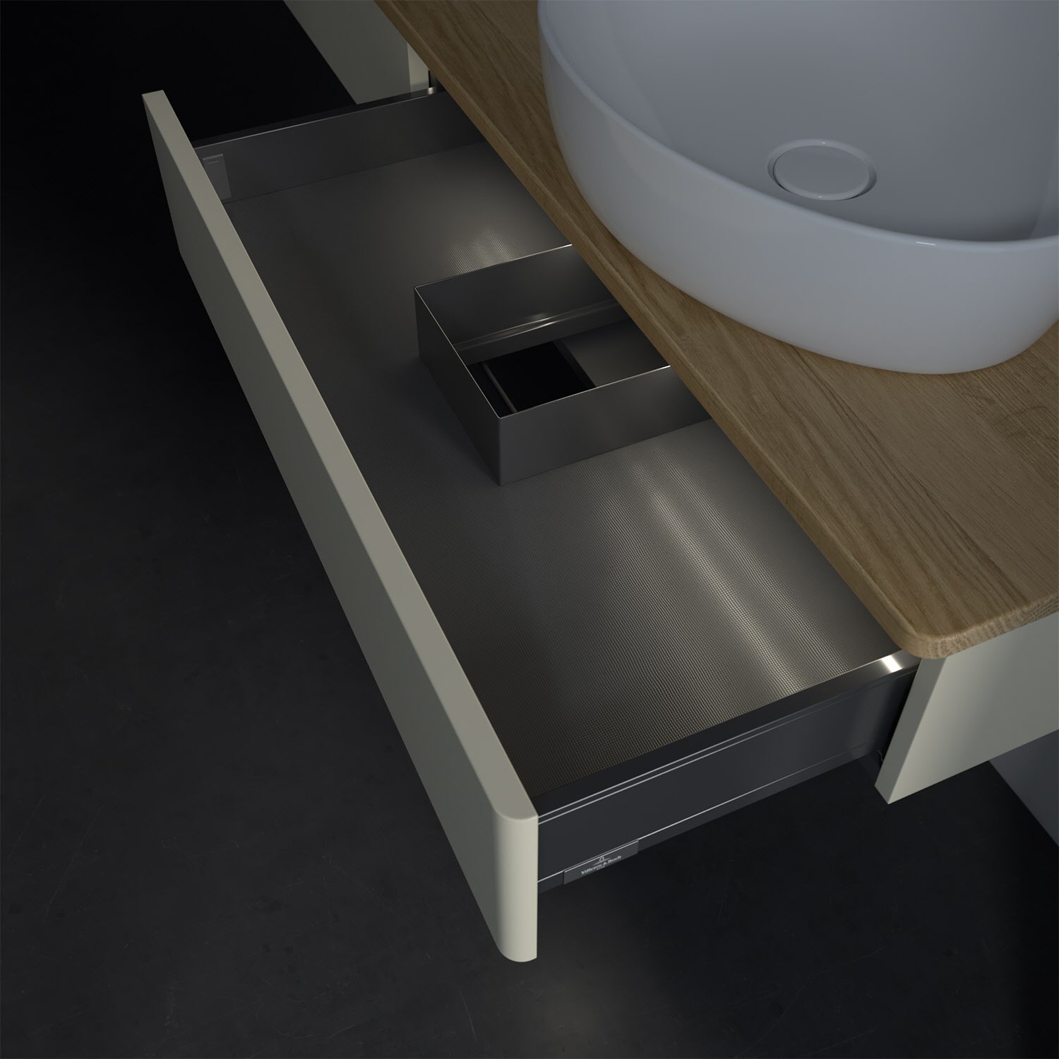 Der wandhängende Antao Waschtischunterschrank bietet mit seinen beiden Auszügen und seiner erstaunlichen Größe viel Platz zum Verstauen von Utensilien im Badezimmer. Dank des seitlich platzierten Aufsatzwaschtischs gibt es daneben weiteren Platz für Handtücher, Seifenspender & Co. auf der Waschtischplatte. Inspiriert von der Natur überzeugt der Unterschrank auch optisch mit sanfter Formsprache und abgerundete Kanten. Die grifflosen Auszüge sind mit der Push-to-Open Funktion ausgestattet und verfügen über einen Antirutschboden, damit Utensilien sicher verstaut werden können. Den Überblick behält man dank der warmweißen Auszugsbeleuchtung, die sich automatisch beim Öffnen einschaltet. Mit seiner Vollauszug- und Selbsteinzug-Funktion ist der Schrank praktisch und leicht zu bedienen. Qualität von Villeroy & Boch! Für eine besonders leichte Pflege sorgt die mehrschichtig deckend lackierte Oberfläche. Bei der Ausführung in Massivholz wird dank des verarbeiteten Massivholzes jedes Möbel zu einem Unikat, das sich durch das lebendige Naturmaterial durch seine einzigartige Struktur und Maserung auszeichnet.