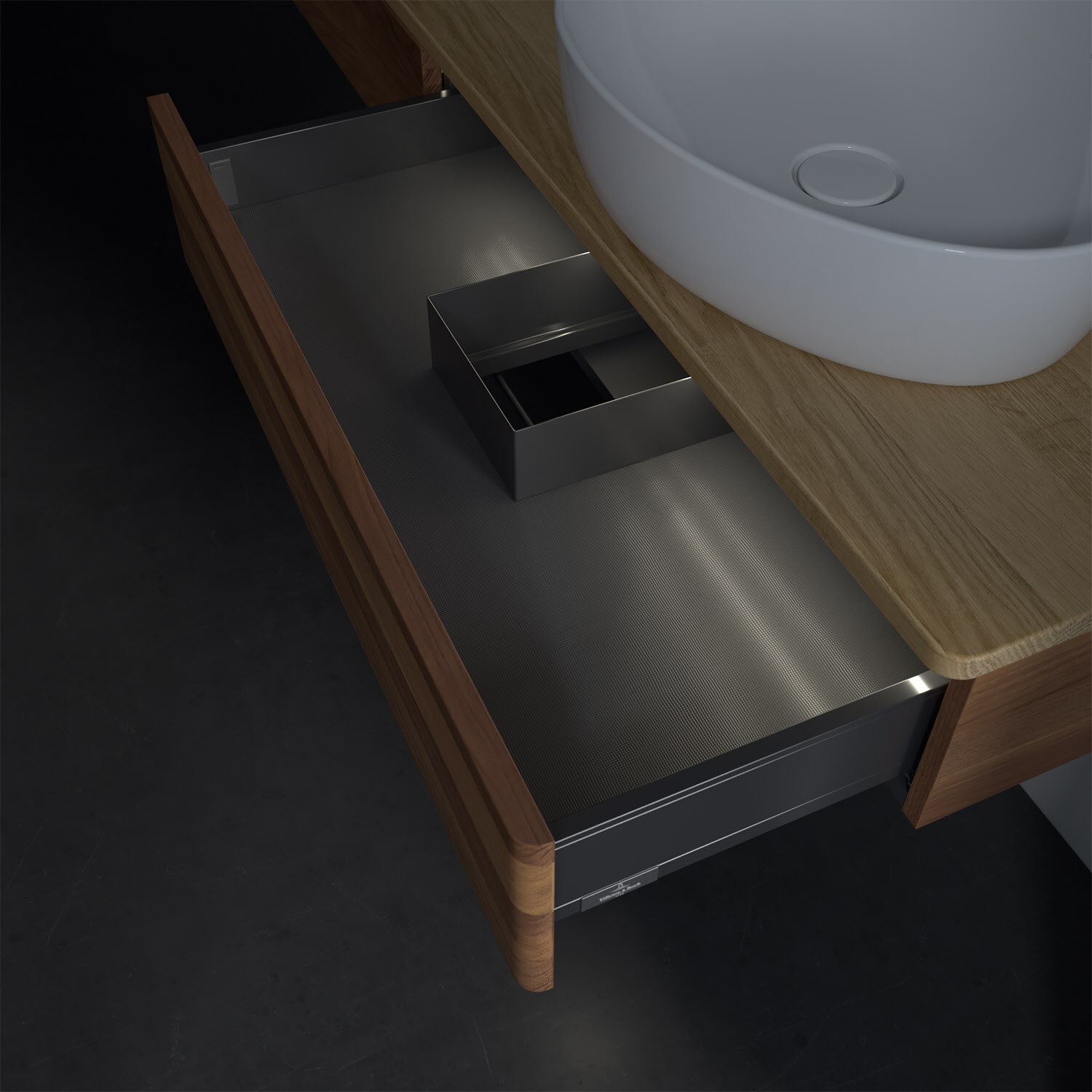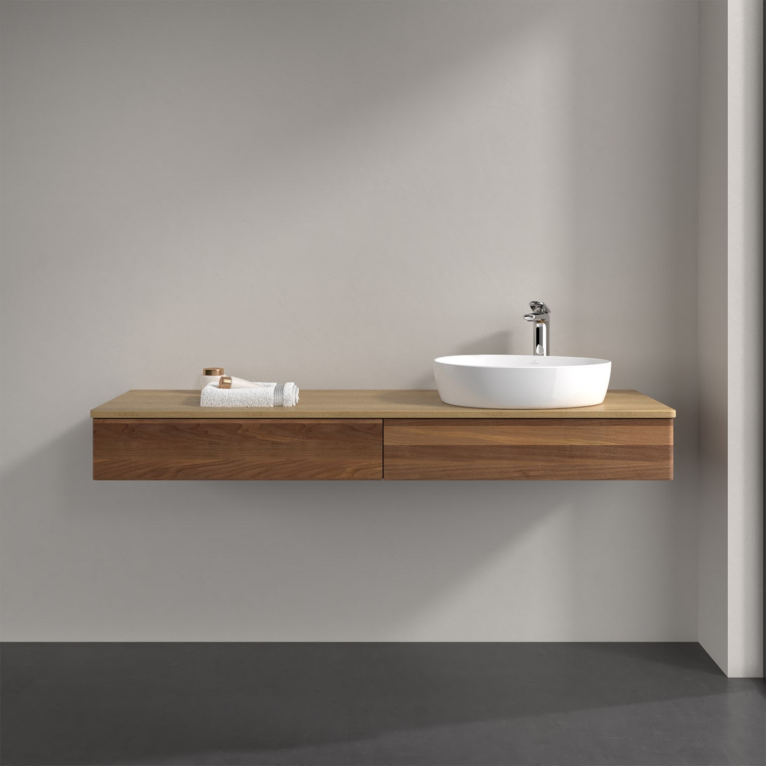Der wandhängende Antao Waschtischunterschrank bietet mit seinen beiden Auszügen und seiner erstaunlichen Größe viel Platz zum Verstauen von Utensilien im Badezimmer. Dank des seitlich platzierten Aufsatzwaschtischs gibt es daneben weiteren Platz für Handtücher, Seifenspender & Co. auf der Waschtischplatte. Inspiriert von der Natur überzeugt der Unterschrank auch optisch mit sanfter Formsprache und abgerundete Kanten. Die grifflosen Auszüge sind mit der Push-to-Open Funktion ausgestattet und verfügen über einen Antirutschboden, damit Utensilien sicher verstaut werden können. Den Überblick behält man dank der warmweißen Auszugsbeleuchtung, die sich automatisch beim Öffnen einschaltet. Mit seiner Vollauszug- und Selbsteinzug-Funktion ist der Schrank praktisch und leicht zu bedienen. Qualität von Villeroy & Boch! Für eine besonders leichte Pflege sorgt die mehrschichtig deckend lackierte Oberfläche. Bei der Ausführung in Massivholz wird dank des verarbeiteten Massivholzes jedes Möbel zu einem Unikat, das sich durch das lebendige Naturmaterial durch seine einzigartige Struktur und Maserung auszeichnet.