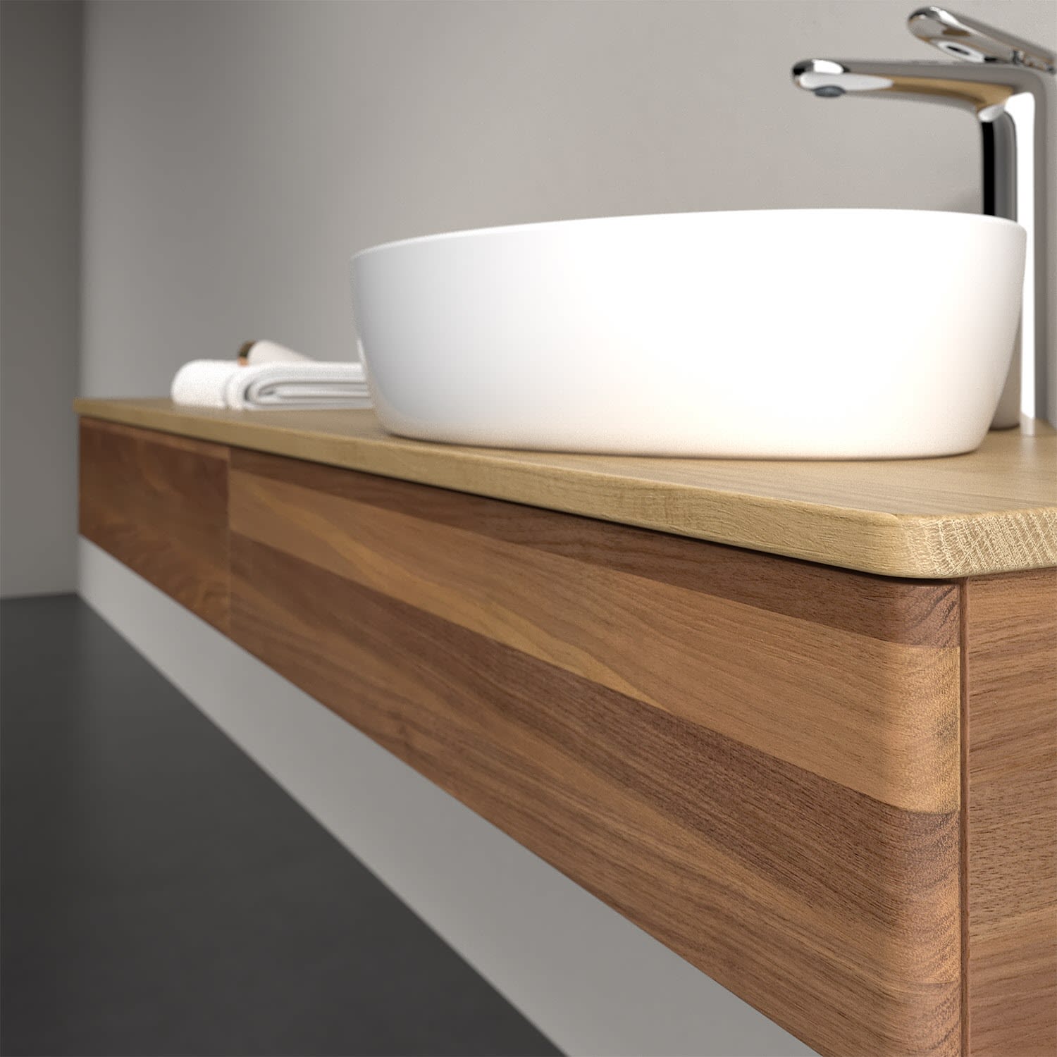 Für diesen Waschbeckenunterschrank stehen Ihnen Aufsatzwaschtische aus verschiedenen Serien zur Verfügung (siehe "Passliste" unter Downloads). Ein ausgewähltes Beispiel finden Sie im Zubehör. Den Waschtisch bitte separat mitbestellen.