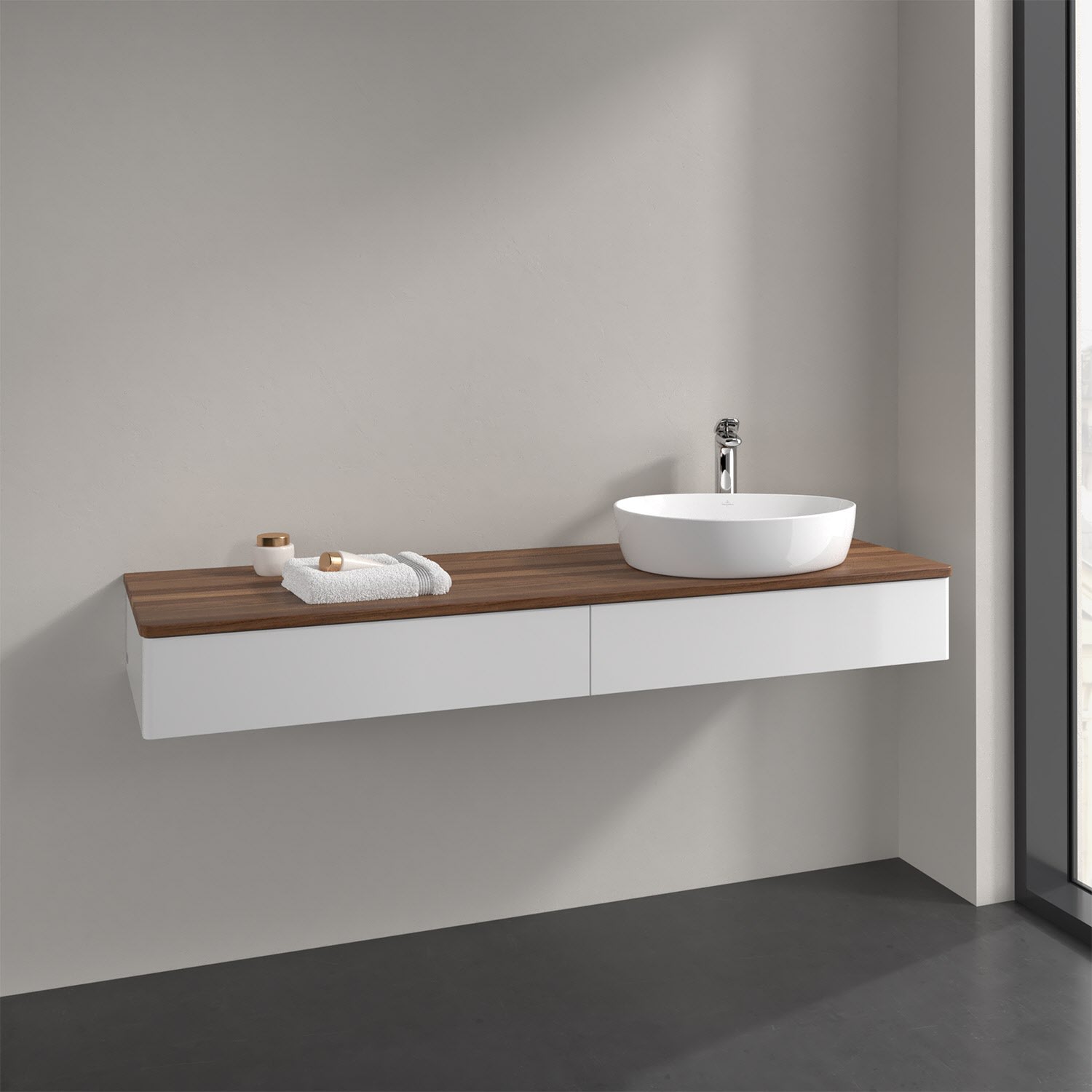 Der wandhängende Antao Waschtischunterschrank bietet mit seinen beiden Auszügen und seiner erstaunlichen Größe viel Platz zum Verstauen von Utensilien im Badezimmer. Dank des seitlich platzierten Aufsatzwaschtischs gibt es daneben weiteren Platz für Handtücher, Seifenspender & Co. auf der Waschtischplatte. Inspiriert von der Natur überzeugt der Unterschrank auch optisch mit sanfter Formsprache und abgerundete Kanten. Die grifflosen Auszüge sind mit der Push-to-Open Funktion ausgestattet und verfügen über einen Antirutschboden, damit Utensilien sicher verstaut werden können. Den Überblick behält man dank der warmweißen Auszugsbeleuchtung, die sich automatisch beim Öffnen einschaltet. Mit seiner Vollauszug- und Selbsteinzug-Funktion ist der Schrank praktisch und leicht zu bedienen. Qualität von Villeroy & Boch! Für eine besonders leichte Pflege sorgt die mehrschichtig deckend lackierte Oberfläche. Bei der Ausführung in Massivholz wird dank des verarbeiteten Massivholzes jedes Möbel zu einem Unikat, das sich durch das lebendige Naturmaterial durch seine einzigartige Struktur und Maserung auszeichnet.