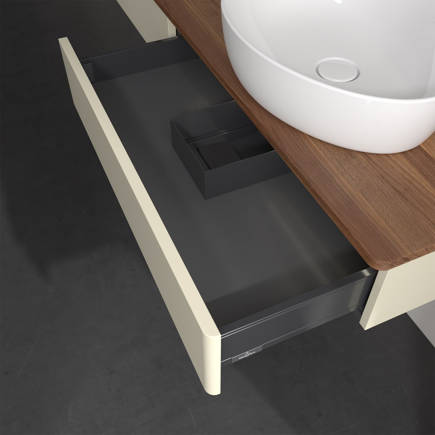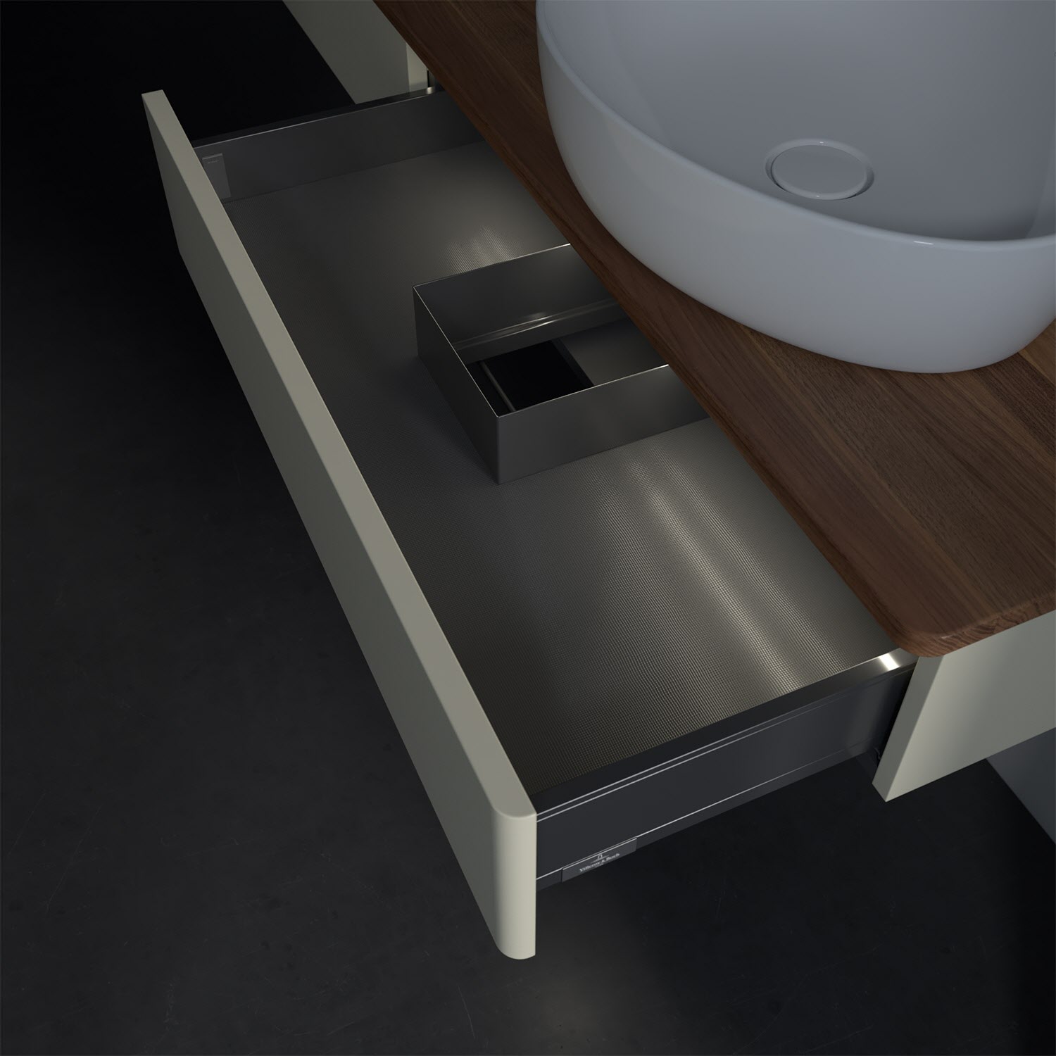 Der wandhängende Antao Waschtischunterschrank bietet mit seinen beiden Auszügen und seiner erstaunlichen Größe viel Platz zum Verstauen von Utensilien im Badezimmer. Dank des seitlich platzierten Aufsatzwaschtischs gibt es daneben weiteren Platz für Handtücher, Seifenspender & Co. auf der Waschtischplatte. Inspiriert von der Natur überzeugt der Unterschrank auch optisch mit sanfter Formsprache und abgerundete Kanten. Die grifflosen Auszüge sind mit der Push-to-Open Funktion ausgestattet und verfügen über einen Antirutschboden, damit Utensilien sicher verstaut werden können. Den Überblick behält man dank der warmweißen Auszugsbeleuchtung, die sich automatisch beim Öffnen einschaltet. Mit seiner Vollauszug- und Selbsteinzug-Funktion ist der Schrank praktisch und leicht zu bedienen. Qualität von Villeroy & Boch! Für eine besonders leichte Pflege sorgt die mehrschichtig deckend lackierte Oberfläche. Bei der Ausführung in Massivholz wird dank des verarbeiteten Massivholzes jedes Möbel zu einem Unikat, das sich durch das lebendige Naturmaterial durch seine einzigartige Struktur und Maserung auszeichnet.