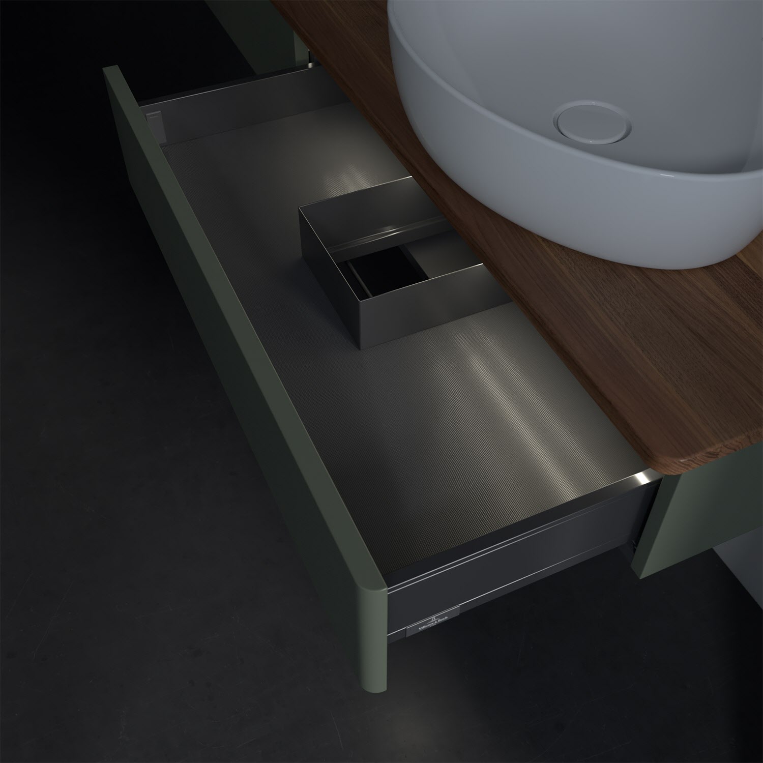Der wandhängende Antao Waschtischunterschrank bietet mit seinen beiden Auszügen und seiner erstaunlichen Größe viel Platz zum Verstauen von Utensilien im Badezimmer. Dank des seitlich platzierten Aufsatzwaschtischs gibt es daneben weiteren Platz für Handtücher, Seifenspender & Co. auf der Waschtischplatte. Inspiriert von der Natur überzeugt der Unterschrank auch optisch mit sanfter Formsprache und abgerundete Kanten. Die grifflosen Auszüge sind mit der Push-to-Open Funktion ausgestattet und verfügen über einen Antirutschboden, damit Utensilien sicher verstaut werden können. Den Überblick behält man dank der warmweißen Auszugsbeleuchtung, die sich automatisch beim Öffnen einschaltet. Mit seiner Vollauszug- und Selbsteinzug-Funktion ist der Schrank praktisch und leicht zu bedienen. Qualität von Villeroy & Boch! Für eine besonders leichte Pflege sorgt die mehrschichtig deckend lackierte Oberfläche. Bei der Ausführung in Massivholz wird dank des verarbeiteten Massivholzes jedes Möbel zu einem Unikat, das sich durch das lebendige Naturmaterial durch seine einzigartige Struktur und Maserung auszeichnet.