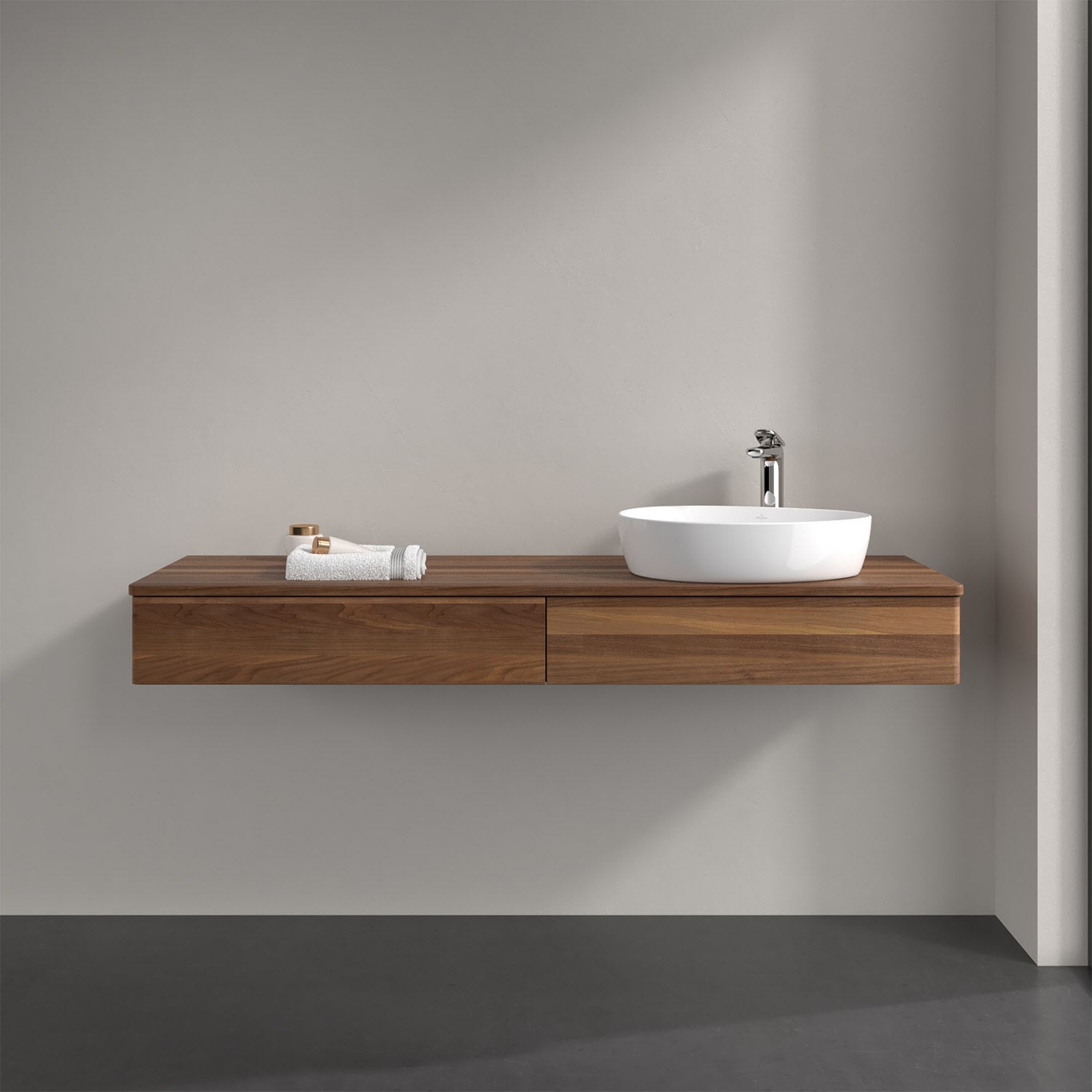 Der wandhängende Antao Waschtischunterschrank bietet mit seinen beiden Auszügen und seiner erstaunlichen Größe viel Platz zum Verstauen von Utensilien im Badezimmer. Dank des seitlich platzierten Aufsatzwaschtischs gibt es daneben weiteren Platz für Handtücher, Seifenspender & Co. auf der Waschtischplatte. Inspiriert von der Natur überzeugt der Unterschrank auch optisch mit sanfter Formsprache und abgerundete Kanten. Die grifflosen Auszüge sind mit der Push-to-Open Funktion ausgestattet und verfügen über einen Antirutschboden, damit Utensilien sicher verstaut werden können. Den Überblick behält man dank der warmweißen Auszugsbeleuchtung, die sich automatisch beim Öffnen einschaltet. Mit seiner Vollauszug- und Selbsteinzug-Funktion ist der Schrank praktisch und leicht zu bedienen. Qualität von Villeroy & Boch! Für eine besonders leichte Pflege sorgt die mehrschichtig deckend lackierte Oberfläche. Bei der Ausführung in Massivholz wird dank des verarbeiteten Massivholzes jedes Möbel zu einem Unikat, das sich durch das lebendige Naturmaterial durch seine einzigartige Struktur und Maserung auszeichnet.