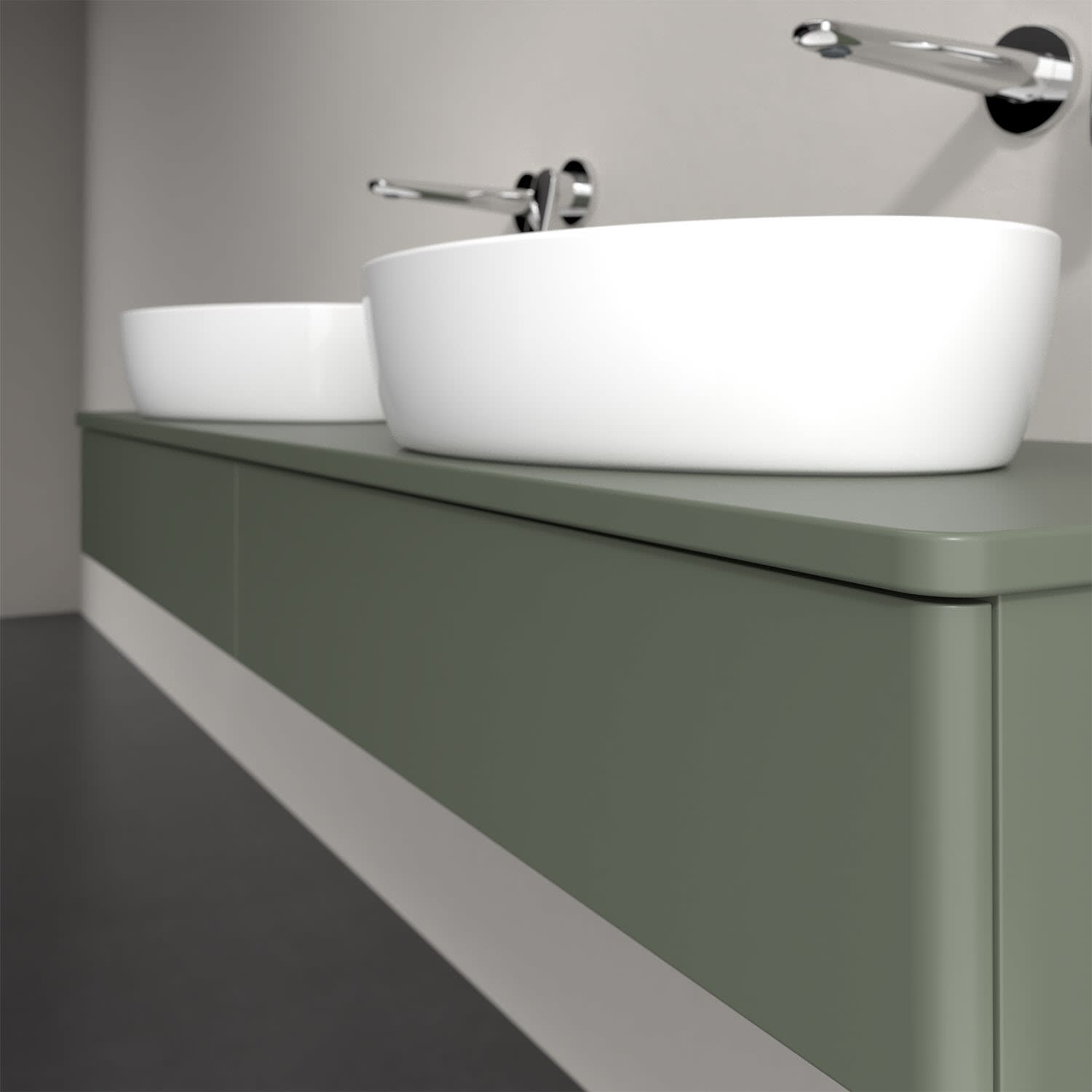 Der wandhängende Antao Waschtischunterschrank für zwei Aufsatzwaschtische bietet mit seinen beiden Auszügen und seiner erstaunlichen Größe viel Platz zum Verstauen von Utensilien im Badezimmer. Inspiriert von der Natur überzeugt der Unterschrank auch optisch mit sanfter Formsprache und abgerundete Kanten. Die grifflosen Auszüge sind mit der Push-to-Open Funktion ausgestattet und verfügen über einen Antirutschboden, damit Utensilien sicher verstaut werden können. Den Überblick behält man dank der warmweißen Auszugsbeleuchtung, die sich automatisch beim Öffnen einschaltet. Mit seiner Vollauszug- und Selbsteinzug-Funktion ist der Schrank praktisch und leicht zu bedienen. Qualität von Villeroy & Boch! Für eine besonders leichte Pflege sorgt die mehrschichtig deckend lackierte Oberfläche.