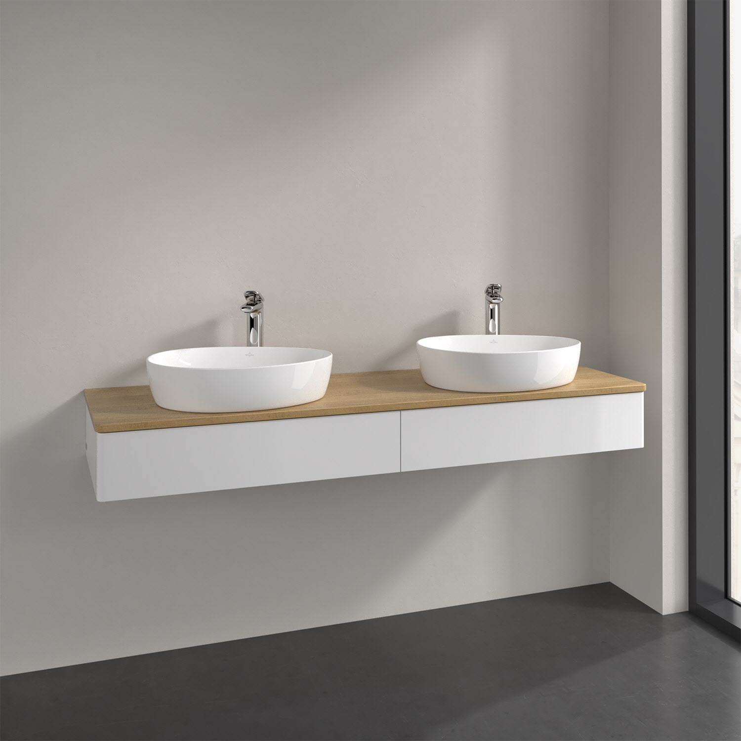 Der wandhängende Antao Waschtischunterschrank für zwei Aufsatzwaschtische bietet mit seinen beiden Auszügen und seiner erstaunlichen Größe viel Platz zum Verstauen von Utensilien im Badezimmer. Inspiriert von der Natur überzeugt der Unterschrank auch optisch mit sanfter Formsprache und abgerundete Kanten. Die grifflosen Auszüge sind mit der Push-to-Open Funktion ausgestattet und verfügen über einen Antirutschboden, damit Utensilien sicher verstaut werden können. Den Überblick behält man dank der warmweißen Auszugsbeleuchtung, die sich automatisch beim Öffnen einschaltet. Mit seiner Vollauszug- und Selbsteinzug-Funktion ist der Schrank praktisch und leicht zu bedienen. Qualität von Villeroy & Boch! Für eine besonders leichte Pflege sorgt die mehrschichtig deckend lackierte Oberfläche. Bei der Ausführung in Massivholz wird dank des verarbeiteten Massivholzes jedes Möbel zu einem Unikat, das sich durch das lebendige Naturmaterial durch seine einzigartige Struktur und Maserung auszeichnet.