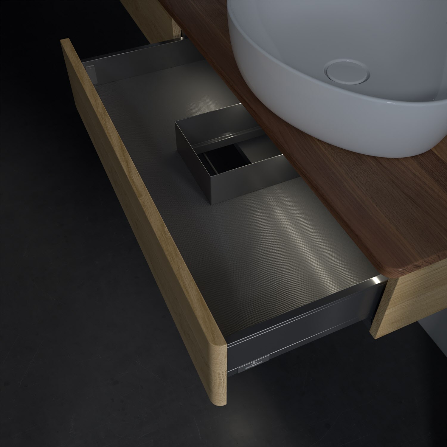 Der wandhängende Antao Waschtischunterschrank für zwei Aufsatzwaschtische bietet mit seinen beiden Auszügen und seiner erstaunlichen Größe viel Platz zum Verstauen von Utensilien im Badezimmer. Inspiriert von der Natur überzeugt der Unterschrank auch optisch mit sanfter Formsprache und abgerundete Kanten. Die grifflosen Auszüge sind mit der Push-to-Open Funktion ausgestattet und verfügen über einen Antirutschboden, damit Utensilien sicher verstaut werden können. Den Überblick behält man dank der warmweißen Auszugsbeleuchtung, die sich automatisch beim Öffnen einschaltet. Mit seiner Vollauszug- und Selbsteinzug-Funktion ist der Schrank praktisch und leicht zu bedienen. Qualität von Villeroy & Boch! Für eine besonders leichte Pflege sorgt die mehrschichtig deckend lackierte Oberfläche. Bei der Ausführung in Massivholz wird dank des verarbeiteten Massivholzes jedes Möbel zu einem Unikat, das sich durch das lebendige Naturmaterial durch seine einzigartige Struktur und Maserung auszeichnet.