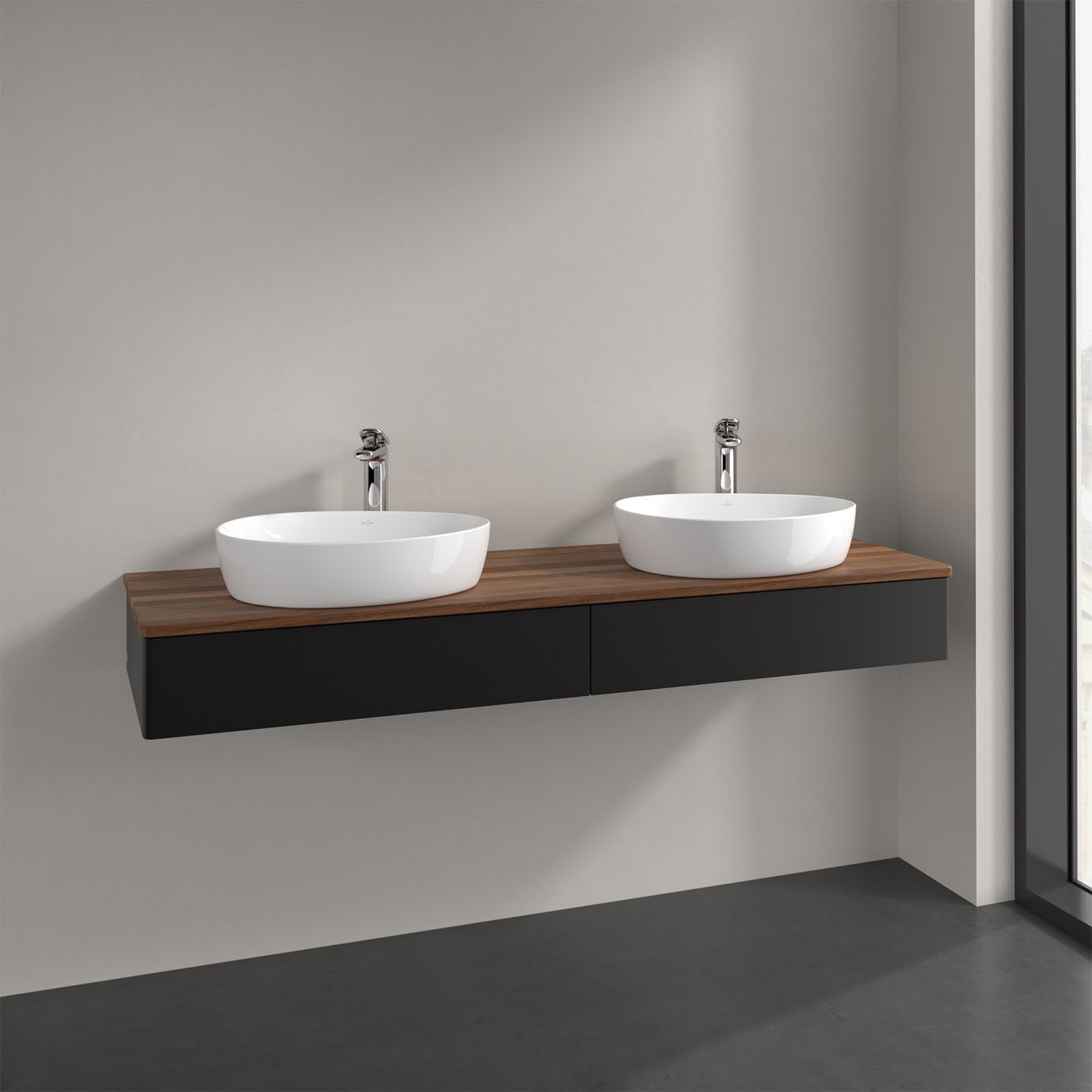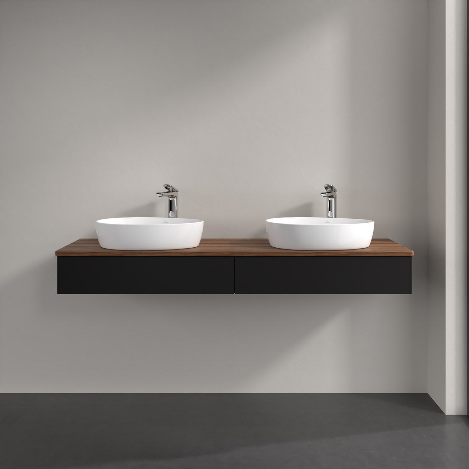 Der wandhängende Antao Waschtischunterschrank für zwei Aufsatzwaschtische bietet mit seinen beiden Auszügen und seiner erstaunlichen Größe viel Platz zum Verstauen von Utensilien im Badezimmer. Inspiriert von der Natur überzeugt der Unterschrank auch optisch mit sanfter Formsprache und abgerundete Kanten. Die grifflosen Auszüge sind mit der Push-to-Open Funktion ausgestattet und verfügen über einen Antirutschboden, damit Utensilien sicher verstaut werden können. Den Überblick behält man dank der warmweißen Auszugsbeleuchtung, die sich automatisch beim Öffnen einschaltet. Mit seiner Vollauszug- und Selbsteinzug-Funktion ist der Schrank praktisch und leicht zu bedienen. Qualität von Villeroy & Boch! Für eine besonders leichte Pflege sorgt die mehrschichtig deckend lackierte Oberfläche. Bei der Ausführung in Massivholz wird dank des verarbeiteten Massivholzes jedes Möbel zu einem Unikat, das sich durch das lebendige Naturmaterial durch seine einzigartige Struktur und Maserung auszeichnet.