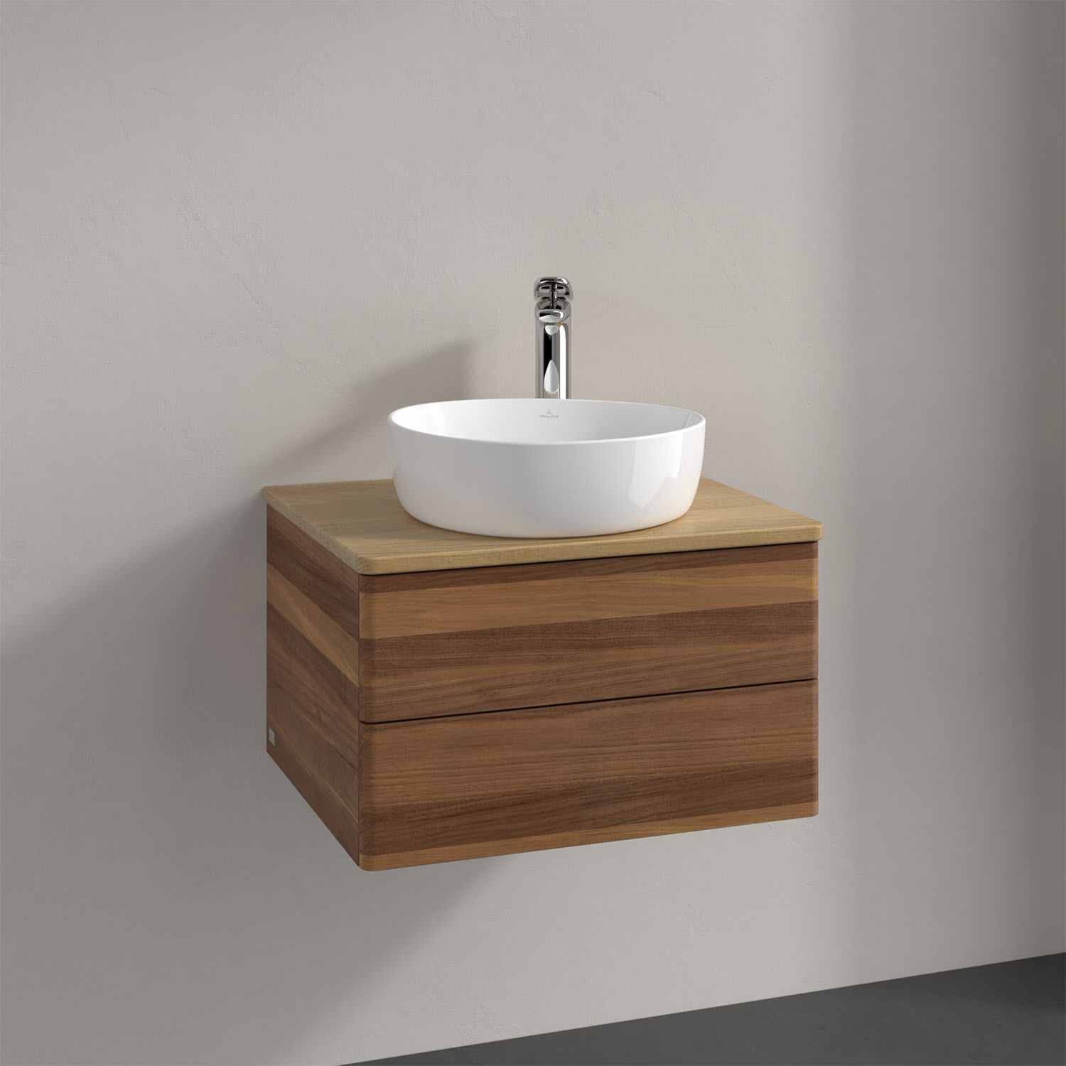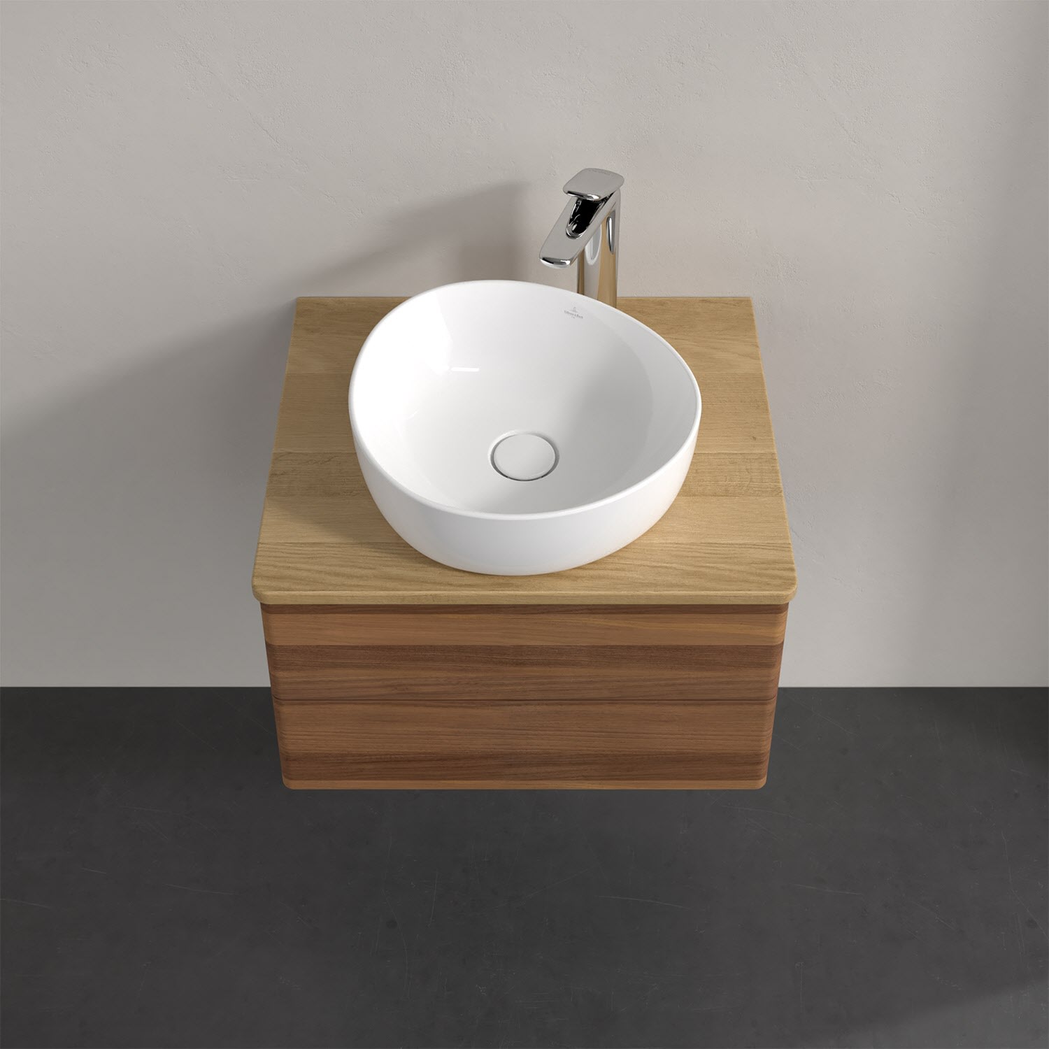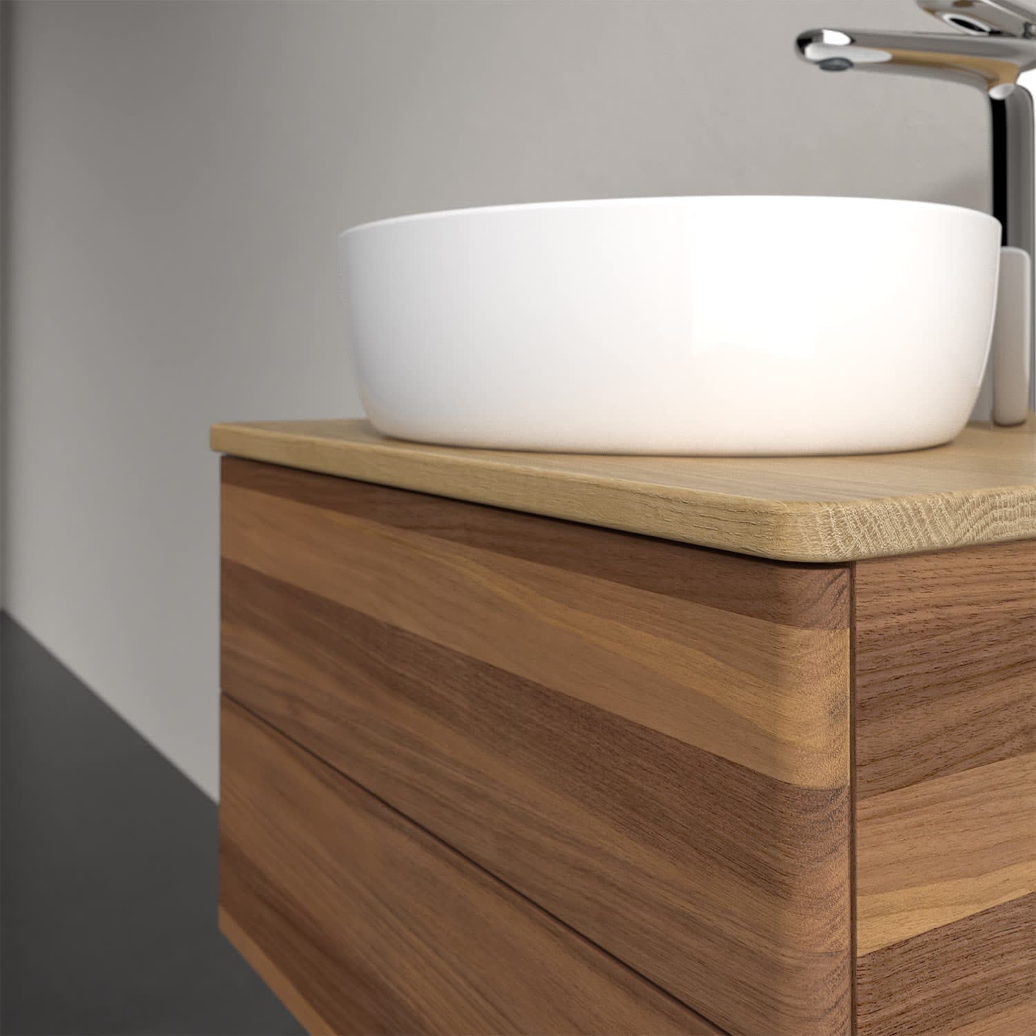 Wenig Platz im Badezimmer und dennoch soll es gemütlich und ordentlich sein? Dann ist der wandhängende Antao Waschtischunterschrank mit seinen sanft abgerundeten Kanten die ideale Lösung. Das geräumige Möbel bietet ausreichend Stauraum für alle nötigen Badutensilien. Zum Öffnen genügt dank der Push-to-Open Funktion ein leichter Druck auf die beiden grifflosen Auszüge, die sich dann in ihrer vollen Tiefe öffnen. Dabei wird gleichzeitig die angenehme Auszugsbeleuchtung in Warmweiß aktiviert. Das garantiert den benötigen Überblick! Praktisch ist auch der integrierte Antirutschboden und die SoftClosing Funktion, die ein Umfallen oder Verrutschen der verstauten Produkte verhindern. Villeroy & Boch hat alles durchdacht! Für eine besonders leichte Pflege sorgt die mehrschichtig deckend lackierte Oberfläche. Bei der Ausführung in Massivholz wird dank des verarbeiteten Massivholzes jedes Möbel zu einem Unikat, das sich durch das lebendige Naturmaterial durch seine einzigartige Struktur und Maserung auszeichnet.