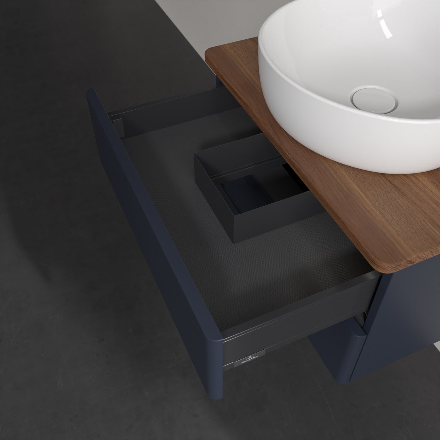 Wenig Platz im Badezimmer und dennoch soll es gemütlich und ordentlich sein? Dann ist der wandhängende Antao Waschtischunterschrank mit seinen sanft abgerundeten Kanten die ideale Lösung. Das geräumige Möbel bietet ausreichend Stauraum für alle nötigen Badutensilien. Zum Öffnen genügt dank der Push-to-Open Funktion ein leichter Druck auf die beiden grifflosen Auszüge, die sich dann in ihrer vollen Tiefe öffnen. Dabei wird gleichzeitig die angenehme Auszugsbeleuchtung in Warmweiß aktiviert. Das garantiert den benötigen Überblick! Praktisch ist auch der integrierte Antirutschboden und die SoftClosing Funktion, die ein Umfallen oder Verrutschen der verstauten Produkte verhindern. Villeroy & Boch hat alles durchdacht! Für eine besonders leichte Pflege sorgt die mehrschichtig deckend lackierte Oberfläche. Bei der Ausführung in Massivholz wird dank des verarbeiteten Massivholzes jedes Möbel zu einem Unikat, das sich durch das lebendige Naturmaterial durch seine einzigartige Struktur und Maserung auszeichnet.