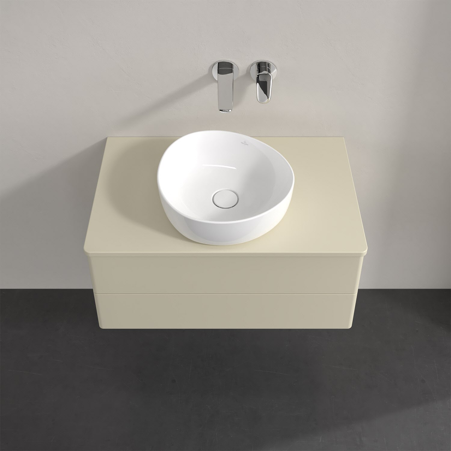 Für diesen Waschbeckenunterschrank stehen Ihnen Aufsatzwaschtische aus verschiedenen Serien zur Verfügung (siehe "Passliste" unter Downloads). Ein ausgewähltes Beispiel finden Sie im Zubehör. Den Waschtisch bitte separat mitbestellen.