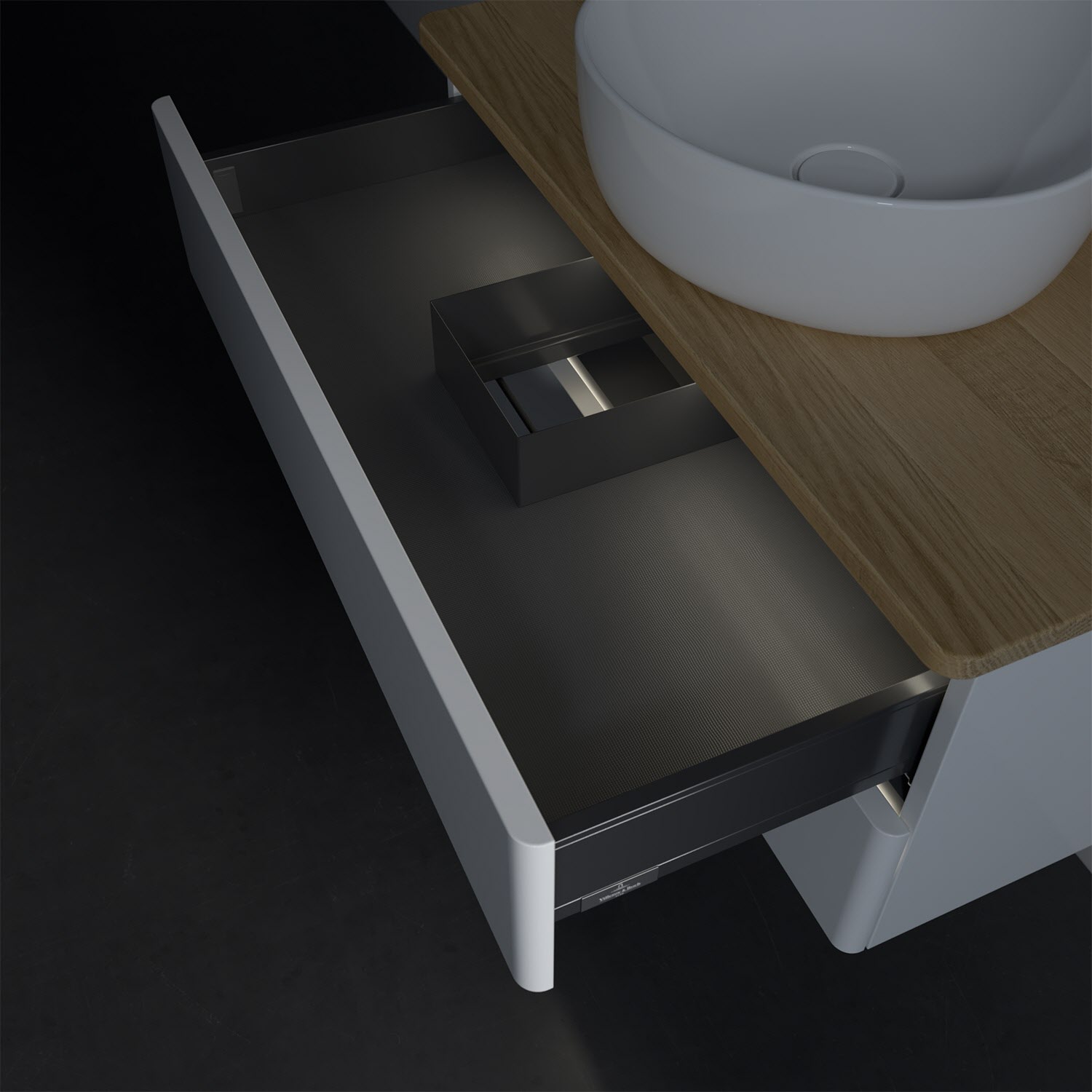 Für diesen Waschbeckenunterschrank stehen Ihnen Aufsatzwaschtische aus verschiedenen Serien zur Verfügung (siehe "Passliste" unter Downloads). Ein ausgewähltes Beispiel finden Sie im Zubehör. Den Waschtisch bitte separat mitbestellen.