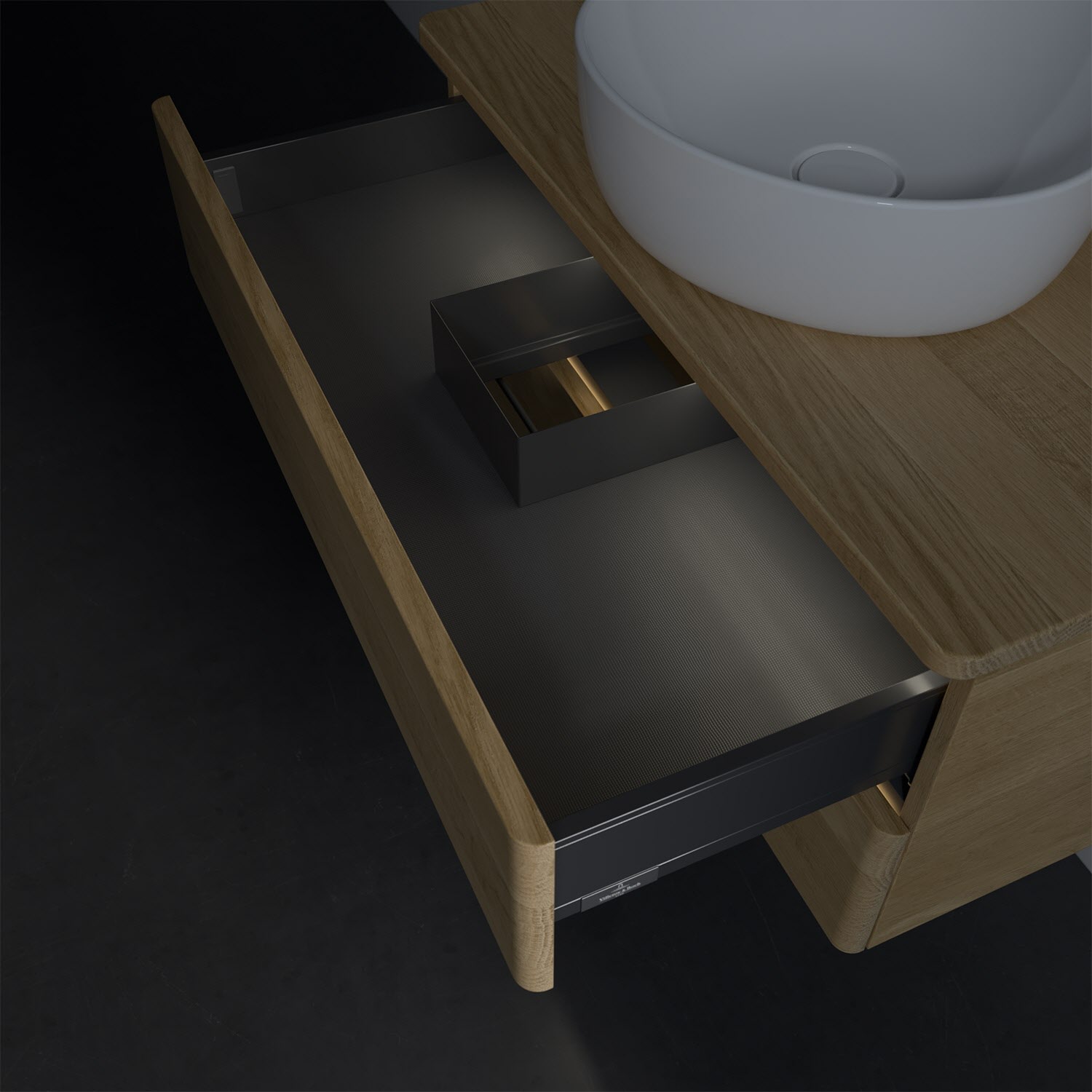 - in Schublade integrierte LED-Leiste mit warmweißem Licht zur Beleuchtung des Innenlebens