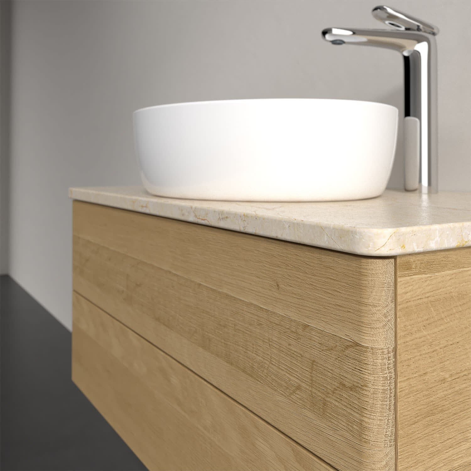 Für diesen Waschbeckenunterschrank stehen Ihnen Aufsatzwaschtische aus verschiedenen Serien zur Verfügung (siehe "Passliste" unter Downloads). Ein ausgewähltes Beispiel finden Sie im Zubehör. Den Waschtisch bitte separat mitbestellen.
