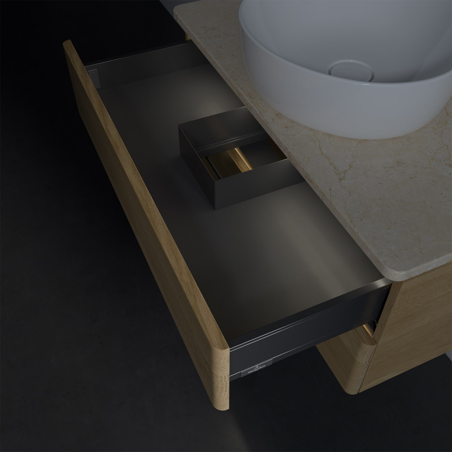 - in Schublade integrierte LED-Leiste mit warmweißem Licht zur Beleuchtung des Innenlebens