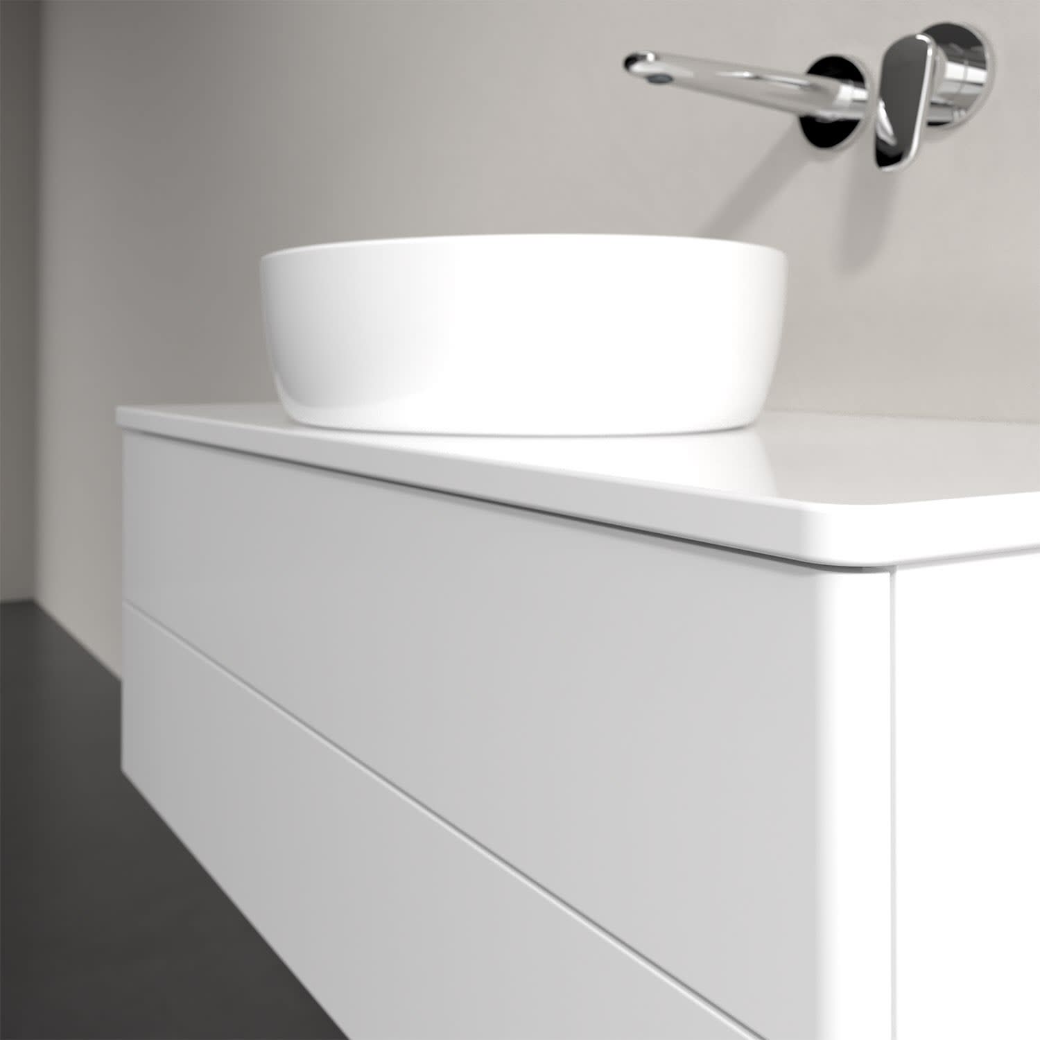 Für diesen Waschbeckenunterschrank stehen Ihnen Aufsatzwaschtische aus verschiedenen Serien zur Verfügung (siehe "Passliste" unter Downloads). Ein ausgewähltes Beispiel finden Sie im Zubehör. Den Waschtisch bitte separat mitbestellen.