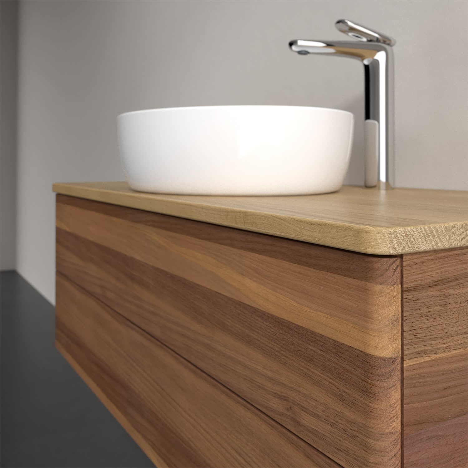 Mit dem wandhängenden Antao Waschtischunterschrank entscheidet man sich für eine hochwertige und praktische Stauraumlösung, die viel Freude bereitet. Die Funktionen sind besonders gut durchdacht: Im Inneren der beiden vollausziehbaren Auszüge können Handtücher, Kosmetik oder andere Pflegeprodukte dank des Antirutschbodens bequem aufbewahrt werden. Geöffnet wird das Möbel durch leichten Druck auf die grifflose Front. Der Clou: Dabei schaltet sich die warmweiße Auszugsbeleuchtung ein. Natürlich verfügen die Auszüge über eingebaute Dämpfer, die sie anschließend wieder sanft und leise schließen lassen. Auch auf der Waschtischplatte finden die wichtigsten Utensilien seitlich des Waschtischs genügend Platz. Optisch sorgt der Unterschrank von Villeroy & Boch mit seinen abgerundeten Kanten für ein modernes, gemütliches Ambiente. Für eine besonders leichte Pflege sorgt die mehrschichtig deckend lackierte Oberfläche. Bei der Ausführung in Massivholz wird dank des verarbeiteten Massivholzes jedes Möbel zu einem Unikat, das sich durch das lebendige Naturmaterial durch seine einzigartige Struktur und Maserung auszeichnet.