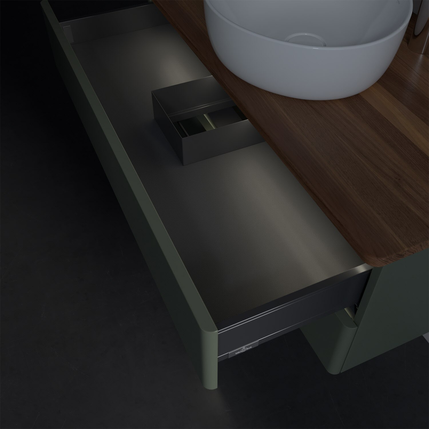 Mit dem wandhängenden Antao Waschtischunterschrank entscheidet man sich für eine hochwertige und praktische Stauraumlösung, die viel Freude bereitet. Die Funktionen sind besonders gut durchdacht: Im Inneren der beiden vollausziehbaren Auszüge können Handtücher, Kosmetik oder andere Pflegeprodukte dank des Antirutschbodens bequem aufbewahrt werden. Geöffnet wird das Möbel durch leichten Druck auf die grifflose Front. Der Clou: Dabei schaltet sich die warmweiße Auszugsbeleuchtung ein. Natürlich verfügen die Auszüge über eingebaute Dämpfer, die sie anschließend wieder sanft und leise schließen lassen. Auch auf der Waschtischplatte finden die wichtigsten Utensilien seitlich des Waschtischs genügend Platz. Optisch sorgt der Unterschrank von Villeroy & Boch mit seinen abgerundeten Kanten für ein modernes, gemütliches Ambiente. Für eine besonders leichte Pflege sorgt die mehrschichtig deckend lackierte Oberfläche. Bei der Ausführung in Massivholz wird dank des verarbeiteten Massivholzes jedes Möbel zu einem Unikat, das sich durch das lebendige Naturmaterial durch seine einzigartige Struktur und Maserung auszeichnet.