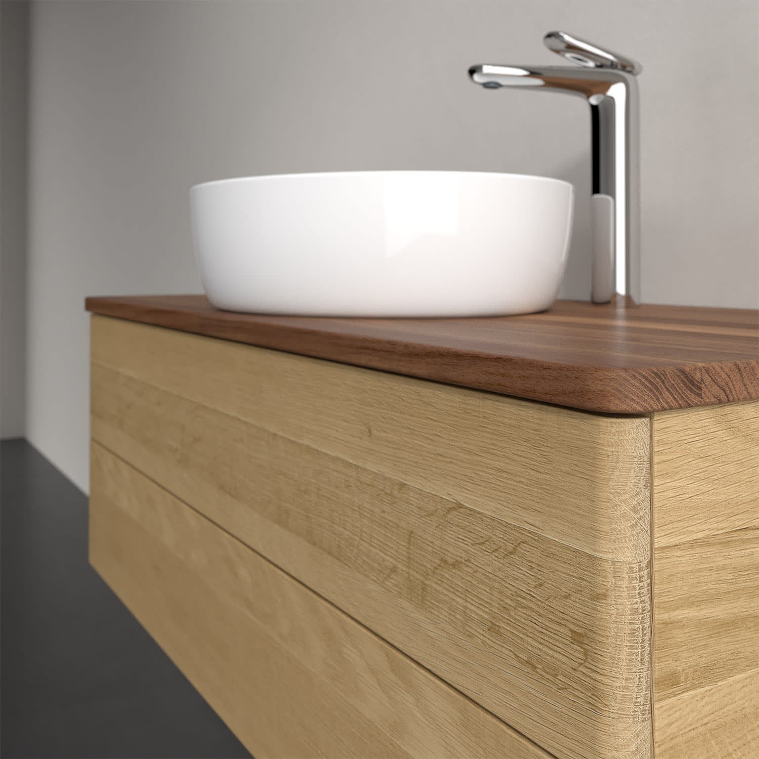 Mit dem wandhängenden Antao Waschtischunterschrank entscheidet man sich für eine hochwertige und praktische Stauraumlösung, die viel Freude bereitet. Die Funktionen sind besonders gut durchdacht: Im Inneren der beiden vollausziehbaren Auszüge können Handtücher, Kosmetik oder andere Pflegeprodukte dank des Antirutschbodens bequem aufbewahrt werden. Geöffnet wird das Möbel durch leichten Druck auf die grifflose Front. Der Clou: Dabei schaltet sich die warmweiße Auszugsbeleuchtung ein. Natürlich verfügen die Auszüge über eingebaute Dämpfer, die sie anschließend wieder sanft und leise schließen lassen. Auch auf der Waschtischplatte finden die wichtigsten Utensilien seitlich des Waschtischs genügend Platz. Optisch sorgt der Unterschrank von Villeroy & Boch mit seinen abgerundeten Kanten für ein modernes, gemütliches Ambiente. Für eine besonders leichte Pflege sorgt die mehrschichtig deckend lackierte Oberfläche. Bei der Ausführung in Massivholz wird dank des verarbeiteten Massivholzes jedes Möbel zu einem Unikat, das sich durch das lebendige Naturmaterial durch seine einzigartige Struktur und Maserung auszeichnet.