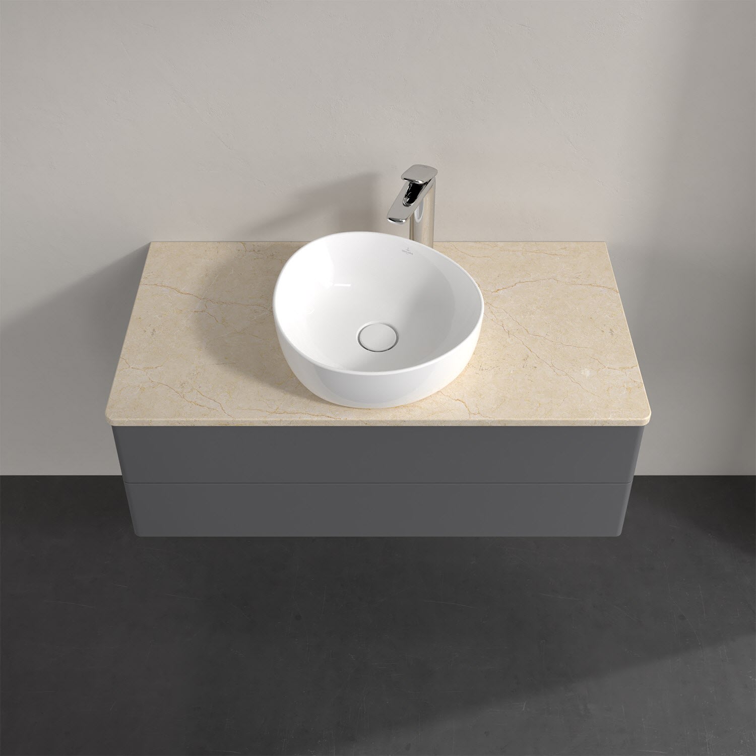 Für diesen Waschbeckenunterschrank stehen Ihnen Aufsatzwaschtische aus verschiedenen Serien zur Verfügung (siehe "Passliste" unter Downloads). Ein ausgewähltes Beispiel finden Sie im Zubehör. Den Waschtisch bitte separat mitbestellen.