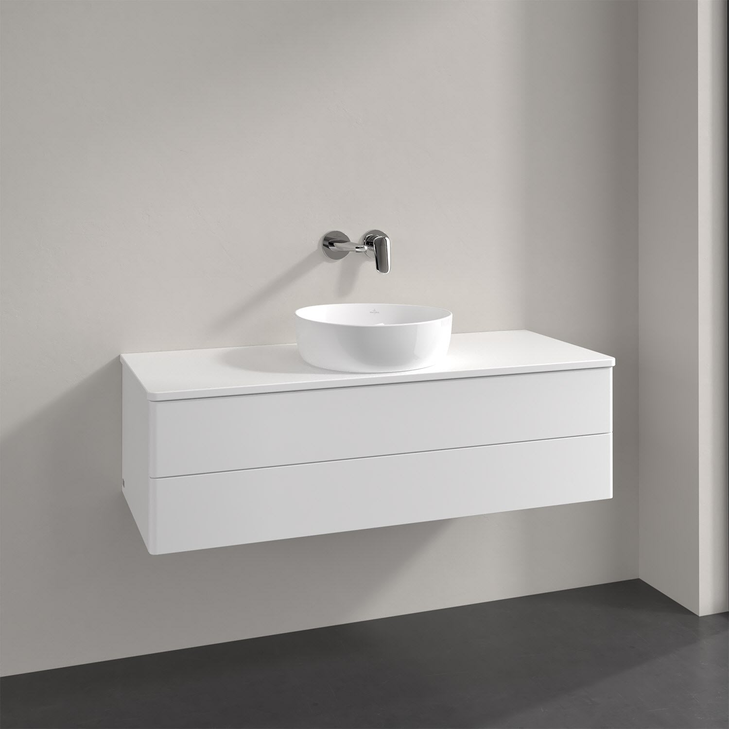 Villeroy & Boch Antao Waschbeckenunterschrank, 120 x 36 cm, 2 Auszüge mit LED-Licht, Front ohne Struktur, mit Hahnloch, für Waschtisch mittig